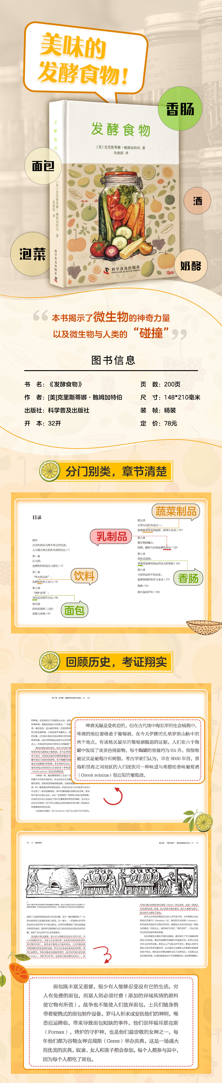 《发酵食物》一书向读者介绍了微生物与人类关系的本质和历史,揭示了微生物学与我们食品系统早期工业化进程之间的碰撞。书中既有引人入胜的真实案例,又有对人类认识、了解、利用微生物历程的梳理回顾与展望,这是一本能全面了解发酵食物及其历史的图书。