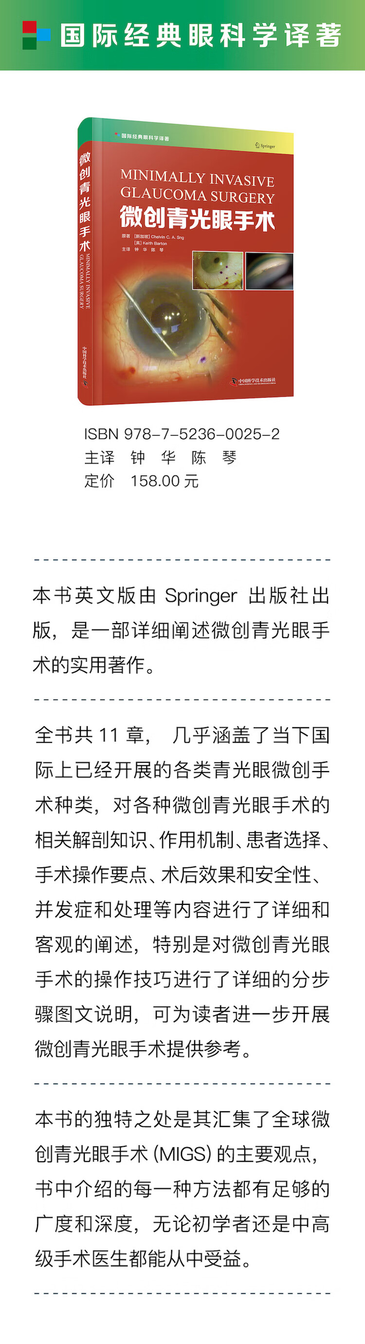 本书英文版由 Springer 出版社出版,是一部详细概述微创青光眼手术的实用著作。全书共11 章,系统阐述了各种微创青光眼手术的设备信息、作用机制、相关的解剖生理要点、适应证、患者选择、手术操作要点、术后并发症、效果和安全性等内容,几乎涵盖了当前世界范围内应用的各种微创青光眼手术方式,包括 iStent 小梁旁路支架、小梁消融术、Hydrus 微支架、XEN 青光眼引流管、PRESERFLO 微型引流器、脉络膜上腔微创青光眼手术装置、睫状体手术等,并在专门的章节对微创青光眼手术应用的争议与全球化情况进行了探讨。本书内容全面,重点突出,图文并茂,非常适合广大眼科医师及青光眼相关研究人员阅读参考。