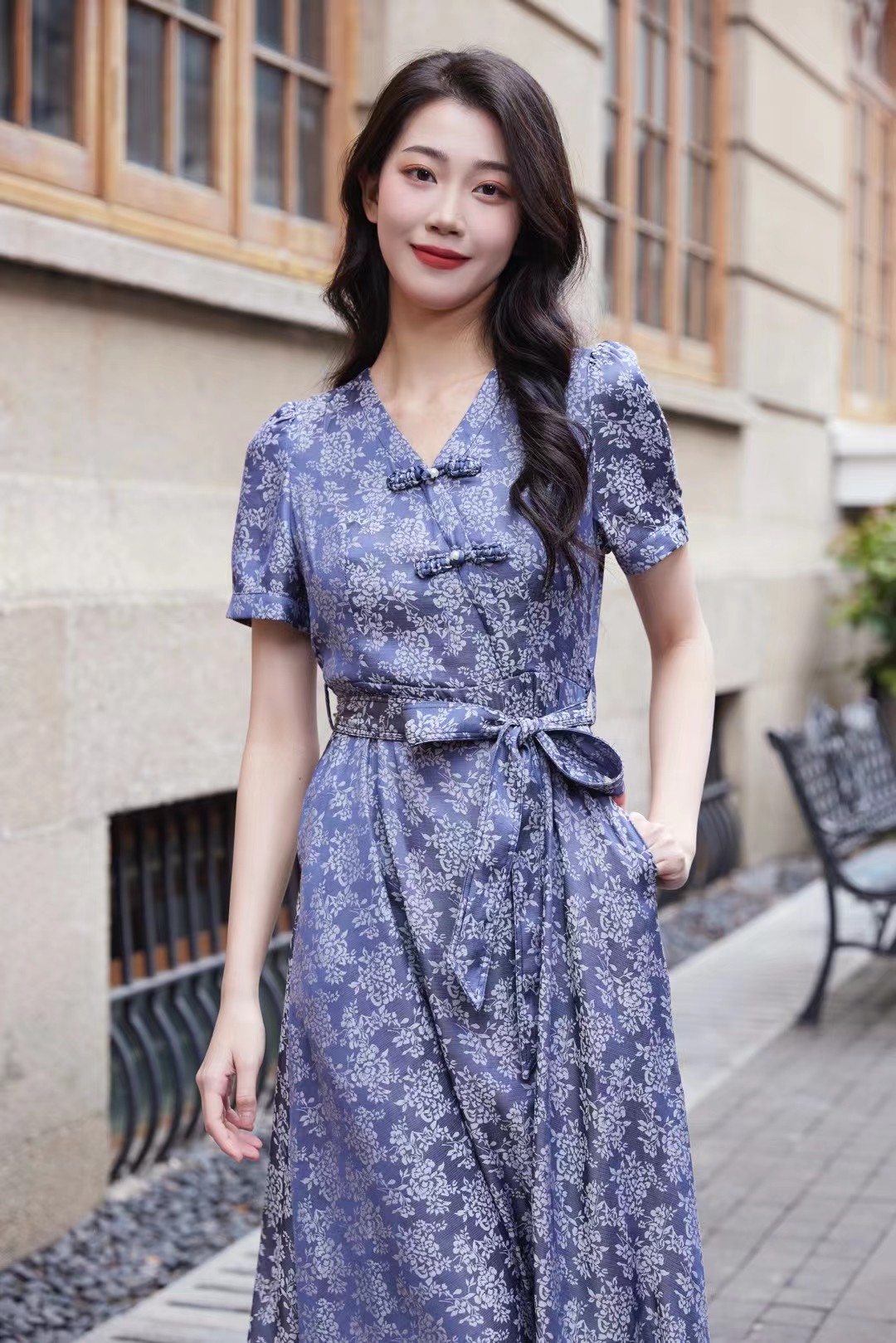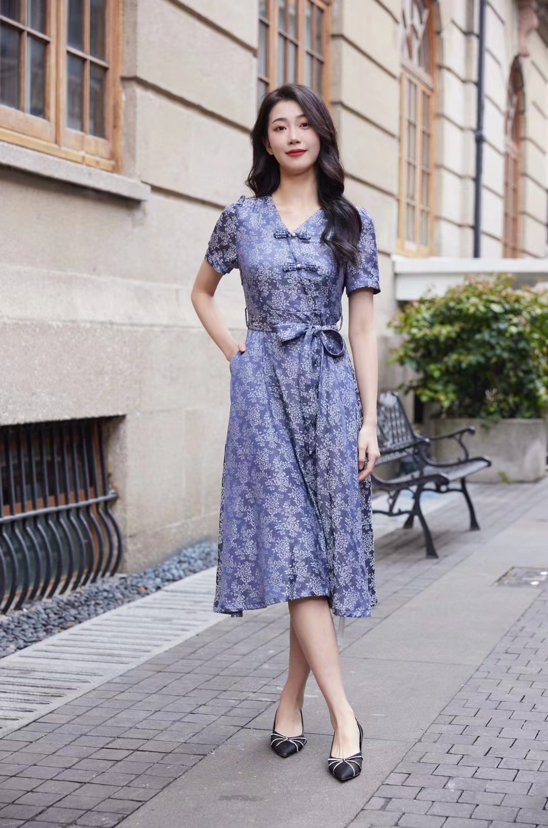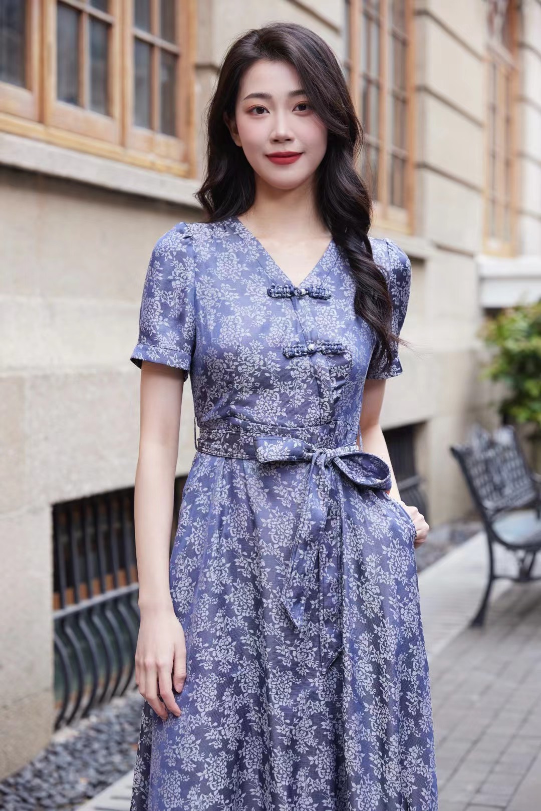 HJ1S79_菘蓝色_连衣裙_四季_气质优雅新中式V领盘扣碎花收腰系带长裙_高级女装_BERNIEELEN 伯妮斯茵