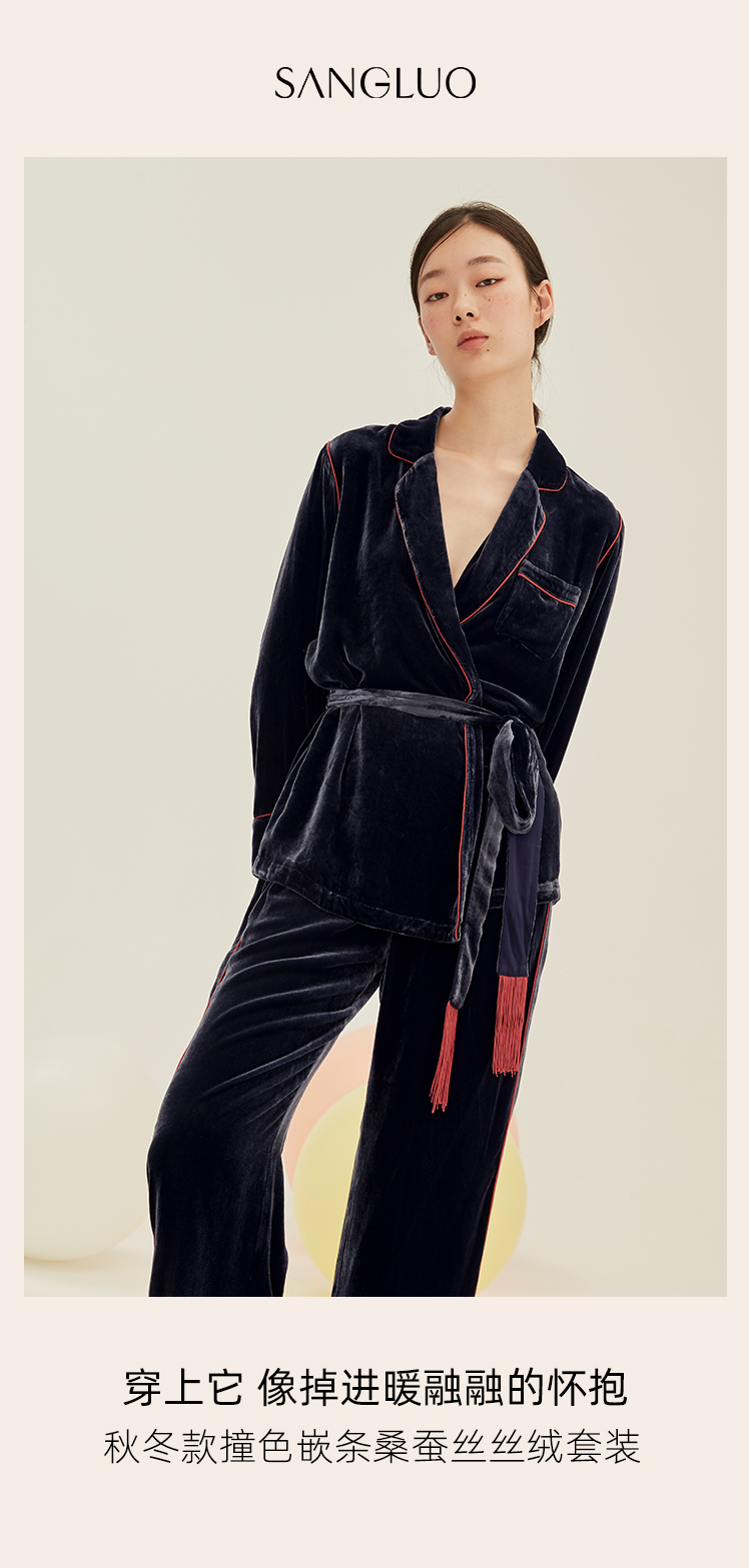 SANGLUO桑蚕丝丝绒系带式纯色复古睡衣保暖家居服套装春可外穿