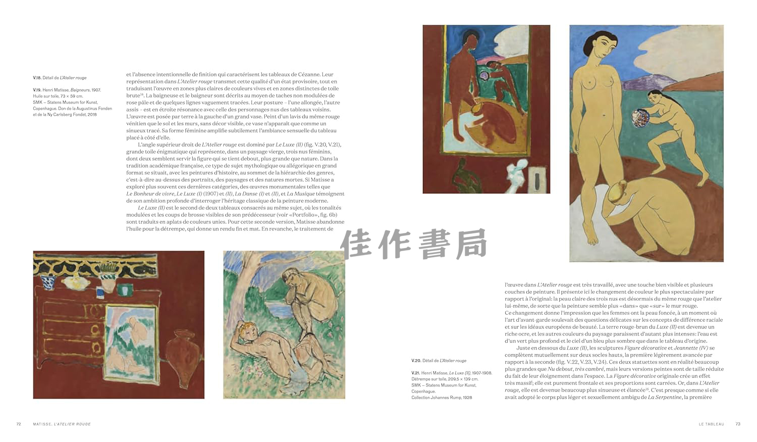《马蒂斯,红色工作室》一书为配合路易威登基金会在巴黎举办的展览而用法语出版,书中收录了纽约现代艺术博物馆绘画与雕塑首席策展人安·特姆金(玛丽 - 若泽和亨利·克拉维斯捐赠席位)以及丹麦国立美术馆研究员兼首席馆长多特·阿格森的分析文章。她们共同追溯了马蒂斯这幅画作的历程,从最初的定制到抵达纽约,以及其展览历史和历任所有者。通过她们深入的研究和细致的解读,改变了我们对20世纪这一关键艺术作品的理解。