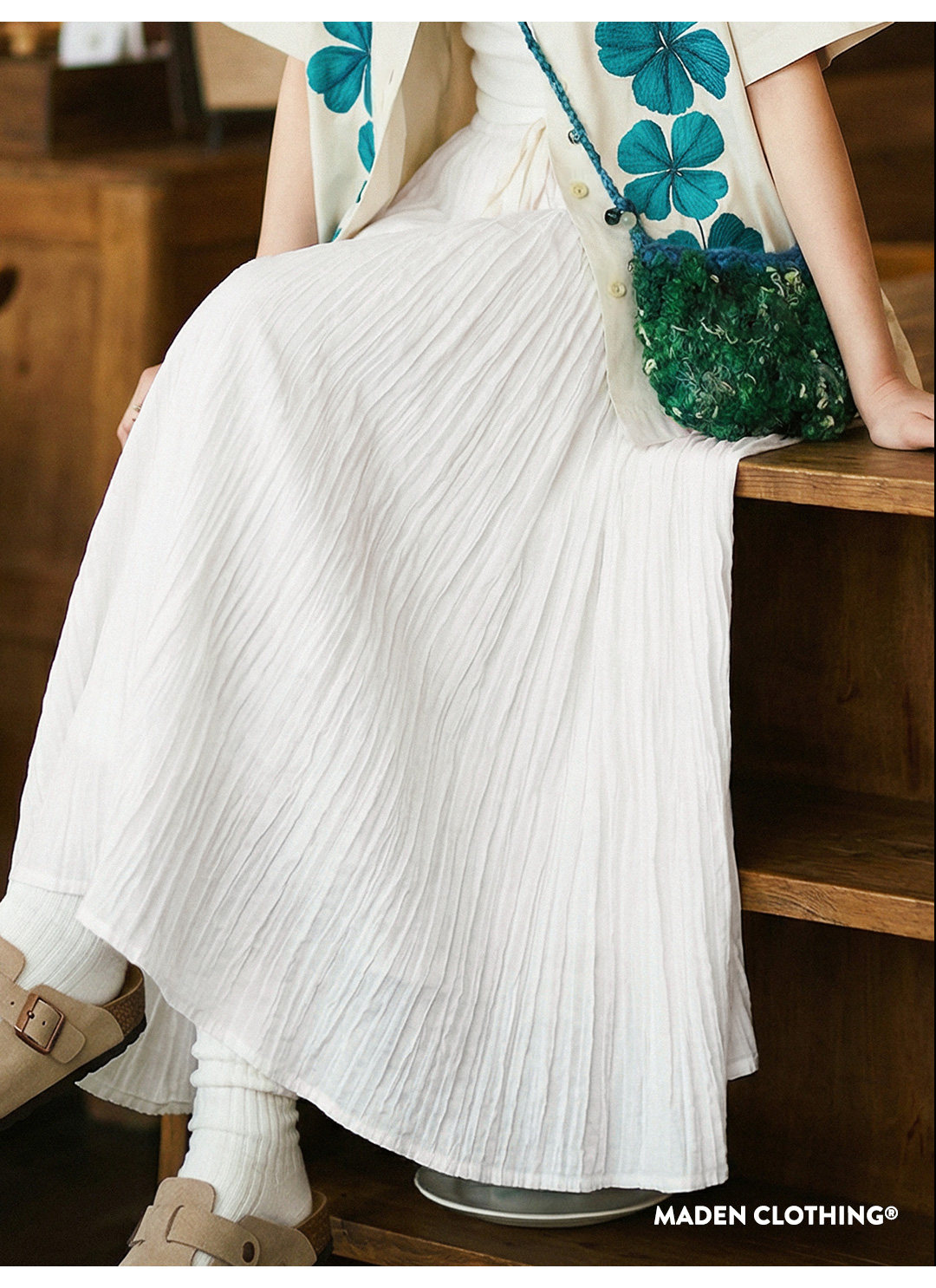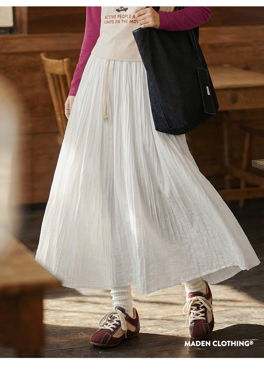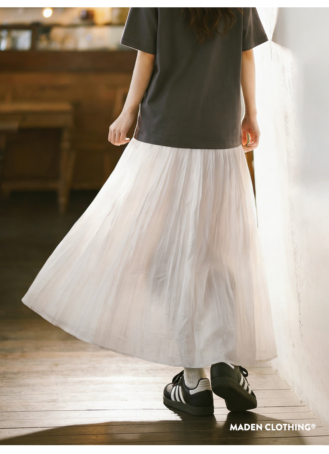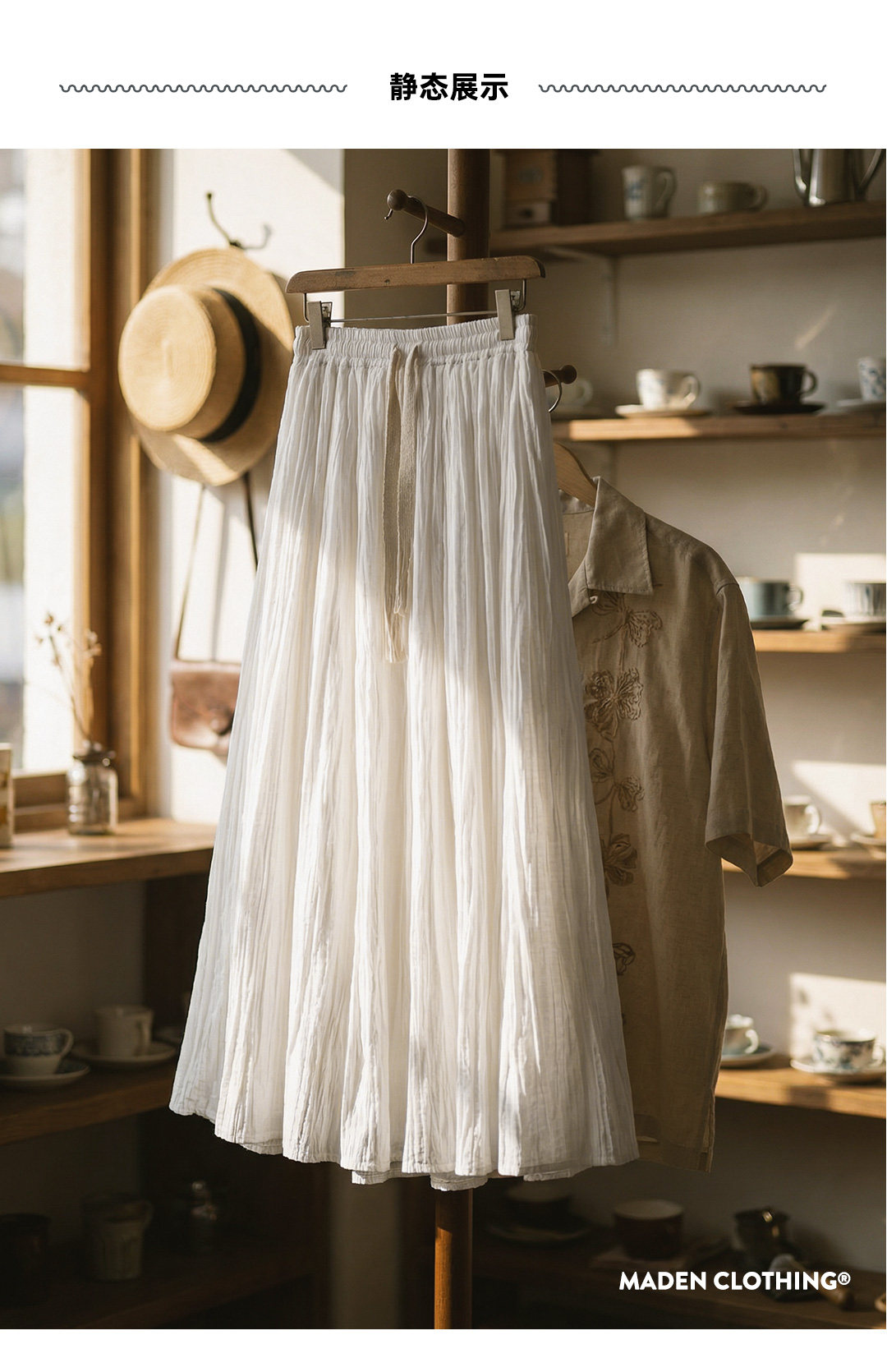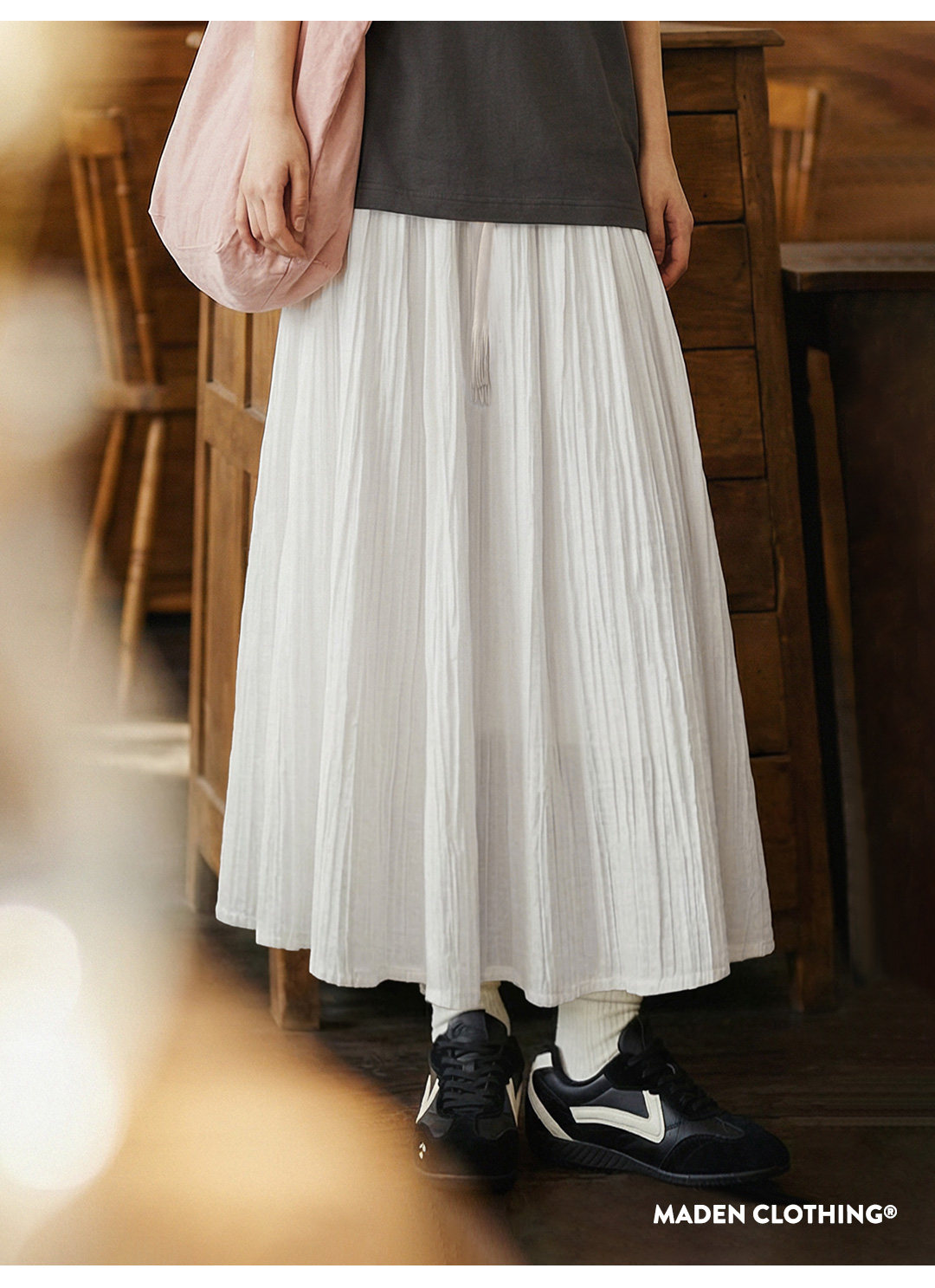 马登白色长款A字纱裙子压百褶皱肌理垂坠感高腰显瘦半身中伞裙女