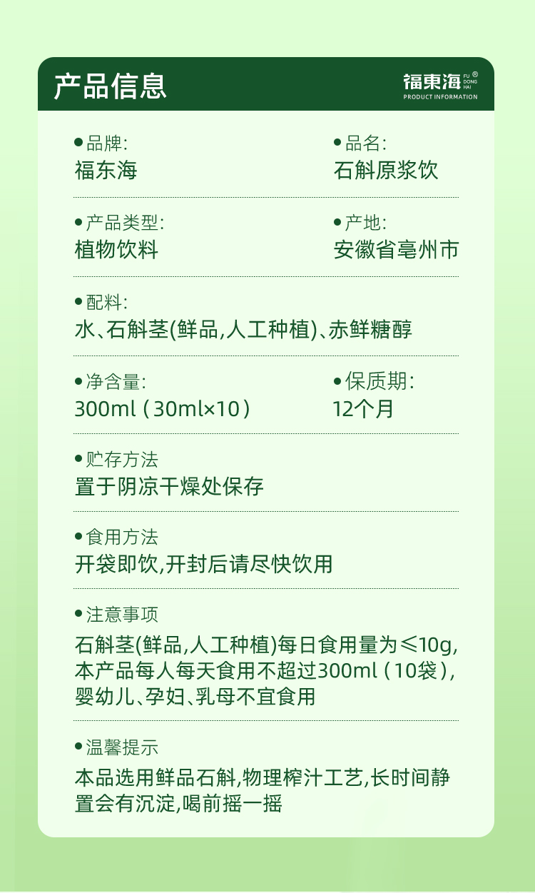 福东海 石斛原浆300ml 袋装便携 鲜榨萃取饮料饮品原液枫斗石斛茶榨汁营养送父母长辈滋补品(30ml*10袋)