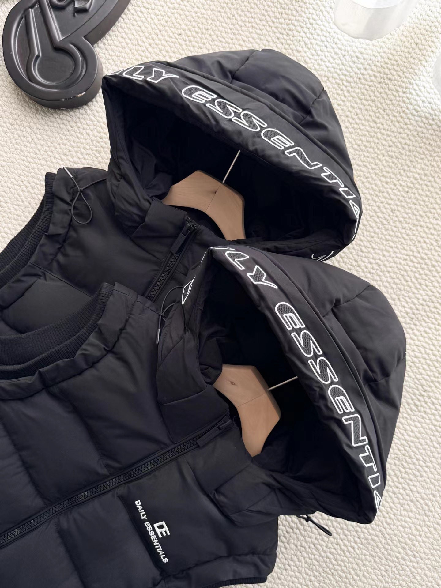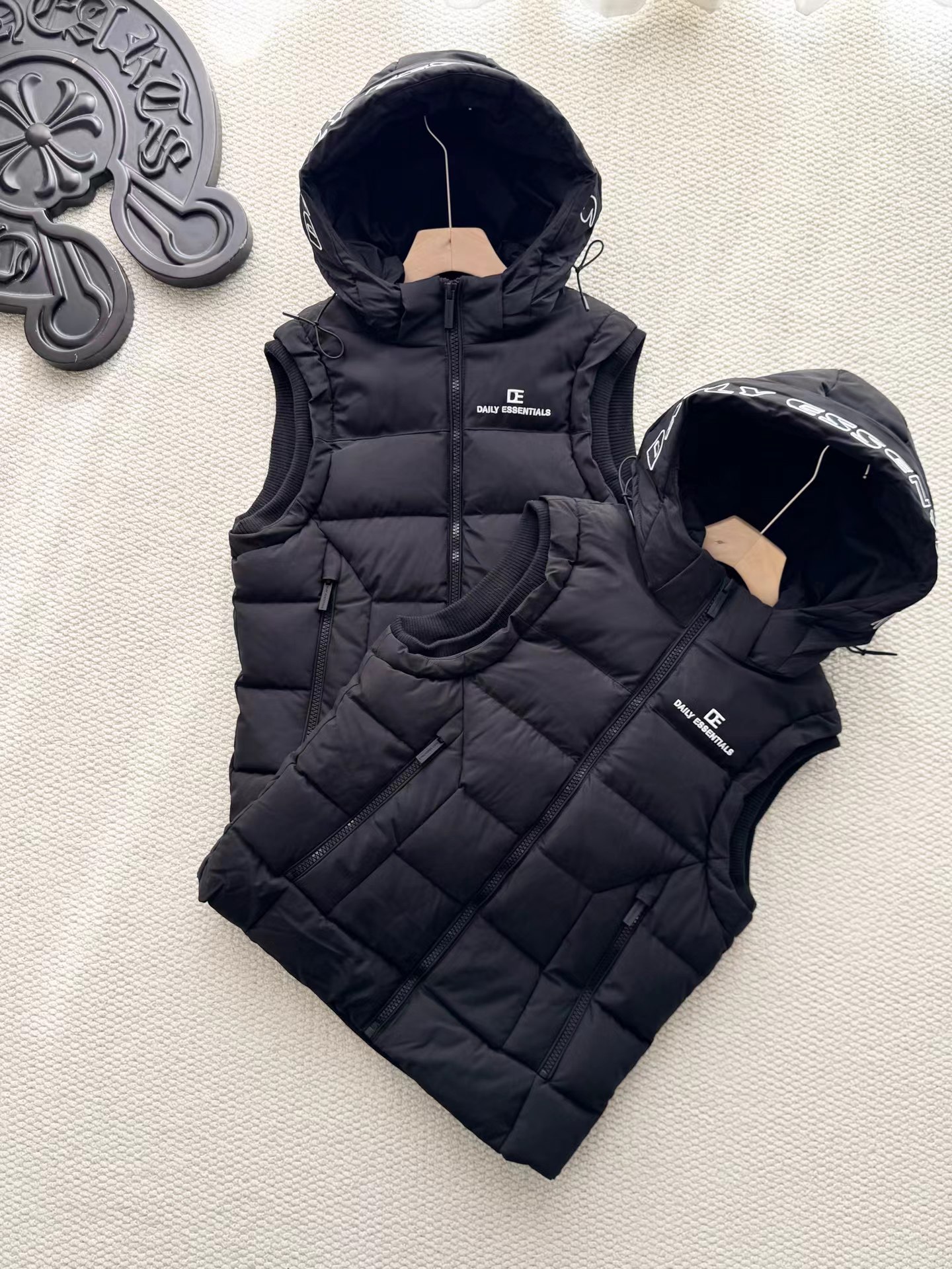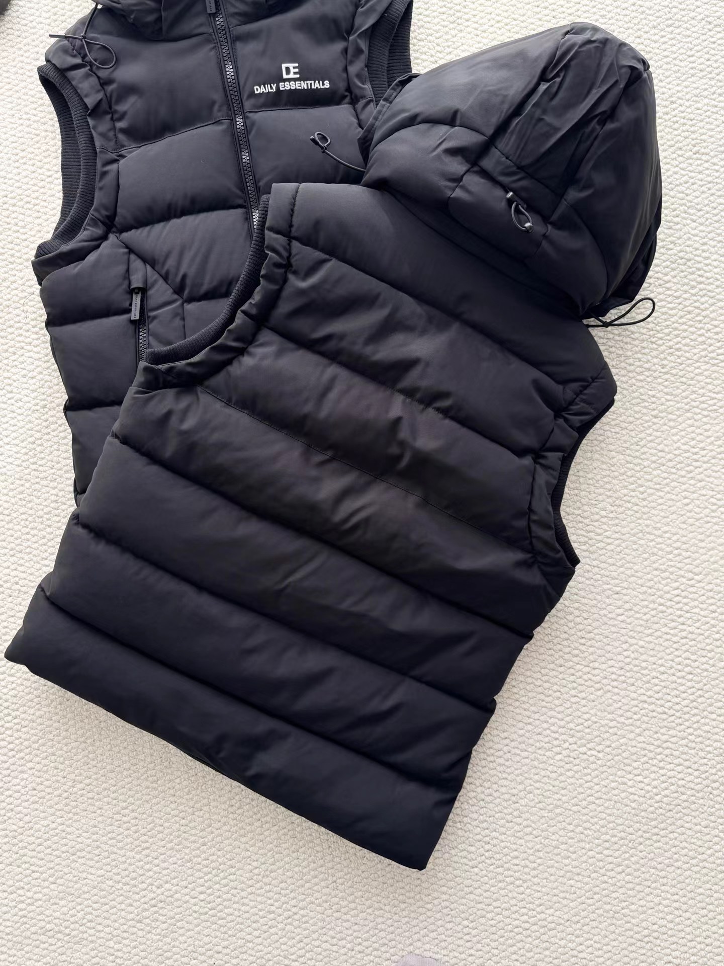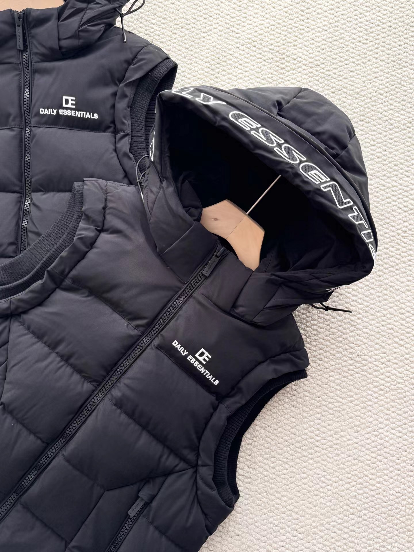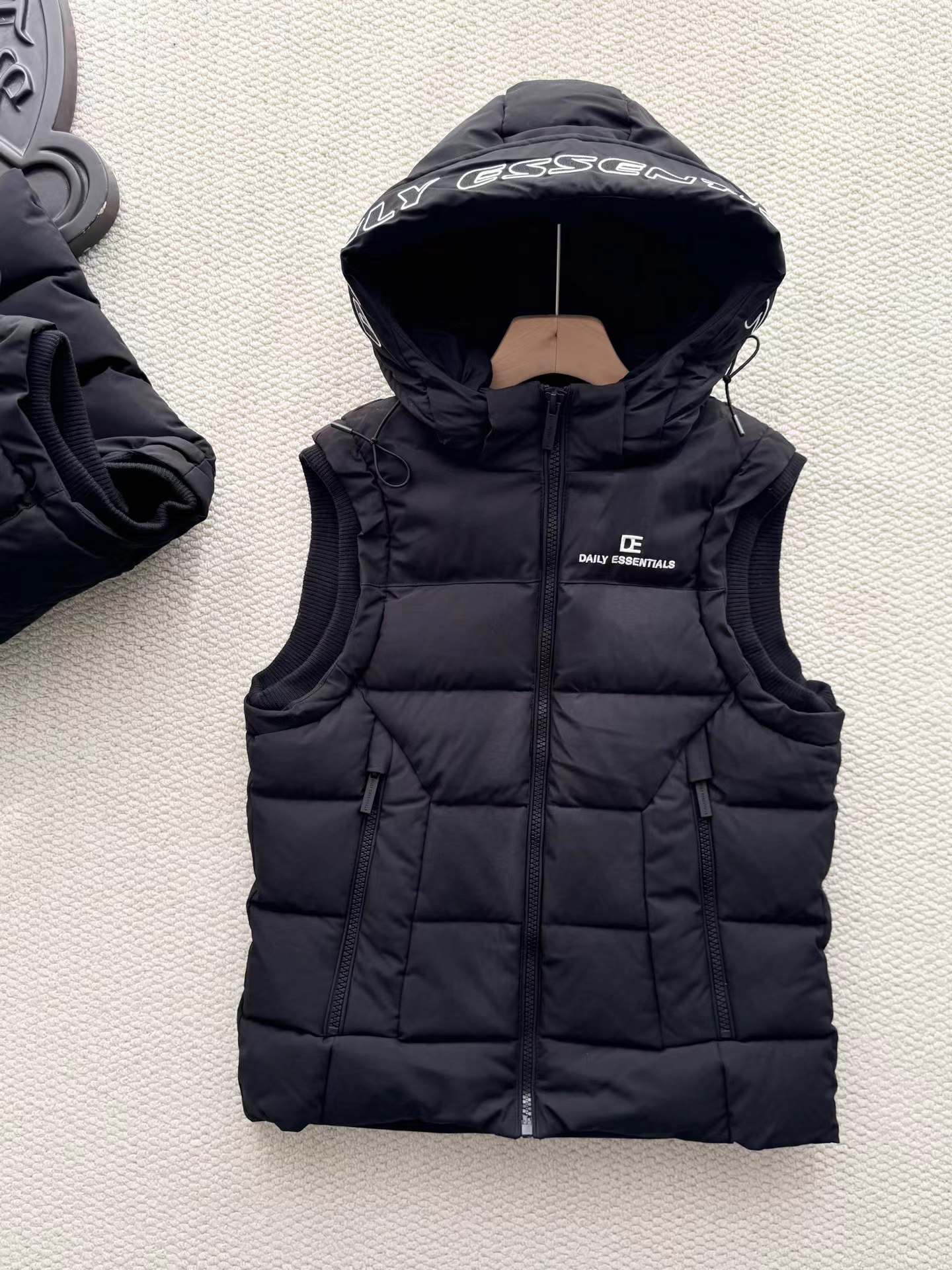 黑色羽绒马甲,拉链细节和整体版型与之前的马甲一致,属于该品牌的冬季保暖单品系列,适合日常穿搭,为穿着者在寒冷天气提供温暖,同时通过品牌标识和设计展现时尚感。设计特征:带有连帽设计,帽檐上有白色的品牌字母刺绣;正面有拉链开合,拉链上也印有品牌名称;前胸位置有品牌的标志和名称标识;整体采用绗缝工艺,有多个拉链口袋,兼具实用性与时尚感。场景推测:从其陈列环境(周围有其他衣物和包装)来看,应该是在服装店铺的货架上,用于冬季保暖穿搭,适合搭配卫衣、毛衣等内搭,在日常出行、休闲活动中穿着。