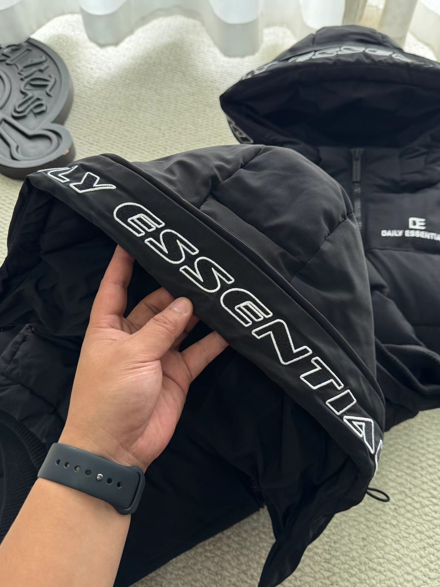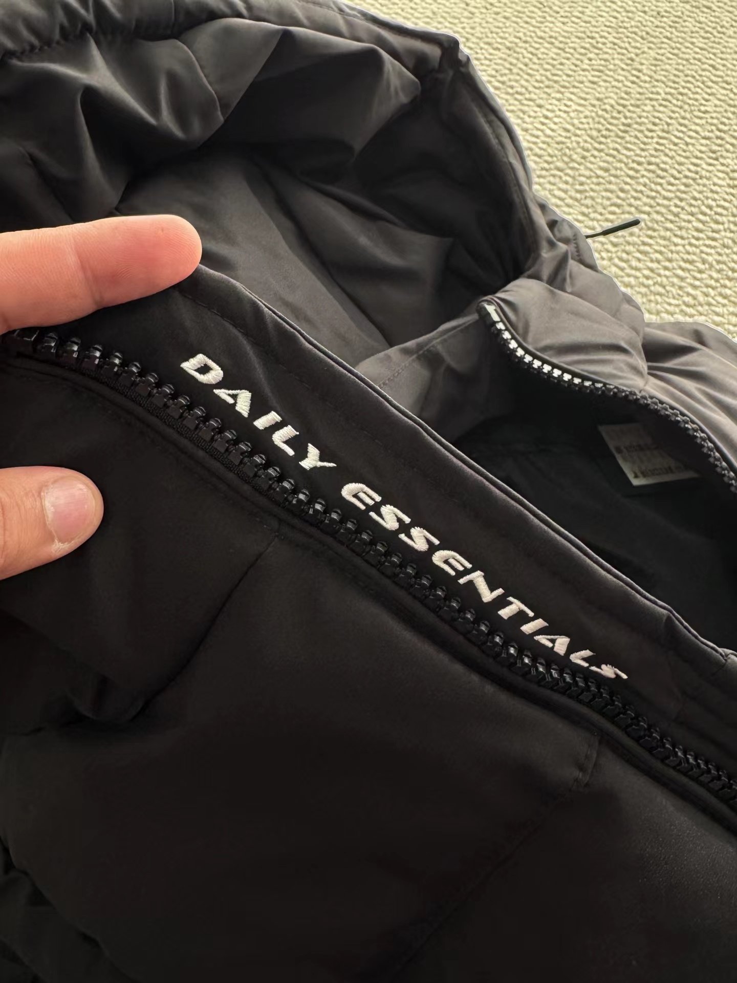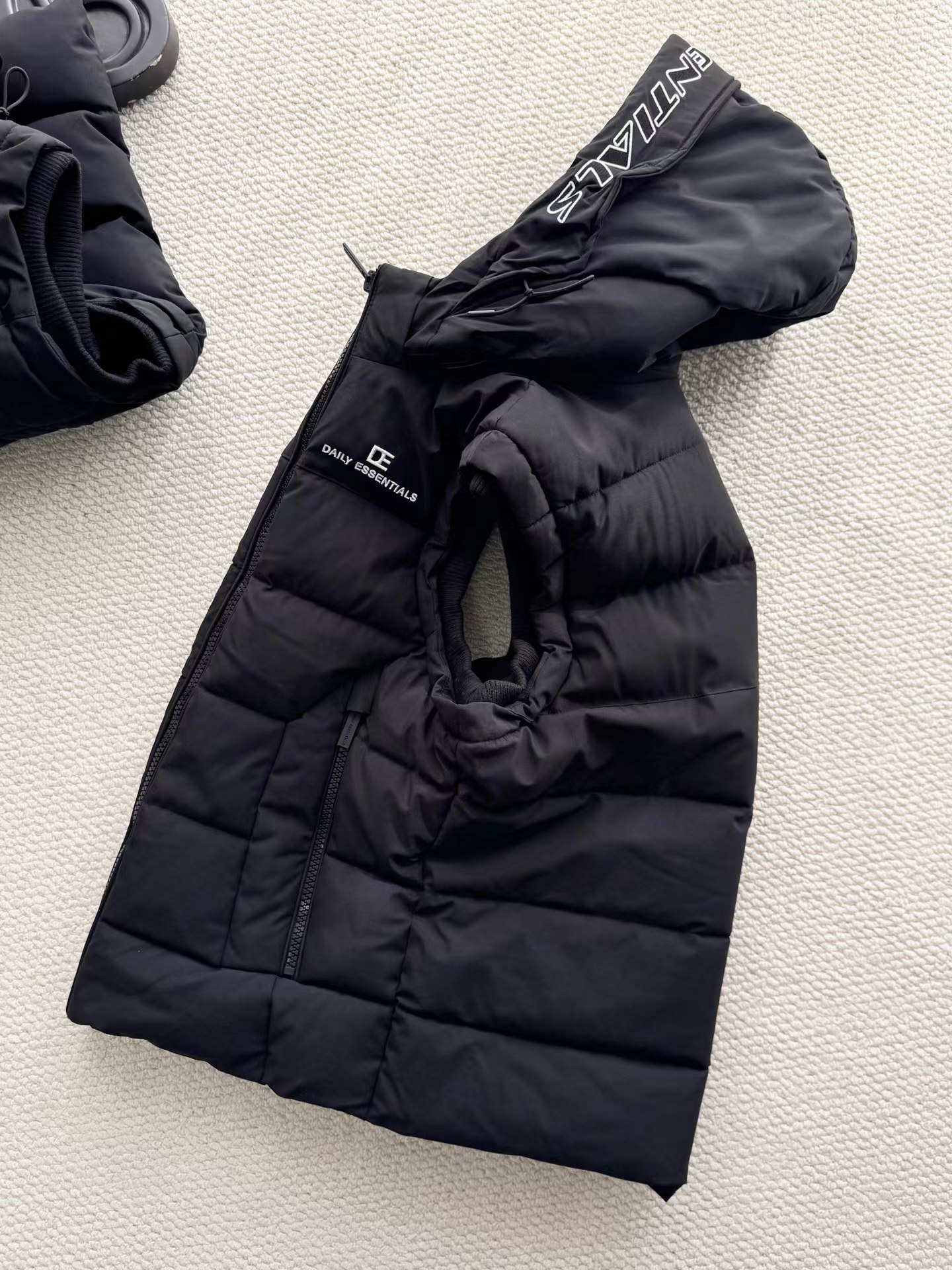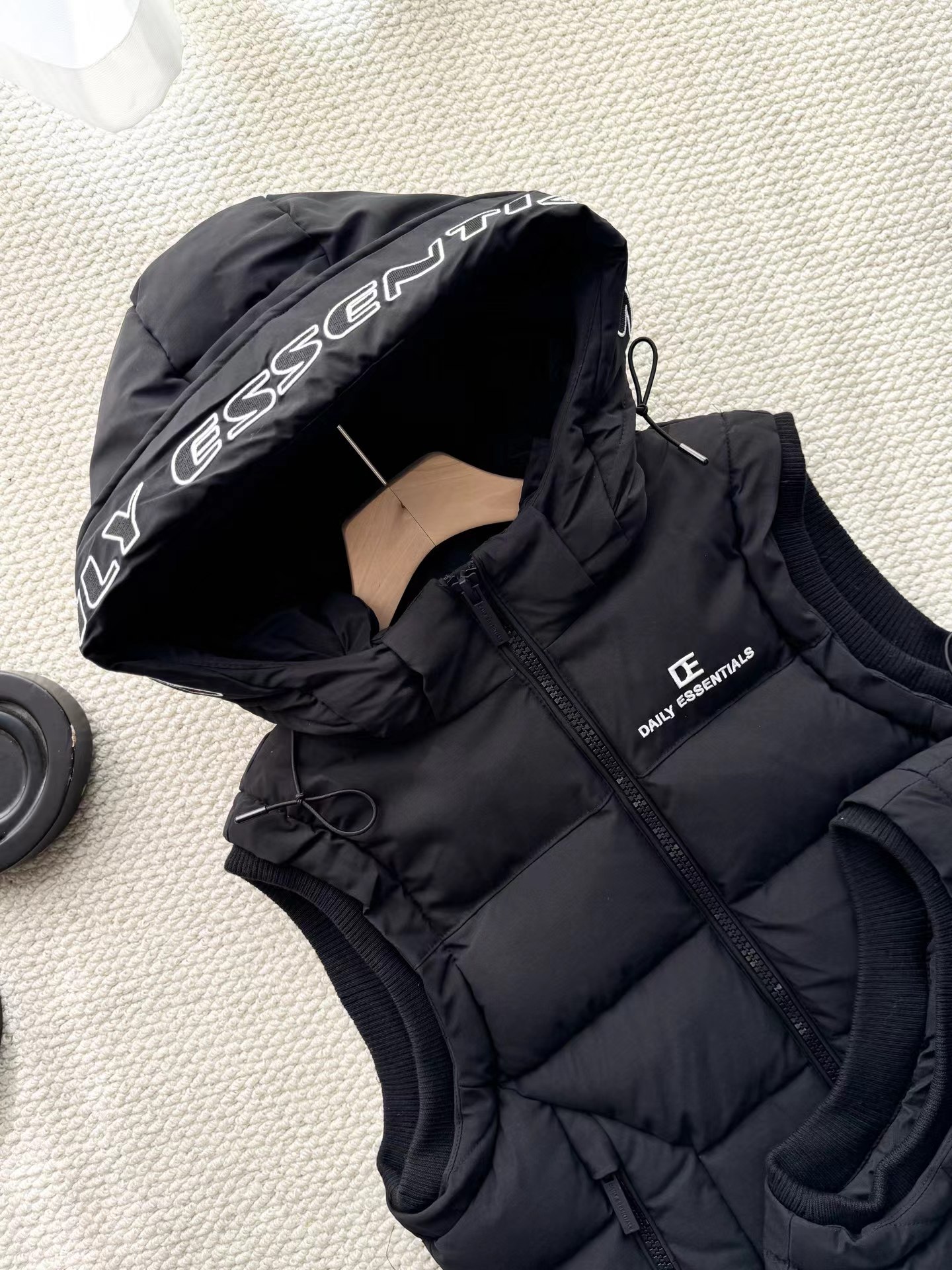 黑色羽绒马甲,拉链细节和整体版型与之前的马甲一致,属于该品牌的冬季保暖单品系列,适合日常穿搭,为穿着者在寒冷天气提供温暖,同时通过品牌标识和设计展现时尚感。设计特征:带有连帽设计,帽檐上有白色的品牌字母刺绣;正面有拉链开合,拉链上也印有品牌名称;前胸位置有品牌的标志和名称标识;整体采用绗缝工艺,有多个拉链口袋,兼具实用性与时尚感。场景推测:从其陈列环境(周围有其他衣物和包装)来看,应该是在服装店铺的货架上,用于冬季保暖穿搭,适合搭配卫衣、毛衣等内搭,在日常出行、休闲活动中穿着。