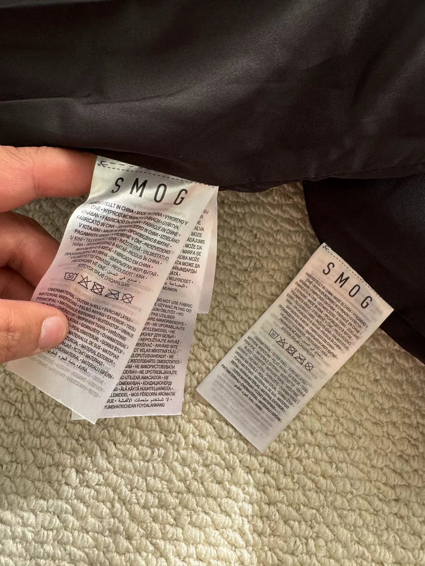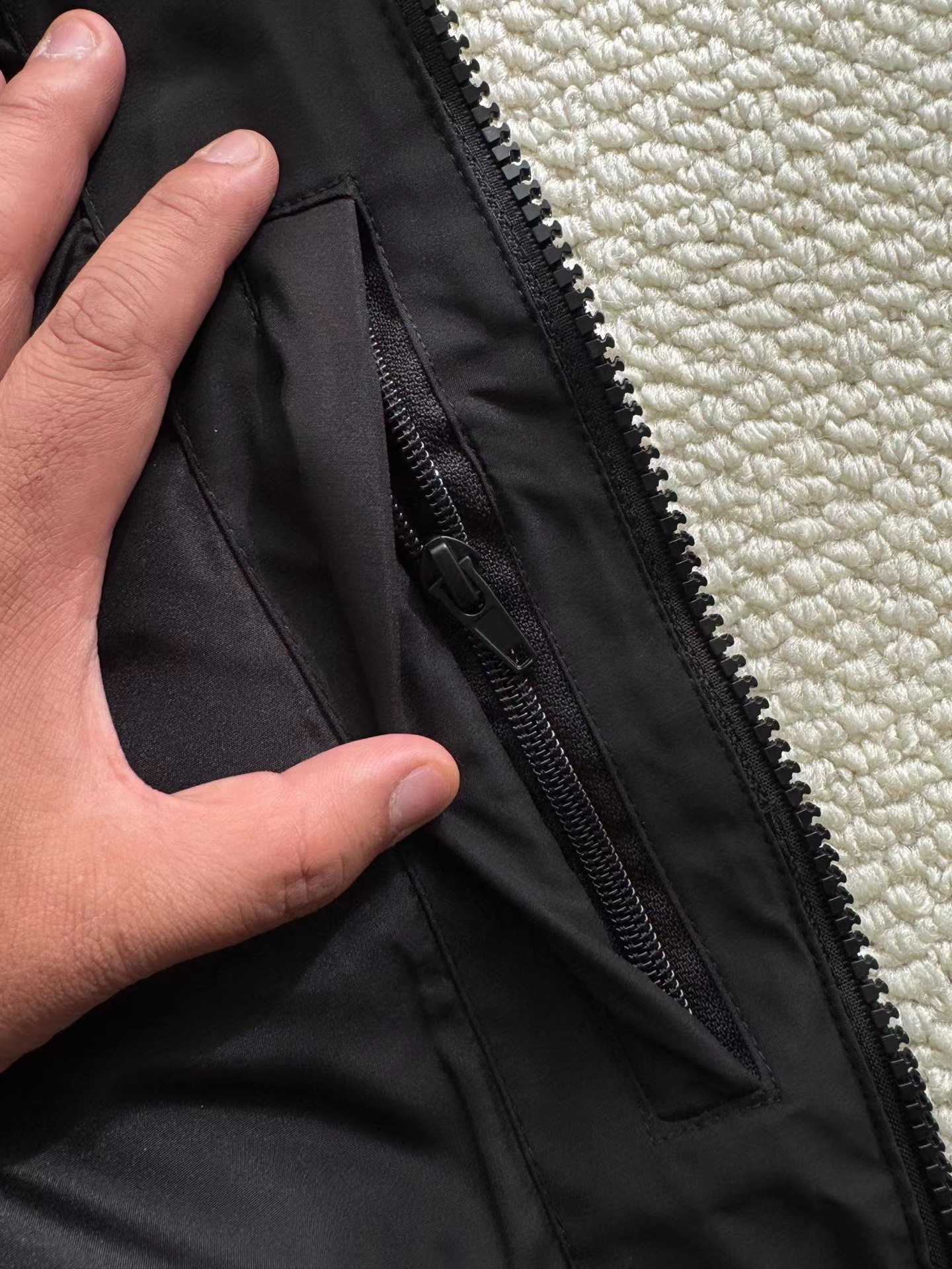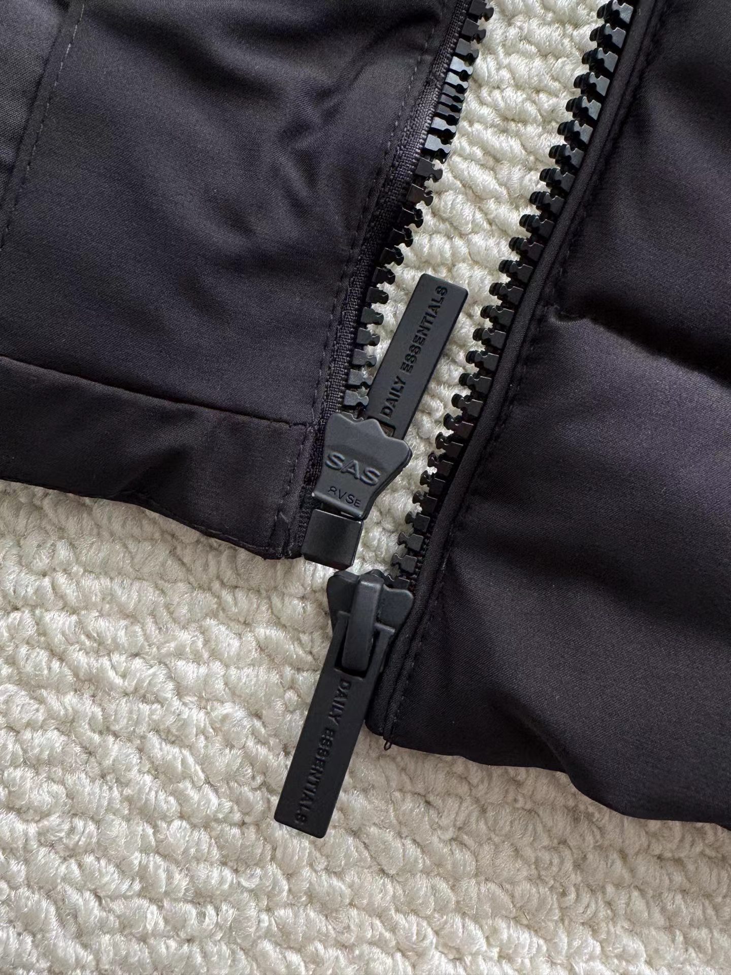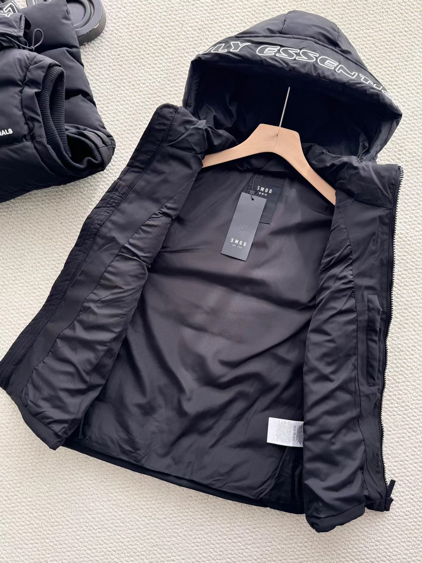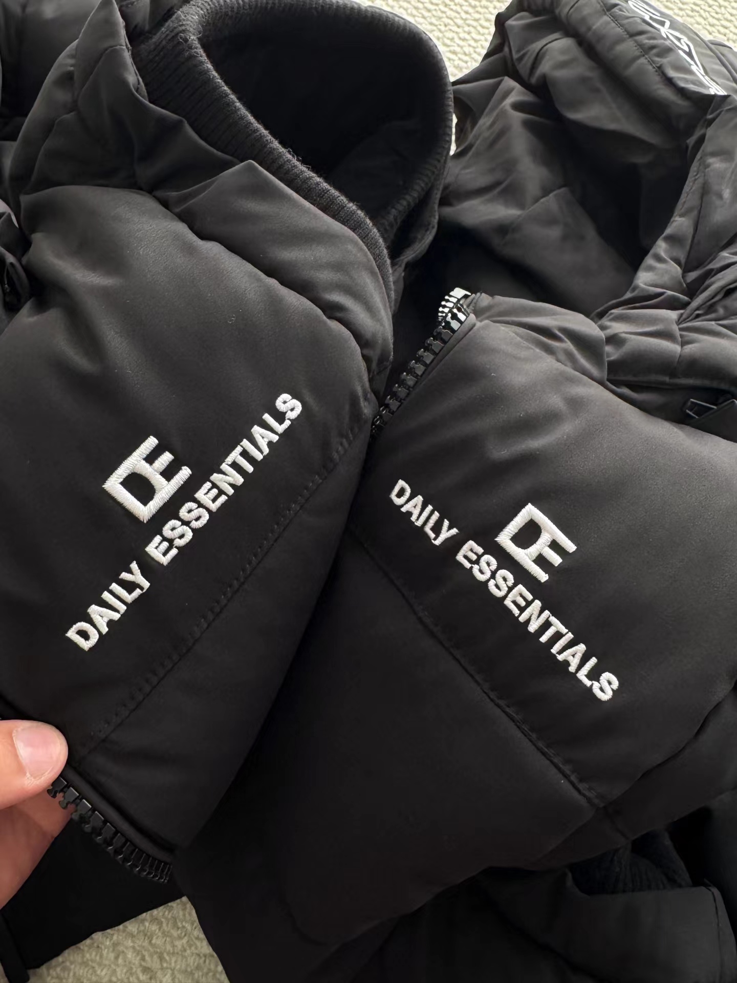 黑色羽绒马甲,拉链细节和整体版型与之前的马甲一致,属于该品牌的冬季保暖单品系列,适合日常穿搭,为穿着者在寒冷天气提供温暖,同时通过品牌标识和设计展现时尚感。设计特征:带有连帽设计,帽檐上有白色的品牌字母刺绣;正面有拉链开合,拉链上也印有品牌名称;前胸位置有品牌的标志和名称标识;整体采用绗缝工艺,有多个拉链口袋,兼具实用性与时尚感。场景推测:从其陈列环境(周围有其他衣物和包装)来看,应该是在服装店铺的货架上,用于冬季保暖穿搭,适合搭配卫衣、毛衣等内搭,在日常出行、休闲活动中穿着。