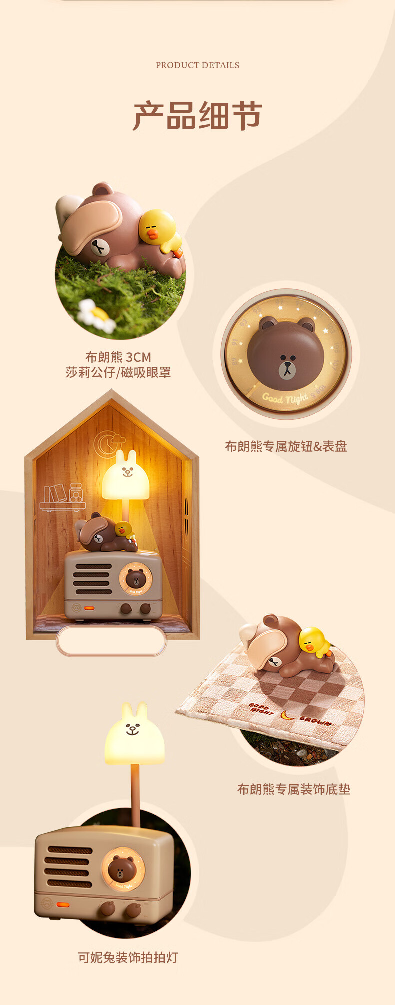 内含:特别版小王子OTR*1、布朗熊*1、可妮兔拍拍灯*1、棋盘格地垫*1、典藏木箱*1、信封*1、卡他*1、主题卡纸*1、TYPE-C充电线*1、AUX音频线*1、说明书*1