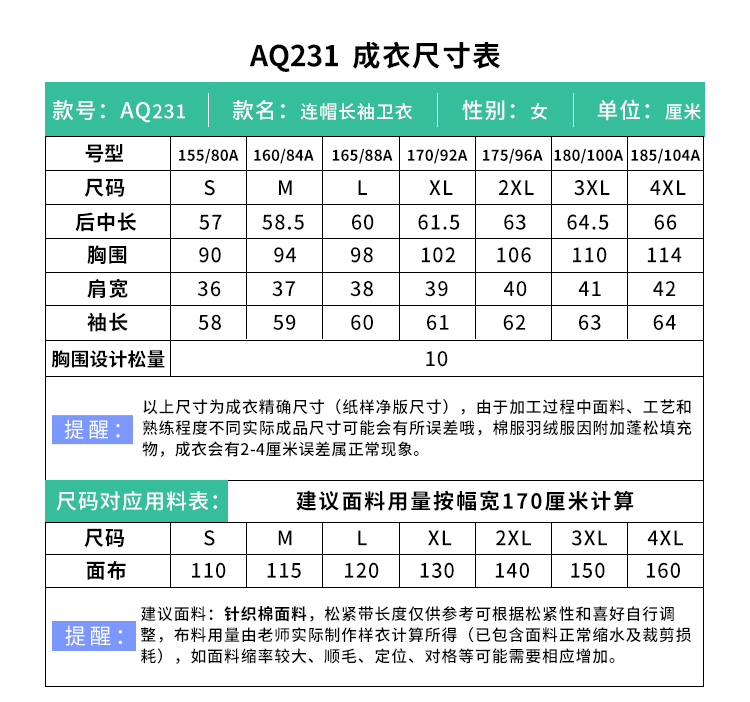 裁缝学苑AQ231连帽套头长袖T恤纸样女装暖阳绒卫衣打版上衣版型