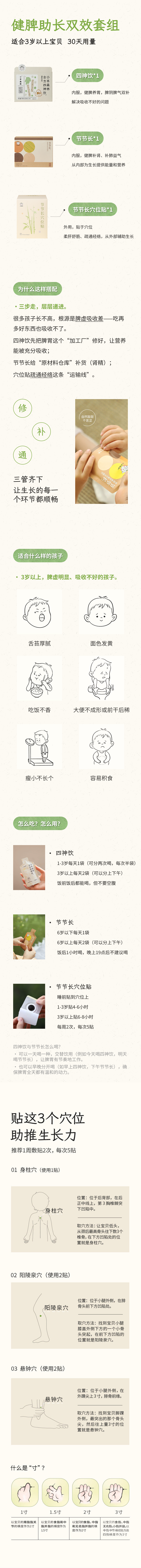 健脾助长双效组:节节长*1+节节长穴位贴*2+四神饮*1加买赠四神饮小盒*2和正气锦囊(实物)【下单即赠价值299元线上长高课,联系养护顾问领取】
