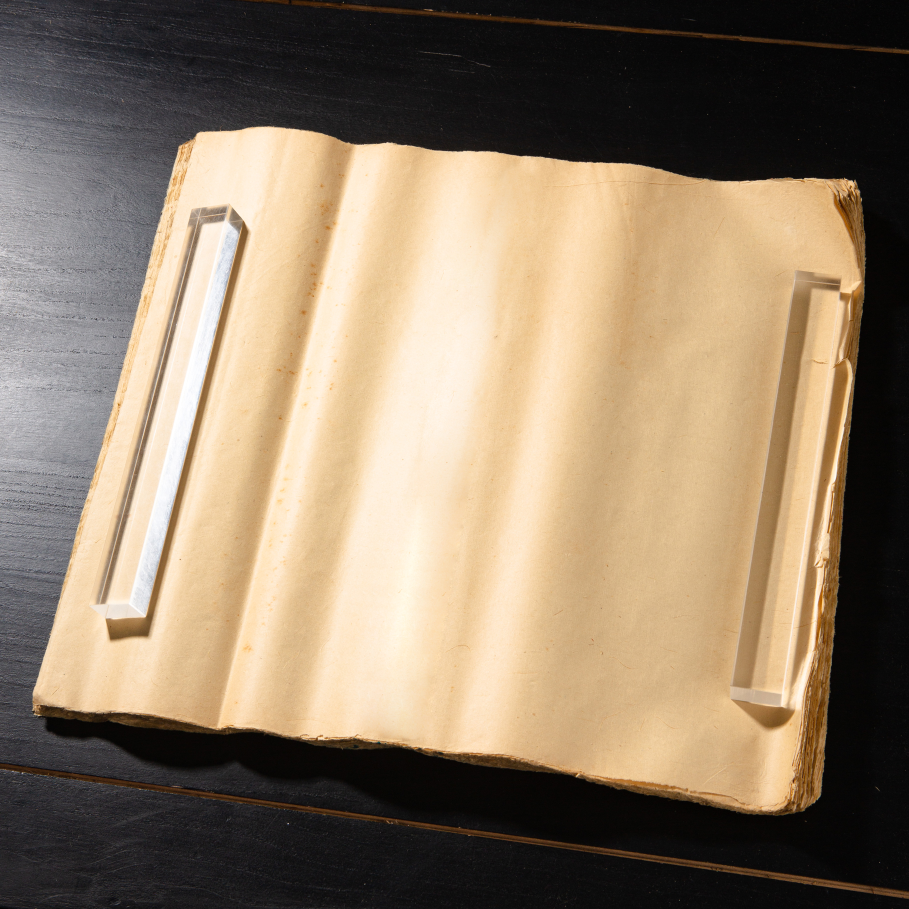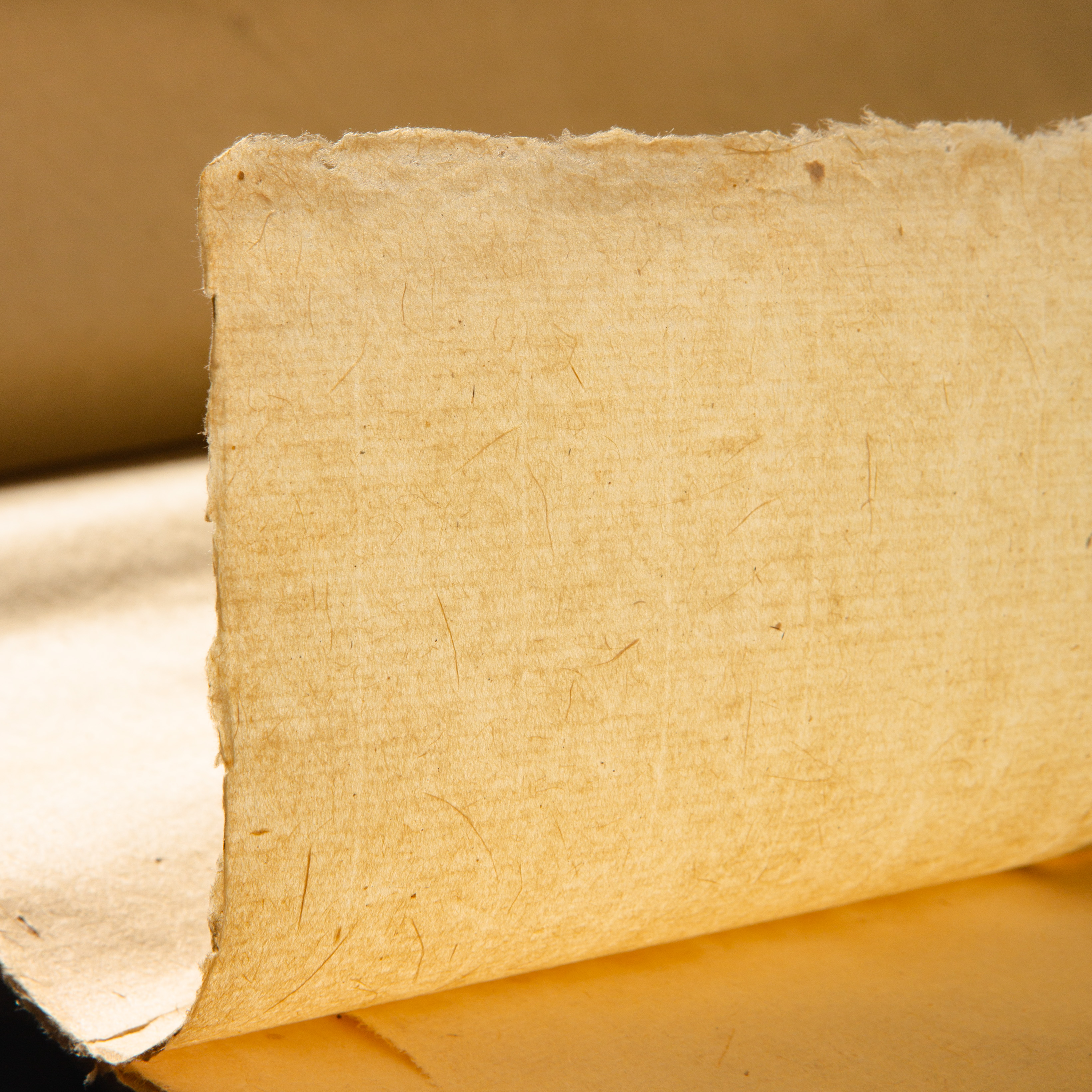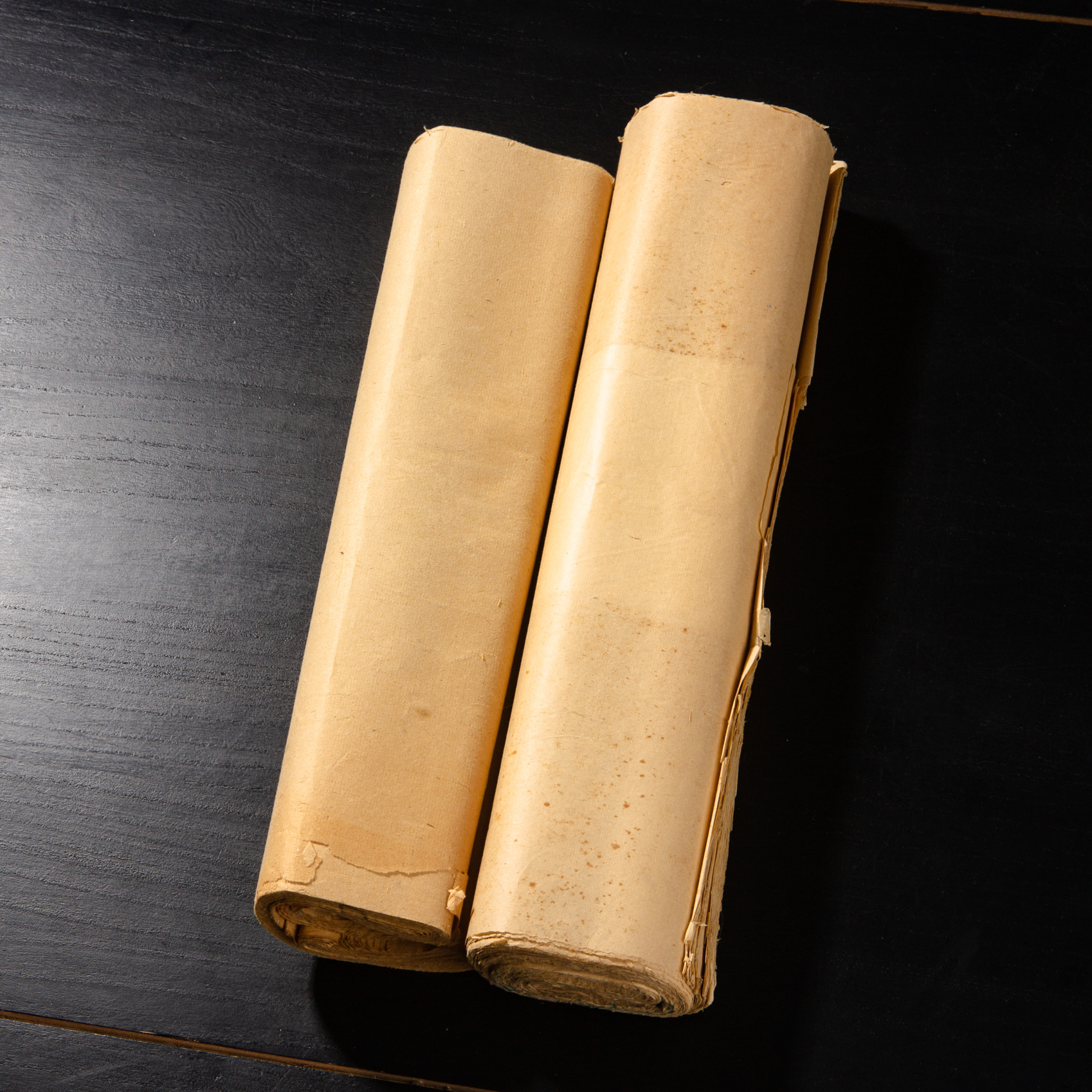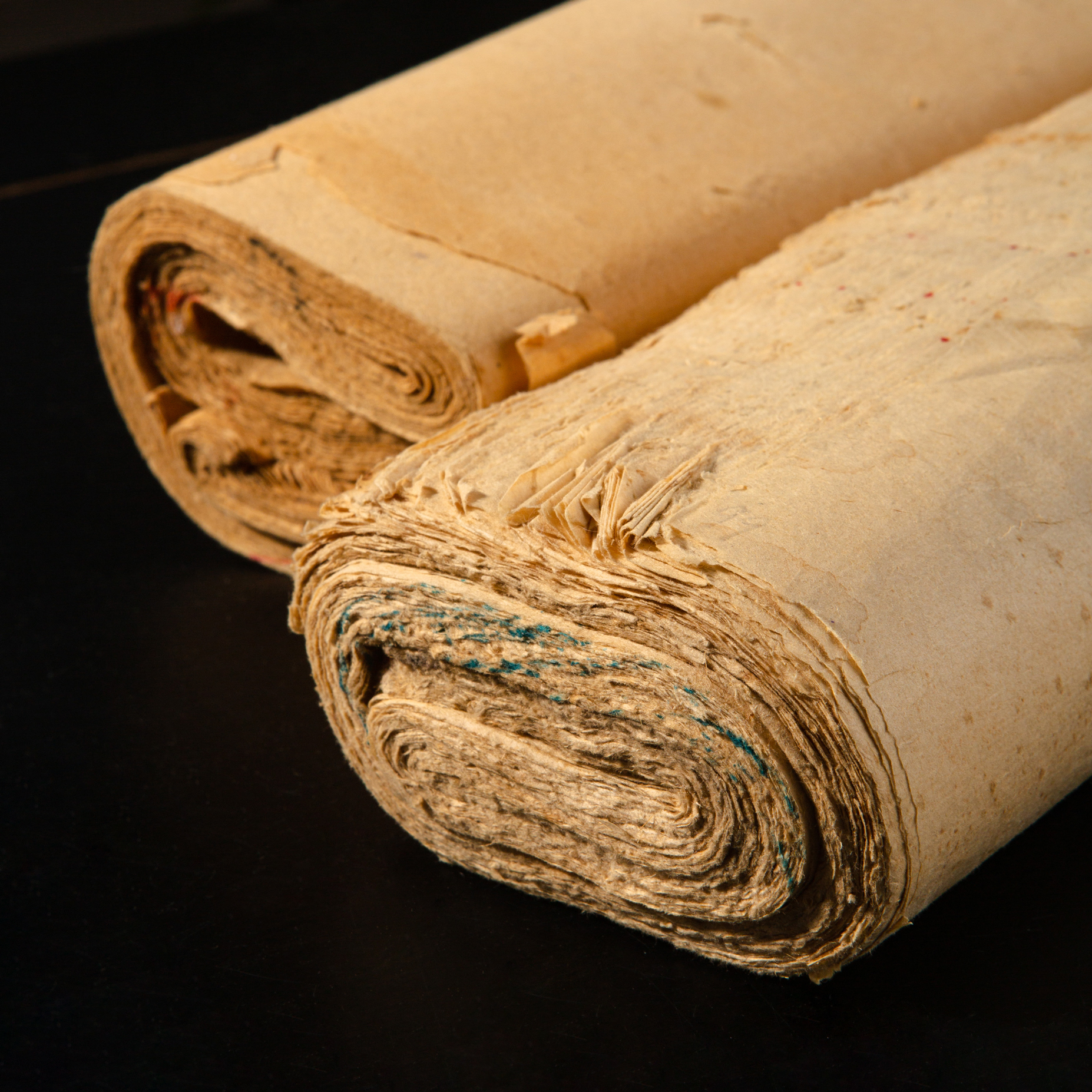 50-60年代合作社生产老竹纸,两卷共163张,此批纸均为古法手工所制,纸质柔软,颜色古朴,帘纹清晰,老纸火气已完全尽失,宜书宜画。
