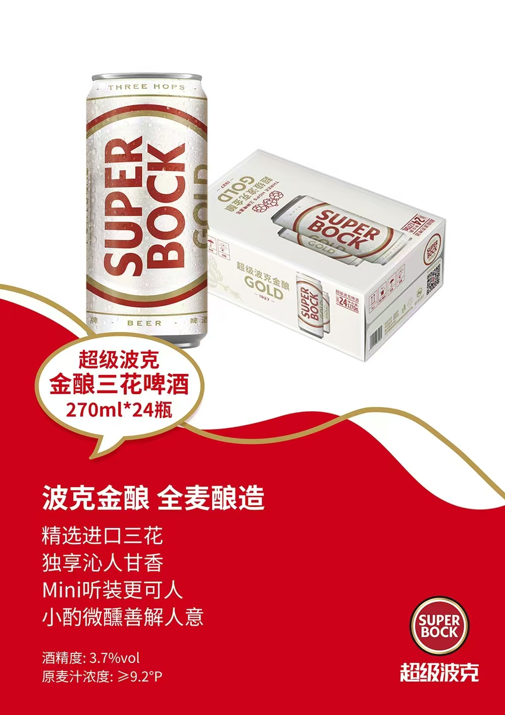 【临期特价】超级波克金酿三花啤酒 3.7%vol 270ml*48罐