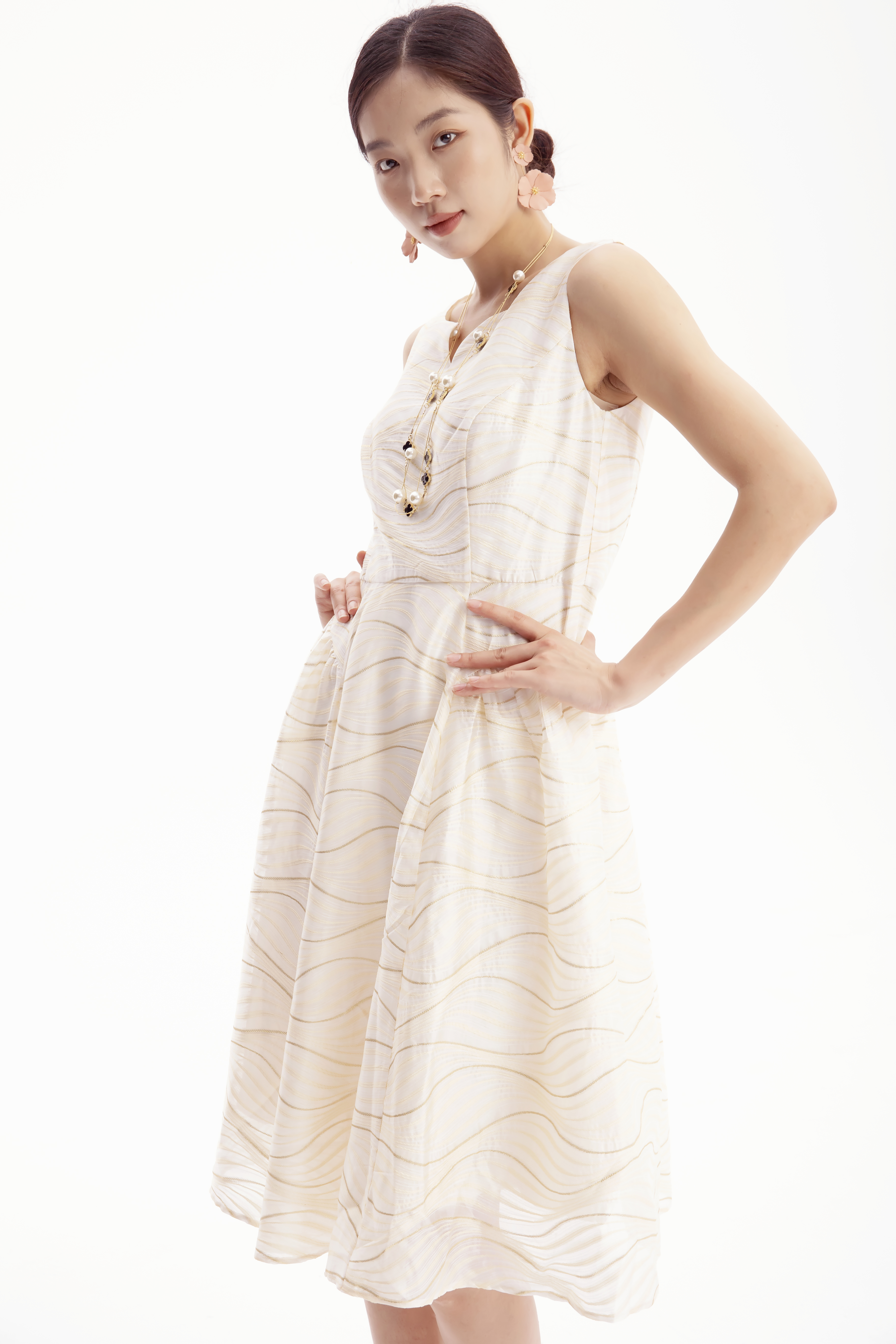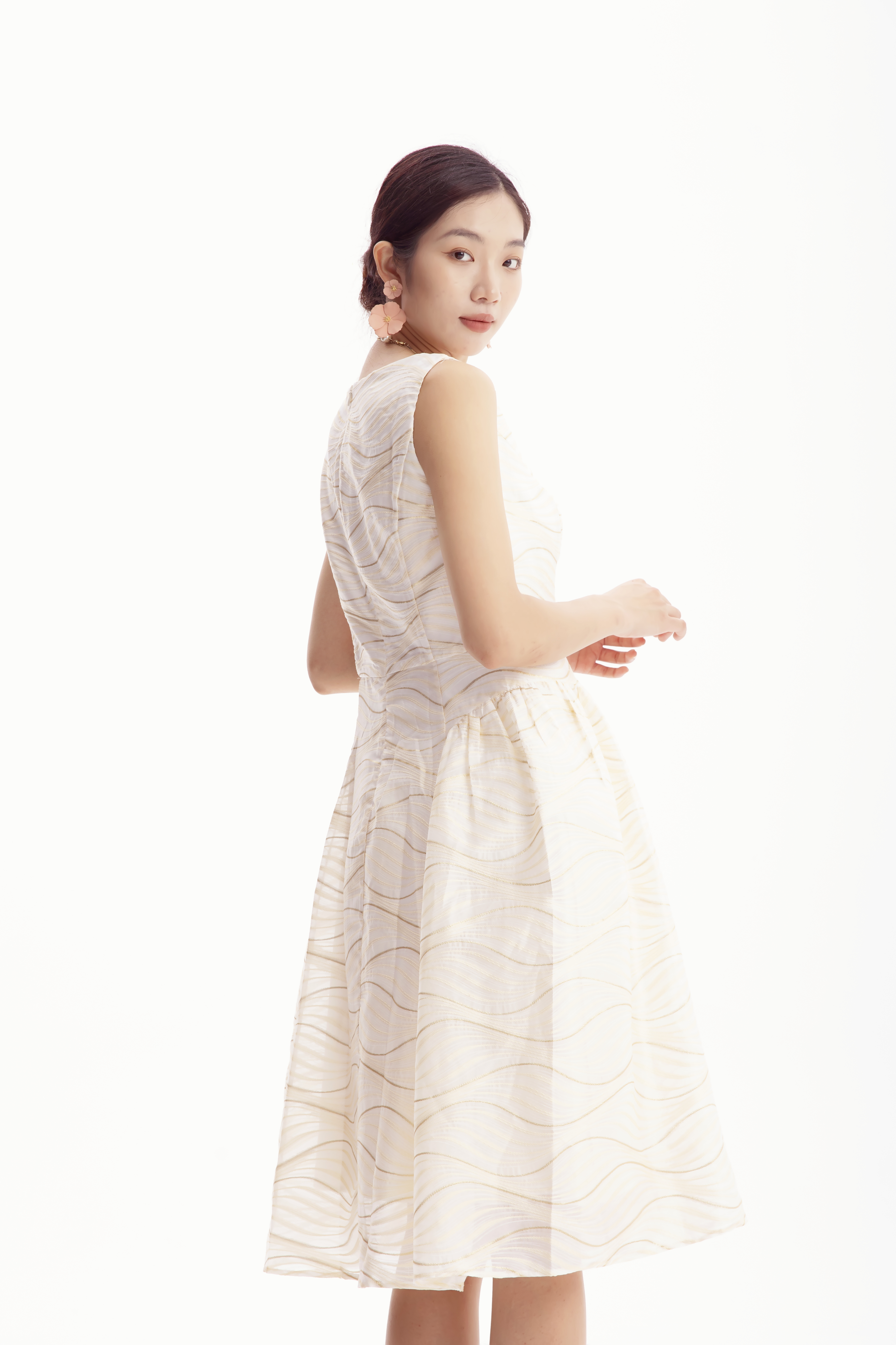 HJ2S66_玉色_连衣裙_四季_优雅复古水波纹金线提花 V 领无袖收腰显瘦中裙_高级女装_BERNIEELEN 伯妮斯茵