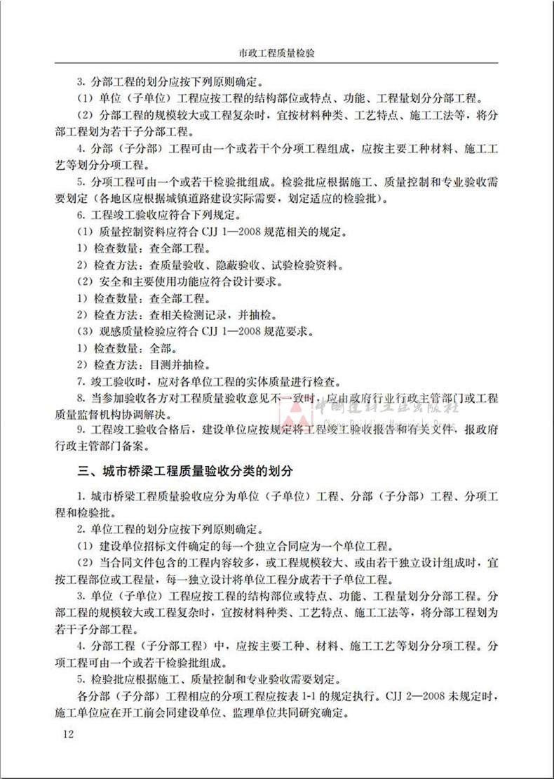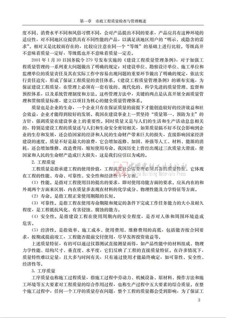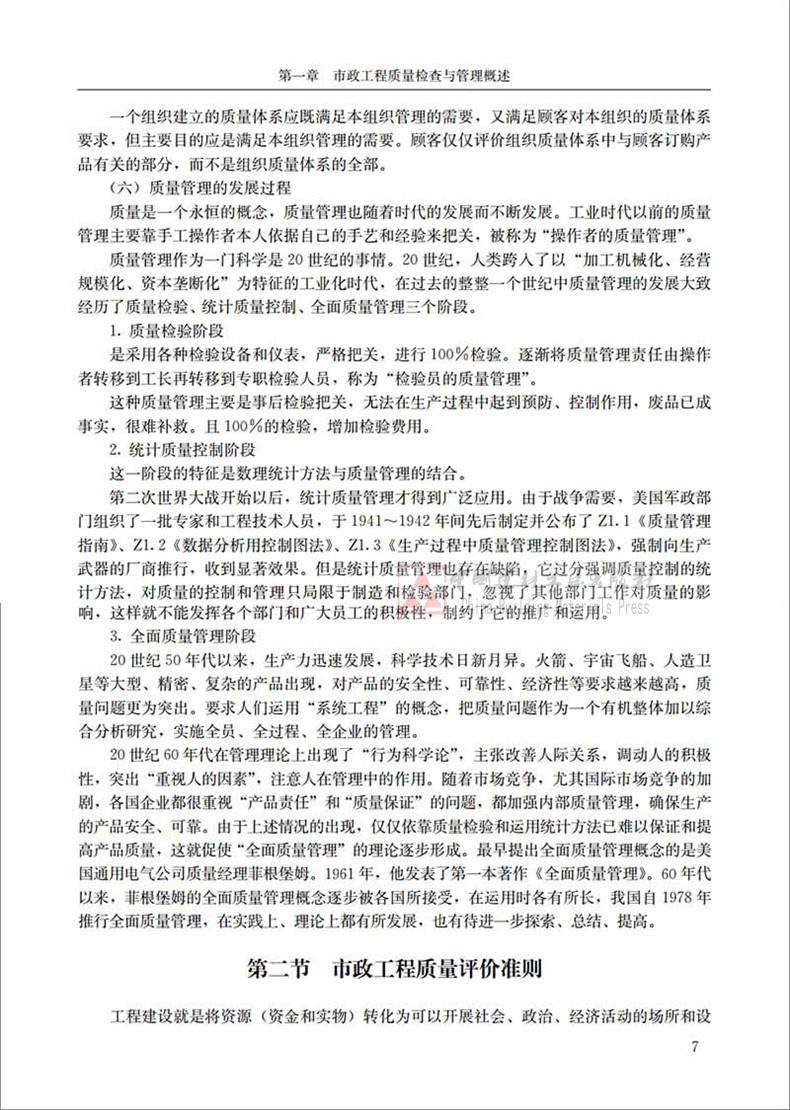 《市政工程质量检验》一书阐述市政工程(城市道路工程、城市桥梁工程、排水管道工程)的质量要求,质量检验方法及手段等内容。全书共分八章:第一章市政工程质量检查与管理概述,第二章工程各方质量责任,第三章开工准备与质量管理,第四章施工过程质量管理,第五章道路工程施工质量检查与验收,第六章城市桥梁工程施工质量检查与验收,第七章城市排水管道工程施工质量检查与验收,第八章竣工验收及质量跟踪。