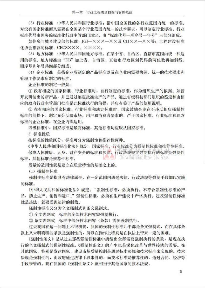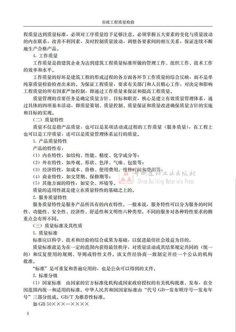 《市政工程质量检验》一书是以国家现行市政工程相关材料、施工与质量验收标准规范为基础,结合市政工程施工现场实际情况编写的,阐述了市政工程(城市道路工程、城市桥梁工程、排水管道工程)的质量要求、质量检验方法及手段等内容。本书共分为八章,以分项工程的质量检验为主线,讲述了市政道路工程、桥梁工程、市政排水管道工程的质量检验以及市政工程质量检验相关表格的填写要求等。第一章市政工程质量检查与管理概述,第二章工程各方质量责任,第三章开工准备与质量管理,第四章施工过程质量管理,第五章道路工程施工质量检查与验收,第六章城市桥梁工程施工质量检查与验收,第七章城市排水管道工程施工质量检查与验收,第八章竣工验收及质量跟踪。本书的编写旨在为高职院校市政专业学生以及广大市政工程施工人员,也包括设计人员、监理人员提供一本有关市政工程施工质量检查与验收的教材,其内容实用、新颖、丰富、系统、齐全,以“易学、够用、能懂、会做”为原则,帮助市政专业的学生以及现场施工人员解决一些现场施工质量控制的实际问题。