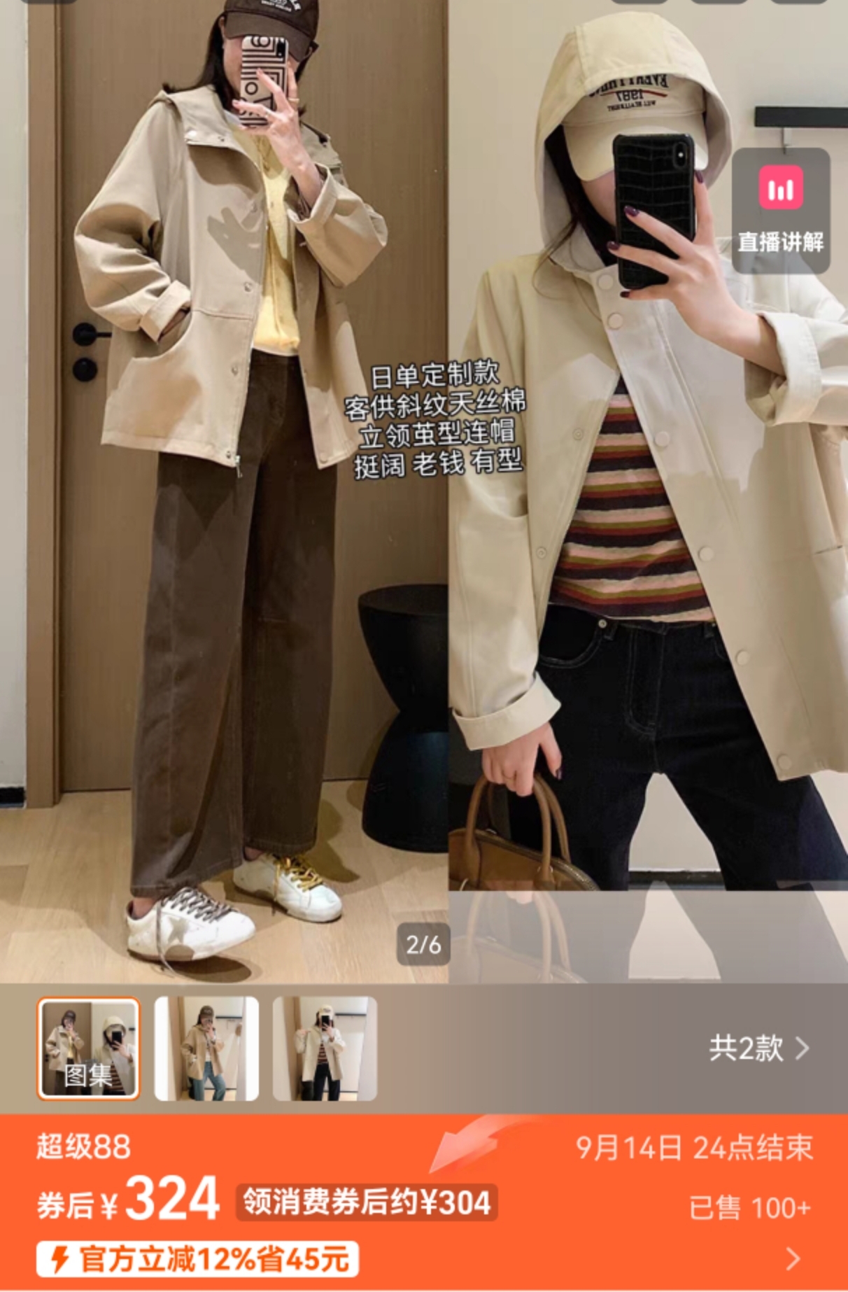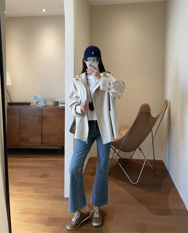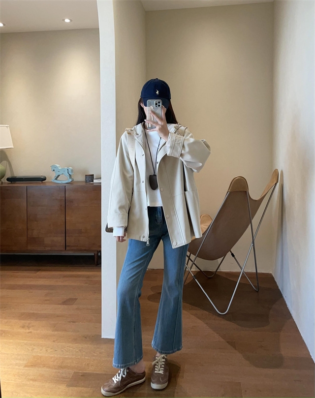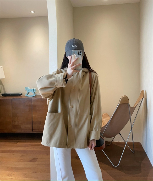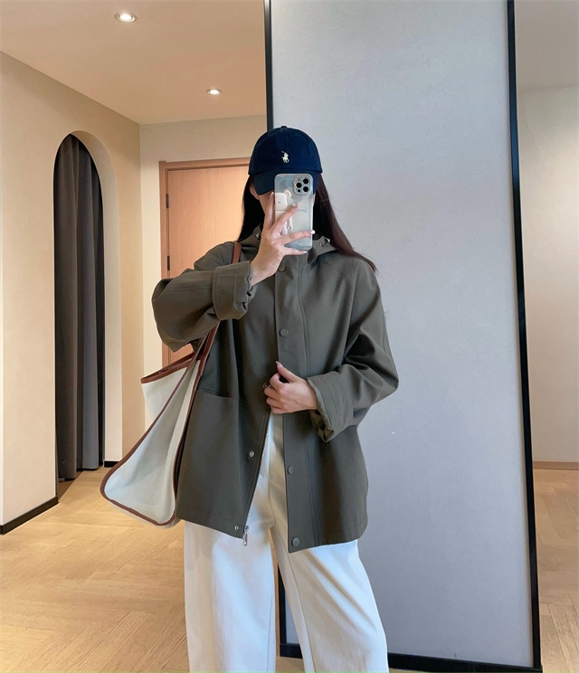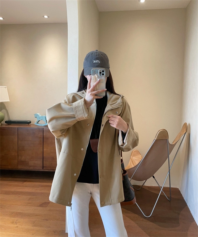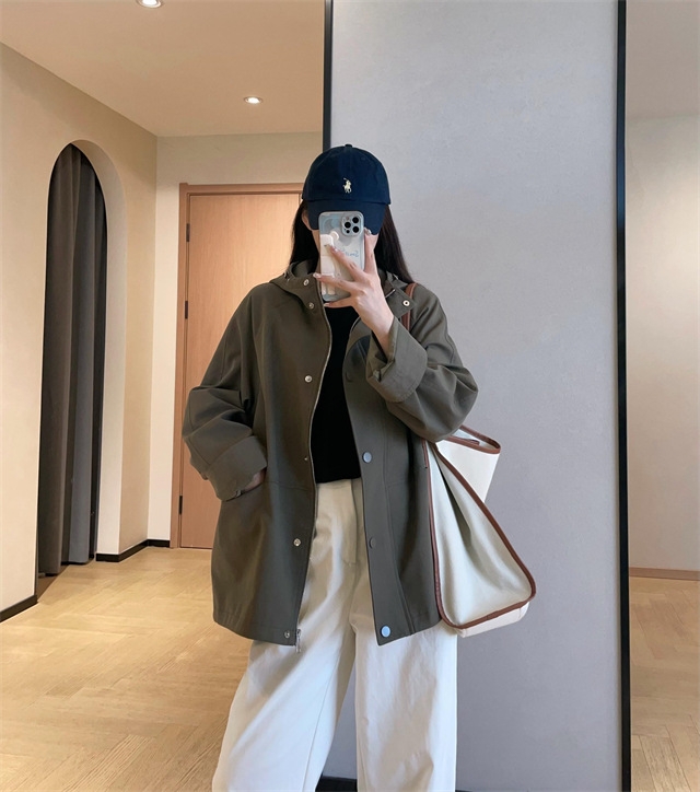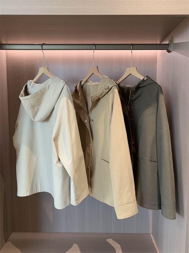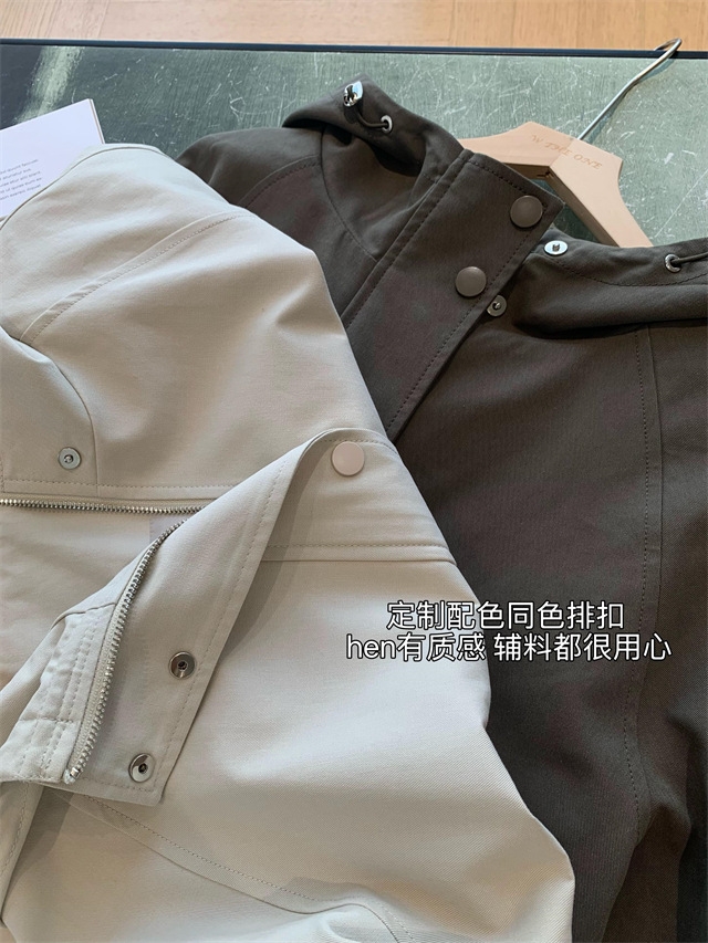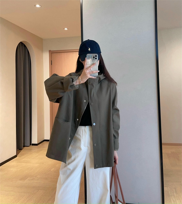 连帽款,微宽松廓形,不夸张,长度盖住臀围,