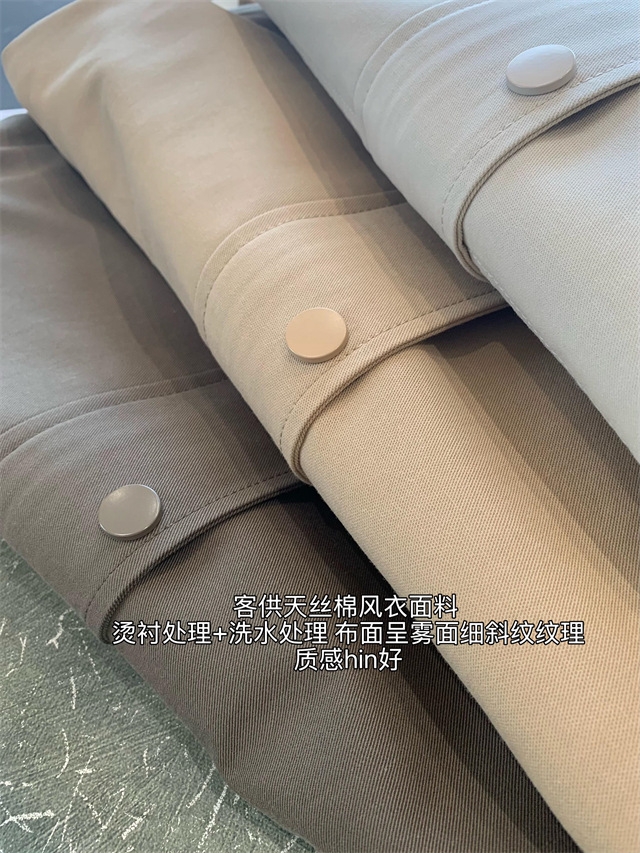 客供天丝棉风衣面料,为了整体廓形感好,面料全部做了烫衬处理,后加工洗水处理,