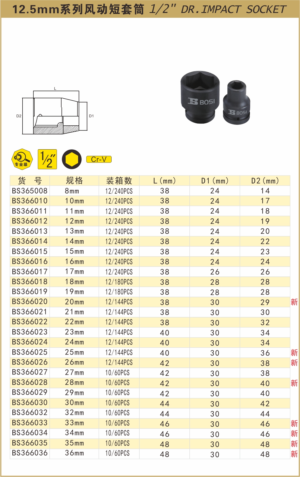 波斯 12.5mm系列风动短套筒 8mm BS365008