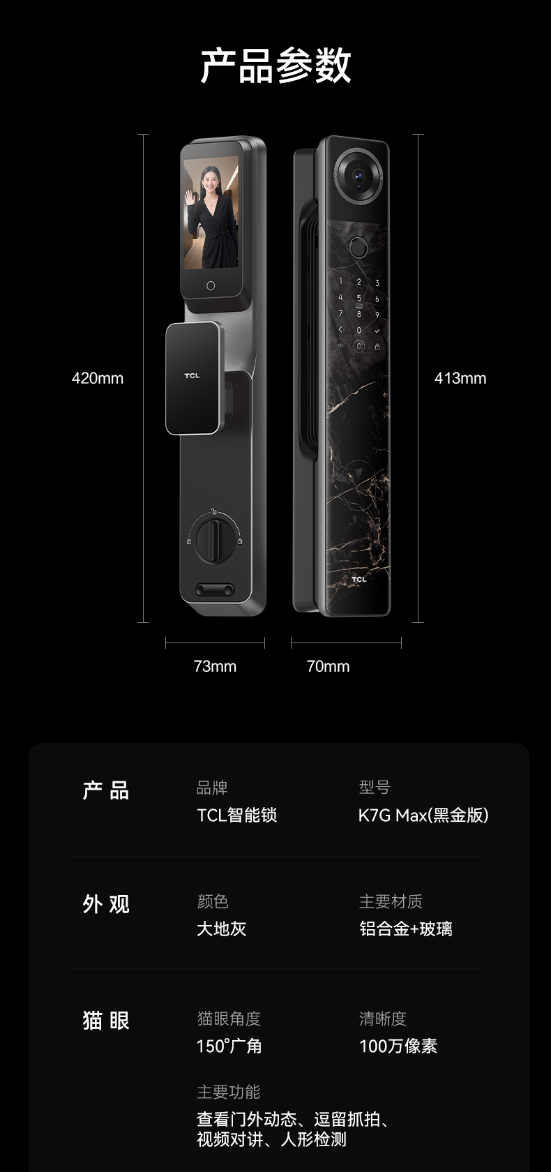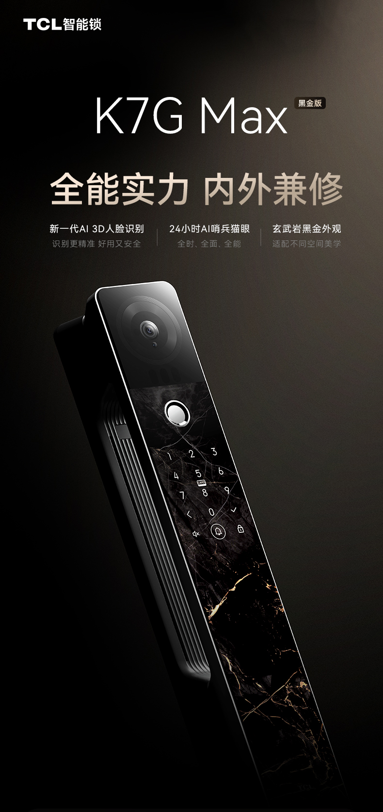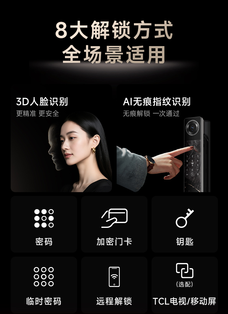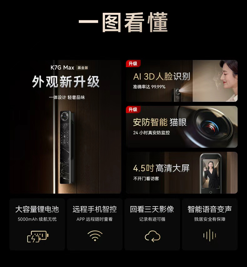 TCL 3D人脸识别猫眼锁指纹锁智能锁智能门锁电子锁K7G Max(黑金版)