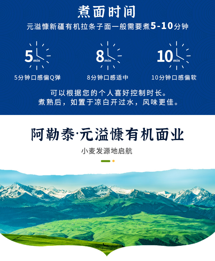 元溢慷面条所用的小麦,产自北纬47°黄金产区--新疆阿勒泰吉木乃县,拥有2万亩有机种植基地,周围200公里内无任何污染,全年PM2.5平均值仅4.5左右,年日照时长2800小时,木斯岛冰山融雪水浇灌,为小麦生长创造了得天独厚的条件。种植过程遵循自然生态系统和循环,不使用化肥和农药,而是施用科学有机肥。种植一季有机小麦需休耕两年恢复土壤有机质,平均每年亩产仅100斤,确保品质。制作工艺也是没话说,智能熟化与烘干工艺等创新科技,将传统技艺与现代技术相结合,更好地保留了小麦的营养和原味,使面条口感更佳。配料表干干净净,有机小麦粉、水、食用盐,就没了,大小朋友都可以放心吃!