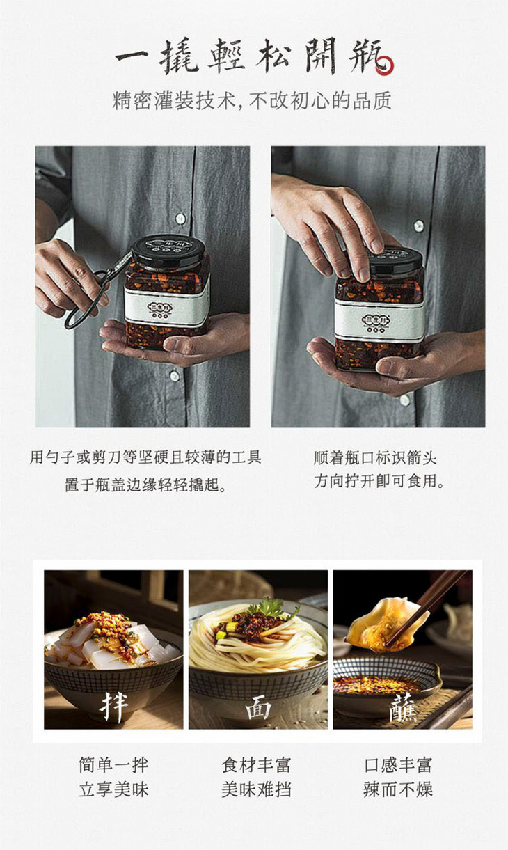 三生川酱酱的包装,也很是古典好看,送人很可!由于酱酱是油性物质产品,所以在基础包装之上还采取了严格的密封和保护措施,防止产品出现破损,漏油等情况,大家可以放心购买哦!四款酱,味道也是各有特色,大鱼大肉吃多了,很需要辣辣来解解腻,减脂餐没什么油水,也可以加一点点来调调味!
