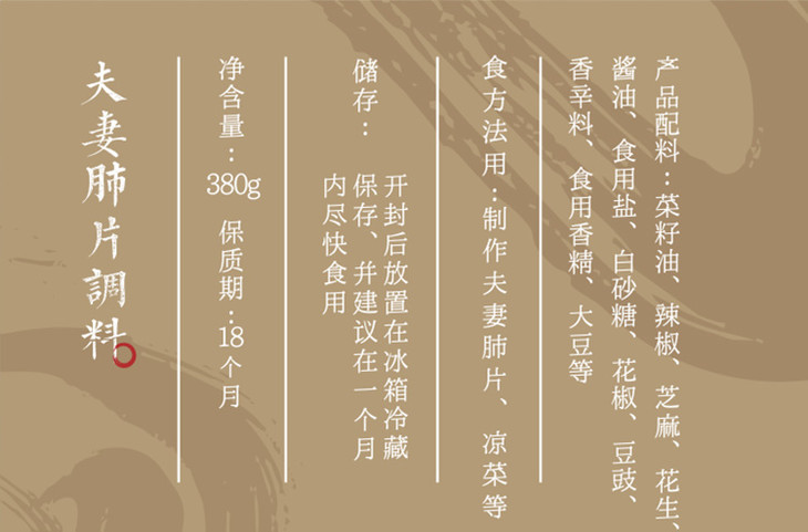 三生川的夫妻肺片酱,是我吃过的ZUI佳的肉菜凉调伴侣,配料简单,只有菜籽油、辣椒、芝麻、花生、酱油、食用盐、白砂糖、花椒、豆豉和香辛料。开瓶盖,轻取一勺,色泽美艳,馋涎欲滴,麻辣浓香,香中带辣。做凉拌菜,只需放入它就可以直接吃了!轻轻尝一下,辣味从舌尖蹿到额头,跳动在身体的每一根神经里,油浸里的花生和芝麻,又多了一份层次与口感,再加上花椒的麻香和豆豉的香味,在最后一刹那迸发。备上几瓶,配上肉肉和香菜,就是一道很棒的解腻凉菜,一秒上桌!