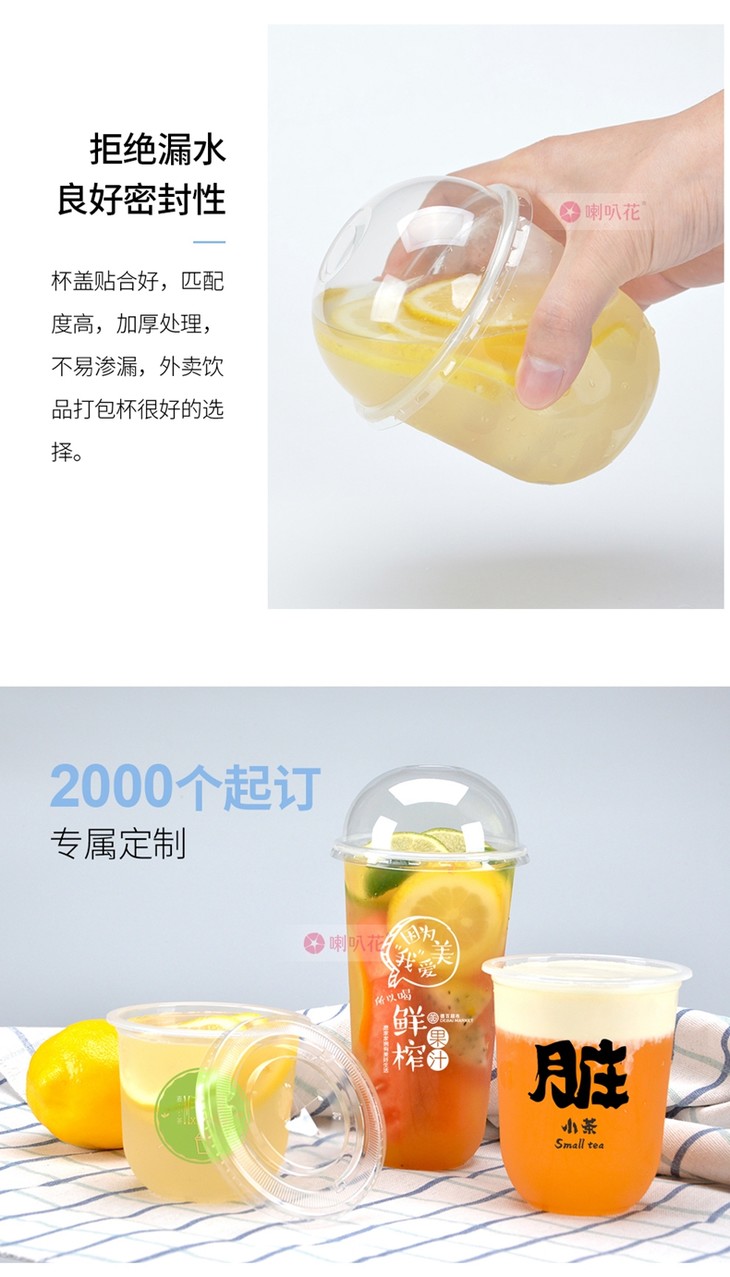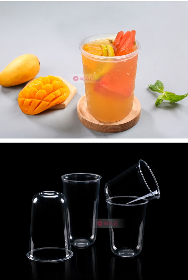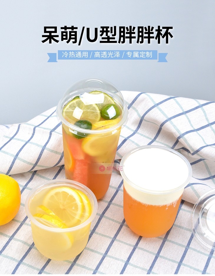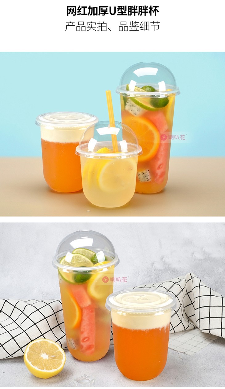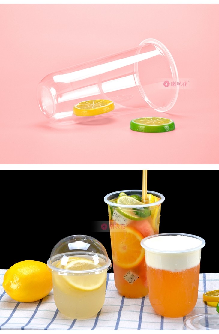 喇叭花PET一次性奶茶杯胖胖杯U型杯透明塑料冷饮料果汁杯带盖100套