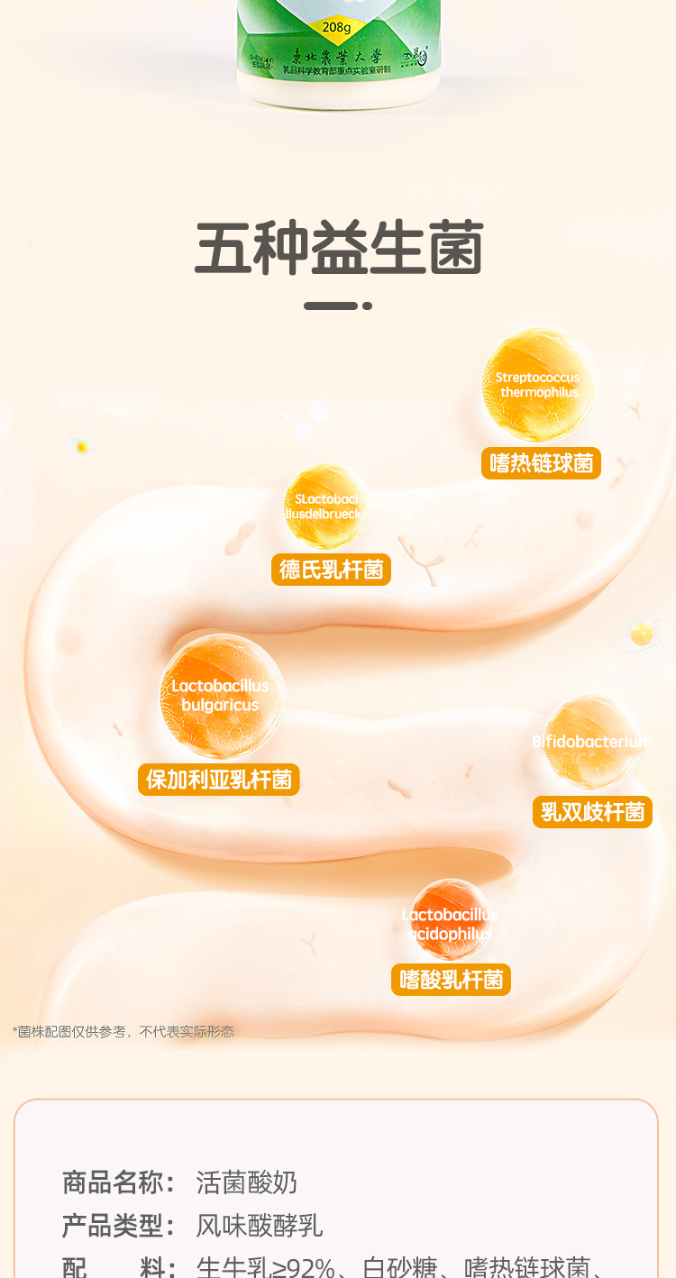 产品配料:生牛乳≥92%、白砂糖、嗜热链球菌、德氏乳杆菌、乳双岐杆菌、嗜酸乳杆菌、保加利亚乳杆菌