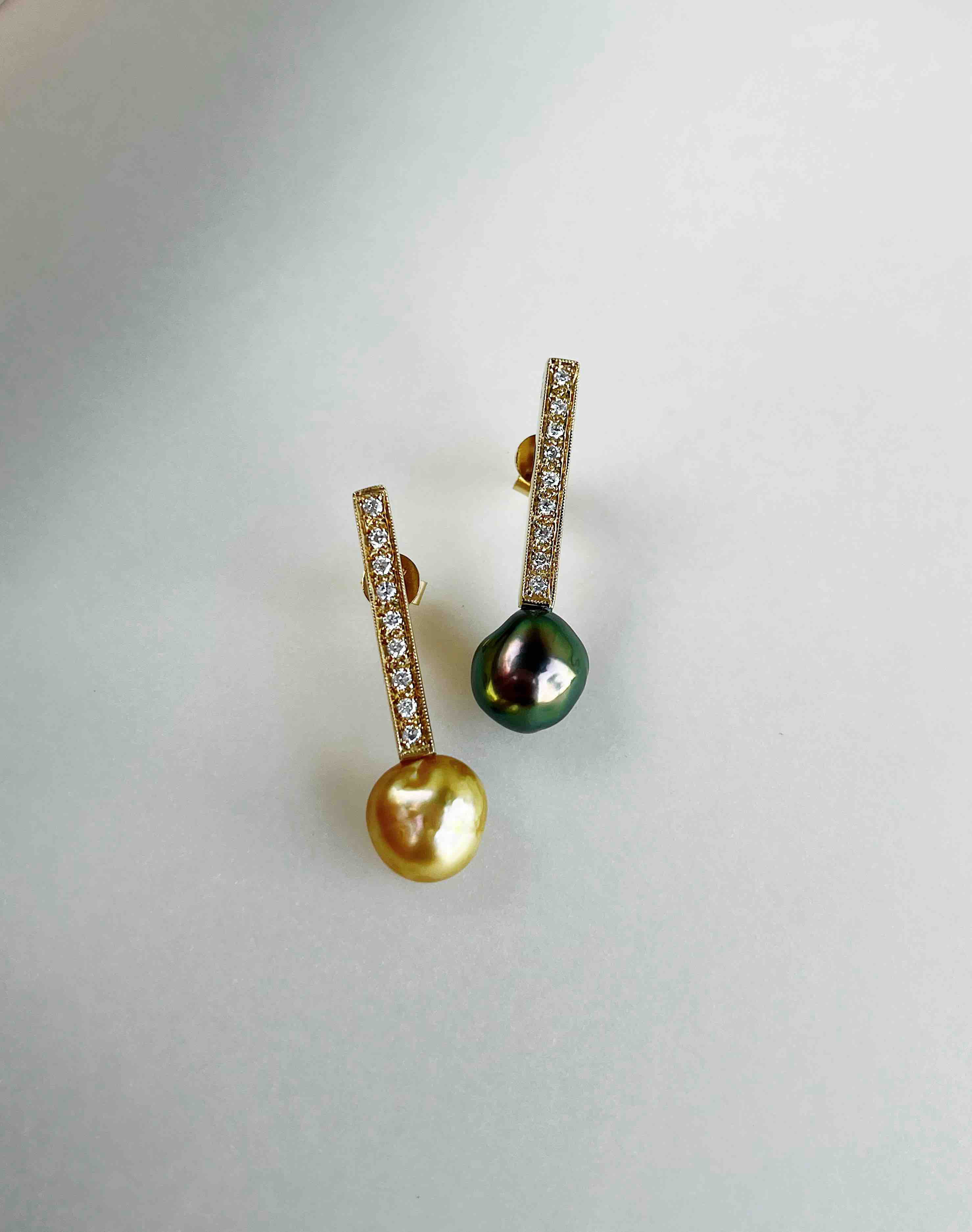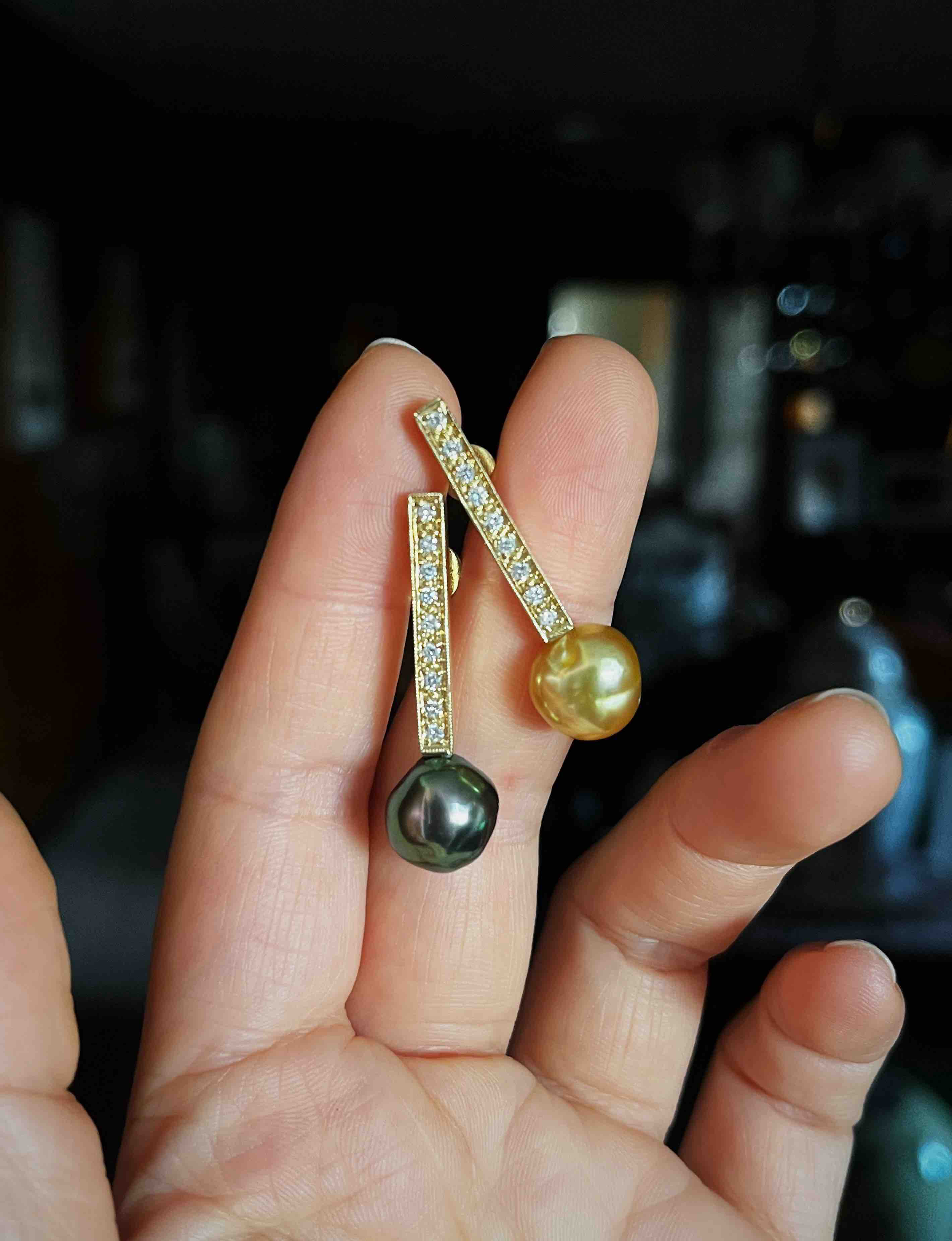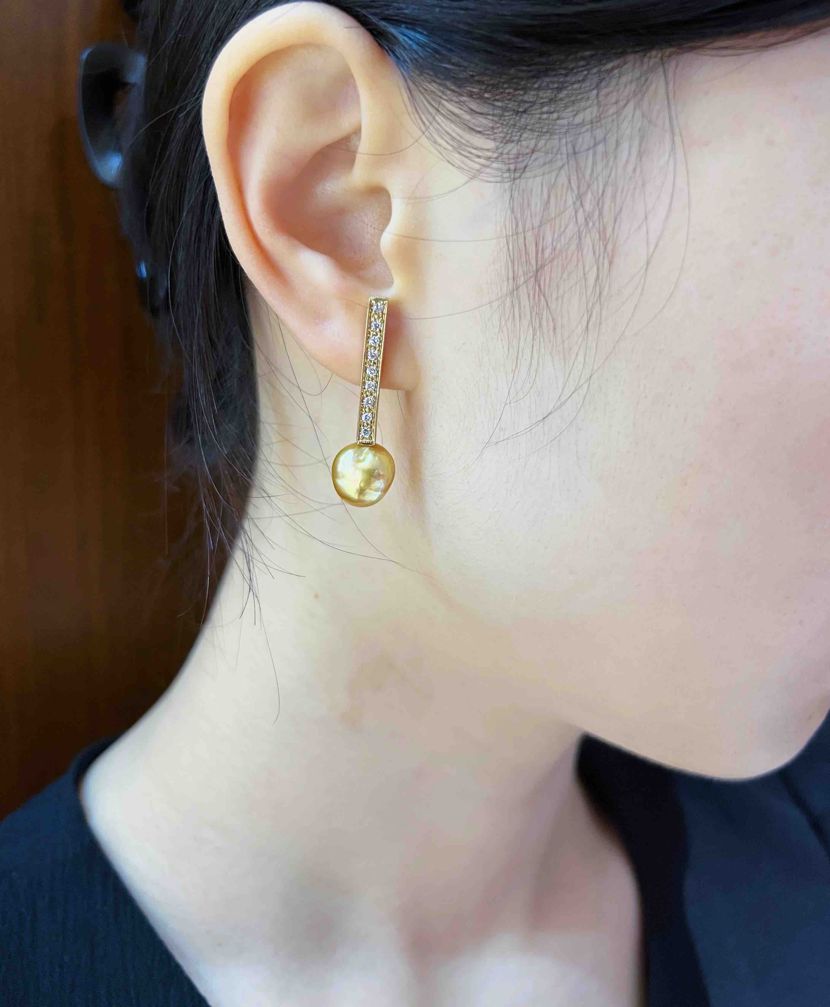 作品名称:18K镶钻石、巴洛克形大溪地珍珠和天然金色南洋KESHI珍珠耳坠