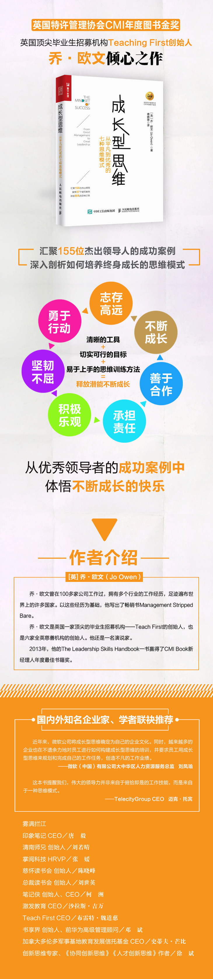 经过14年对世界各地领导者的研究,本书作者乔·欧文发现,杰出、成功的领导者之所以和其他人做得不一样,其原因不仅仅在于他们的技能,而在于他们思维模式的不同。 这本书会帮助你解密自己真正的潜力,告诉你如何拥有超越成功、终身成长的七种重要思维模式。正确的思维模式能够帮助你发现职场上更多的机会,取得意想不到的成功,让你的未来拥有不同的可能。从体育到教育,从创业到管理,乔·欧文的原创调查与采访告诉我们,出色的领导者是如何与众不同地进行思考与行动的。他们的思维模式稳定且可预测,我们可以从中学习。一旦形成本书所倡导的思维模式,你就获得了终身成长的优势。 无论你是企业管理者、职业经理人,还是普通的职场人士,本书都将使你大受裨益。本书的目的不是要改变你的本质,而是让你能够展现出自己良好的一面,发挥出自己的实力,集中精力聚焦于自己的优势。这本书为你提供了简明的工具,以期改变你的思维、行动和表现,帮助你从一个杰出的人成长为一个知名的人。