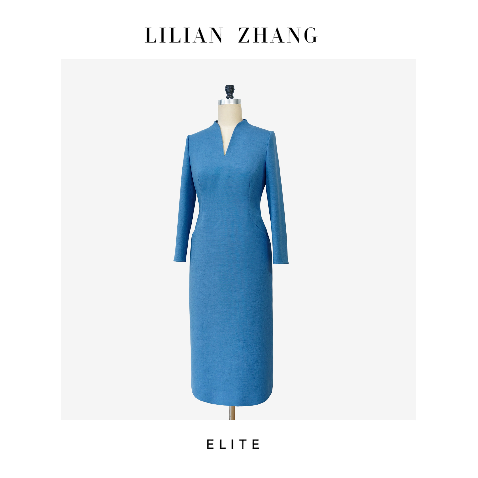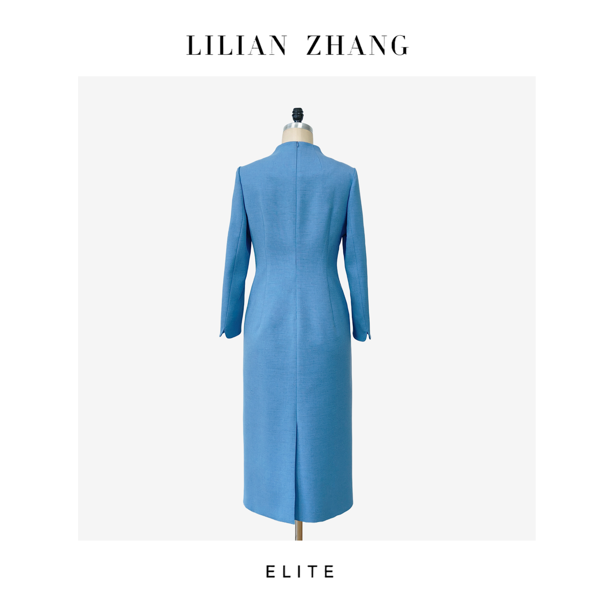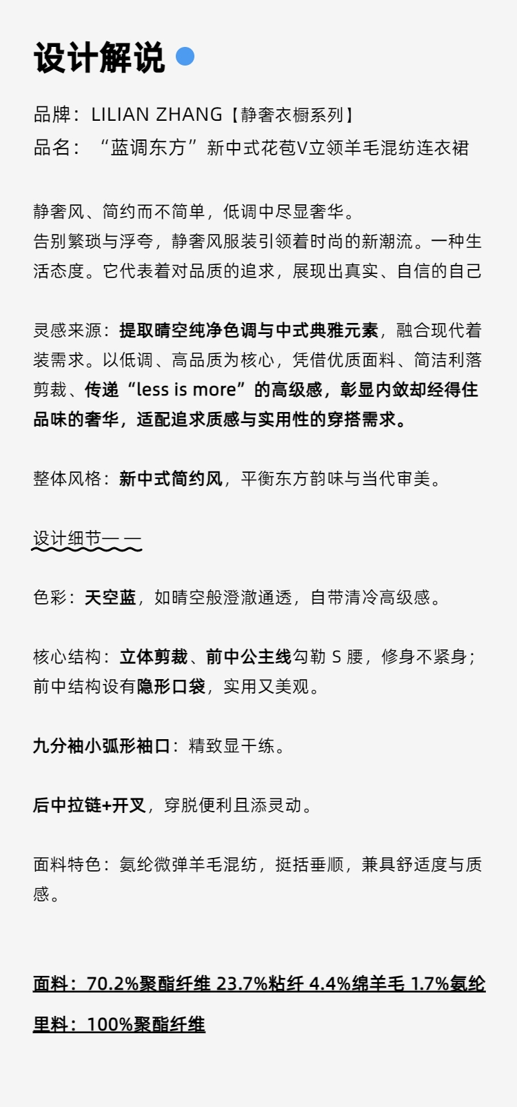 “定制”静奢风蓝调东方新中式花苞V立领羊毛混纺轻职连衣裙2501076