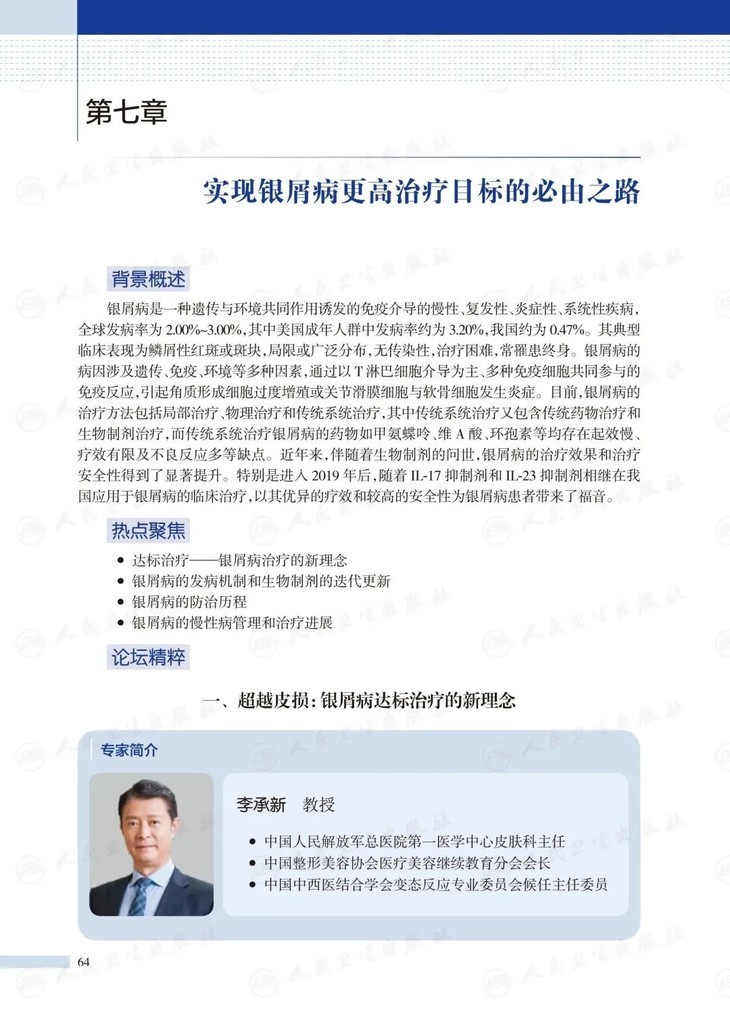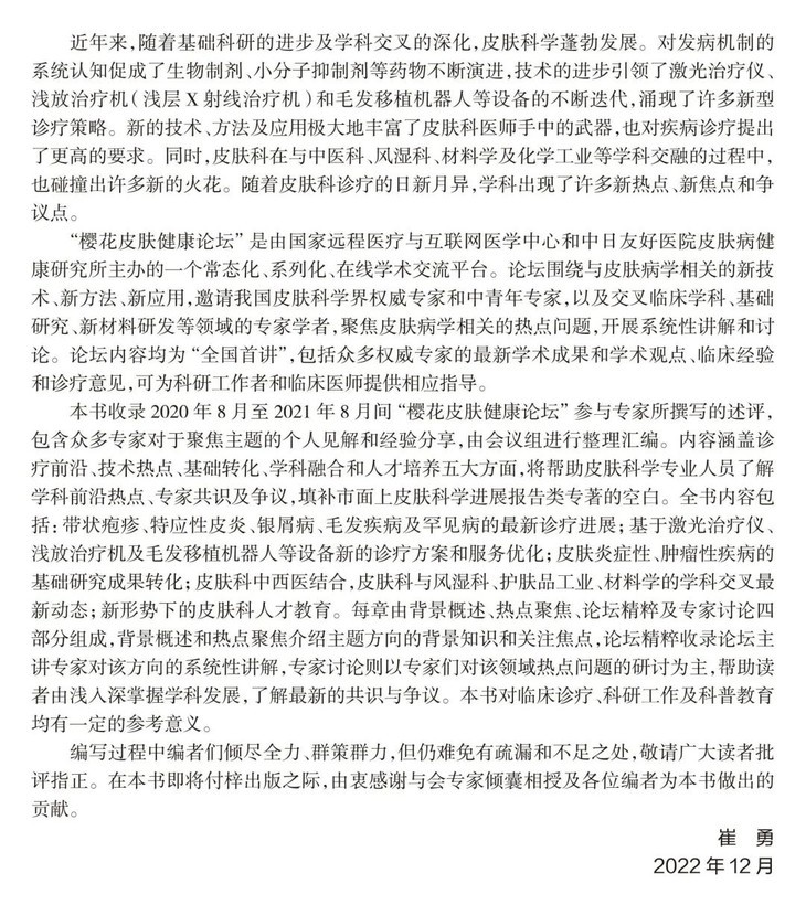 为凝聚专家思想亮点与智慧,启发更多热点、焦点的探讨,编写团队记录整理了历次论坛中专家的学术观点、学术讨论和学术证明,汇编成《皮肤科诊疗热点聚焦》,希望用文字承载思想,并传递给更多医学同道。