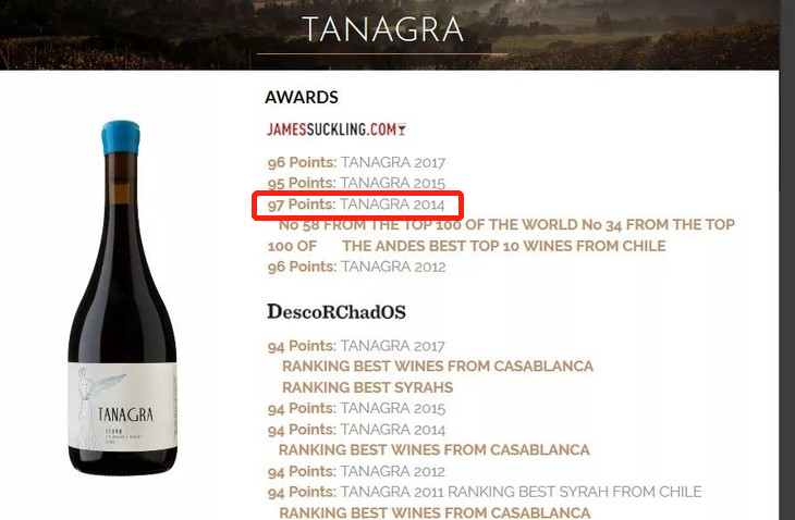 3、塔纳格干红:智利史上高分西拉之一,曾获 JS 97 分,获评智利 10 佳葡萄酒之一
