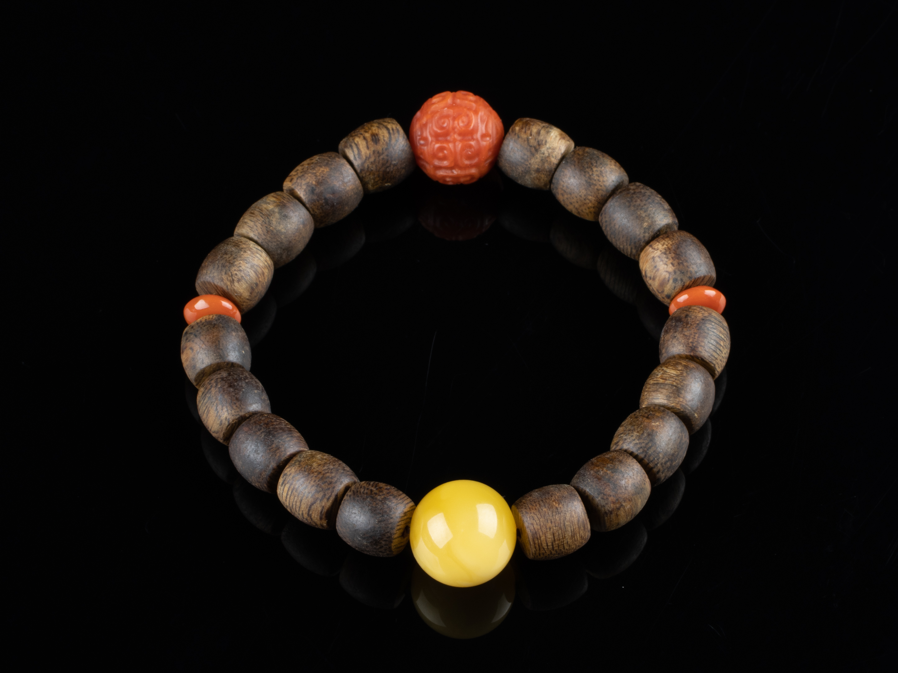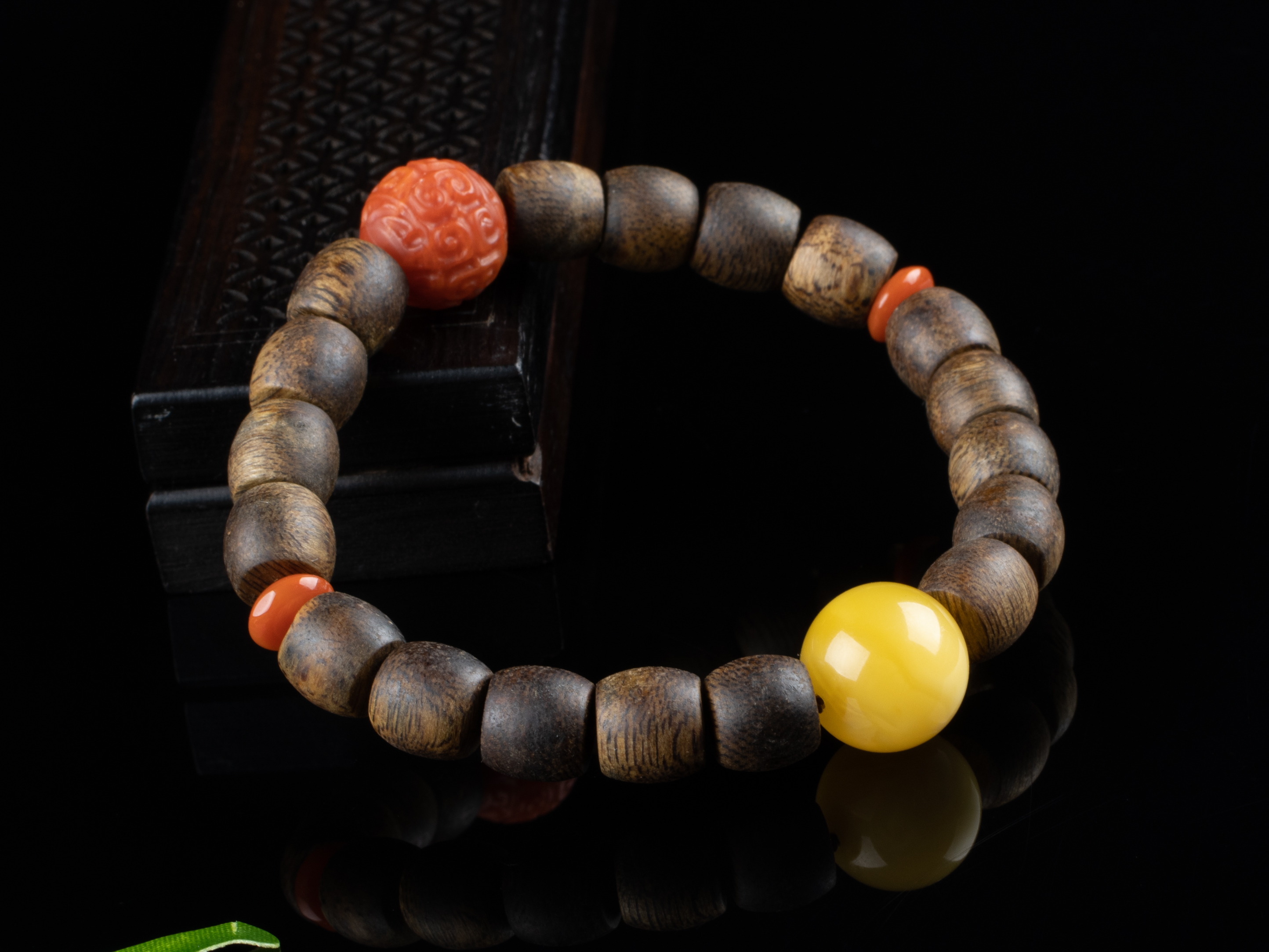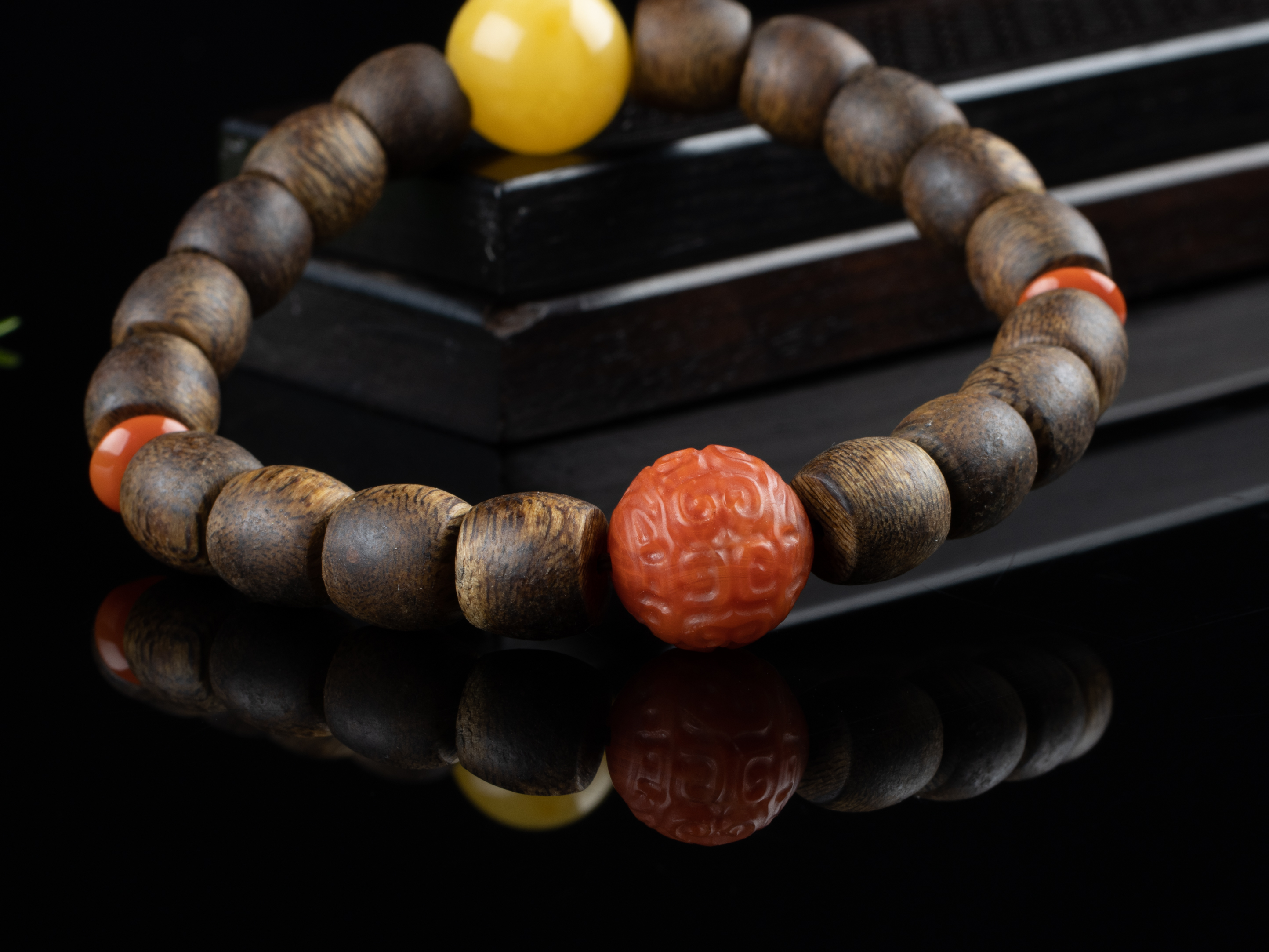 XY0129沉香老型珠蜜蜡南红回纹珠十八子手串,天然沉香老型珠,原色原味,香味自然清甜,一颗大蜜蜡,一颗大南红回纹珠,五四成九,九九十八子,九为吉数,日常佩戴,能量满满。