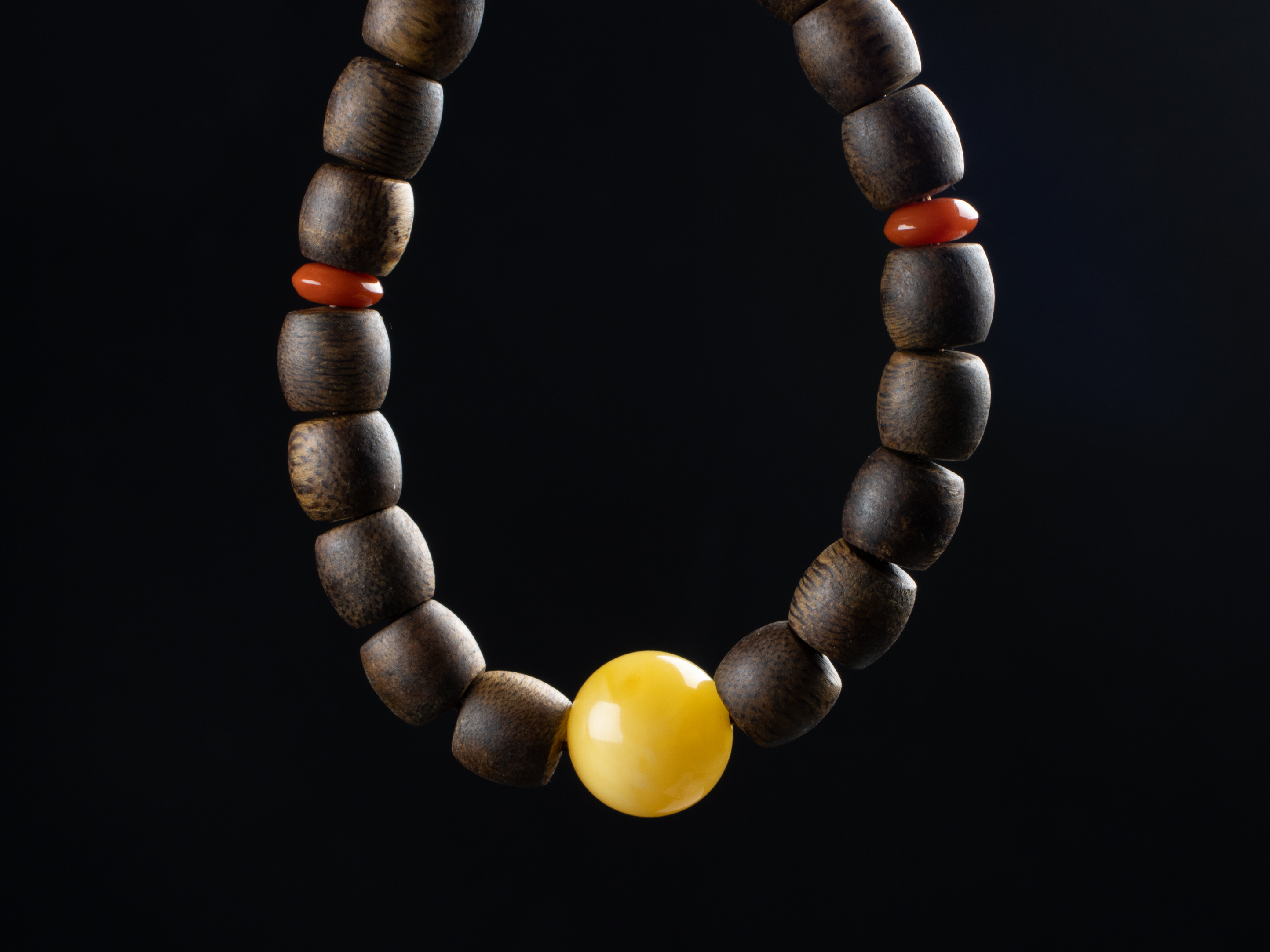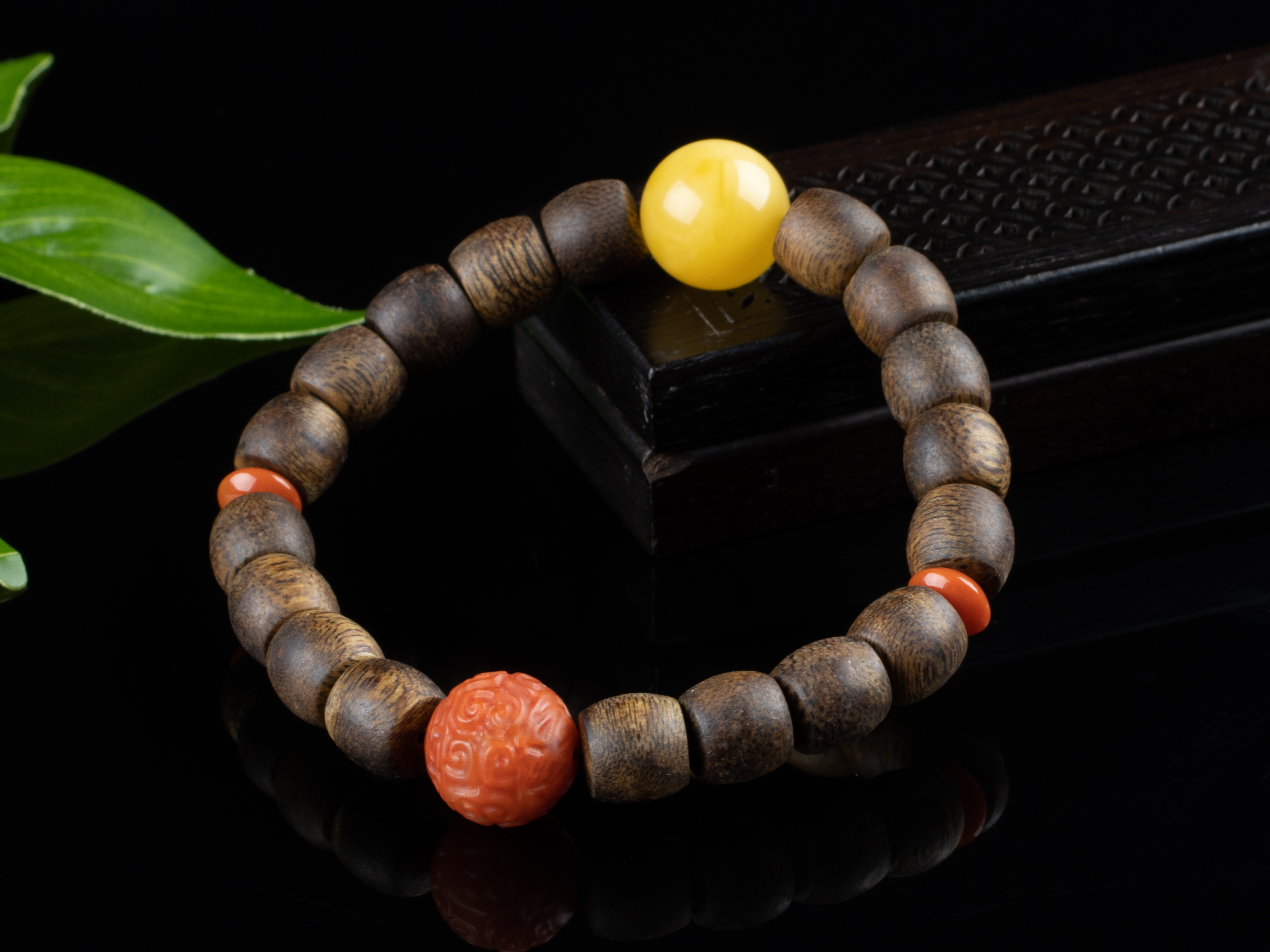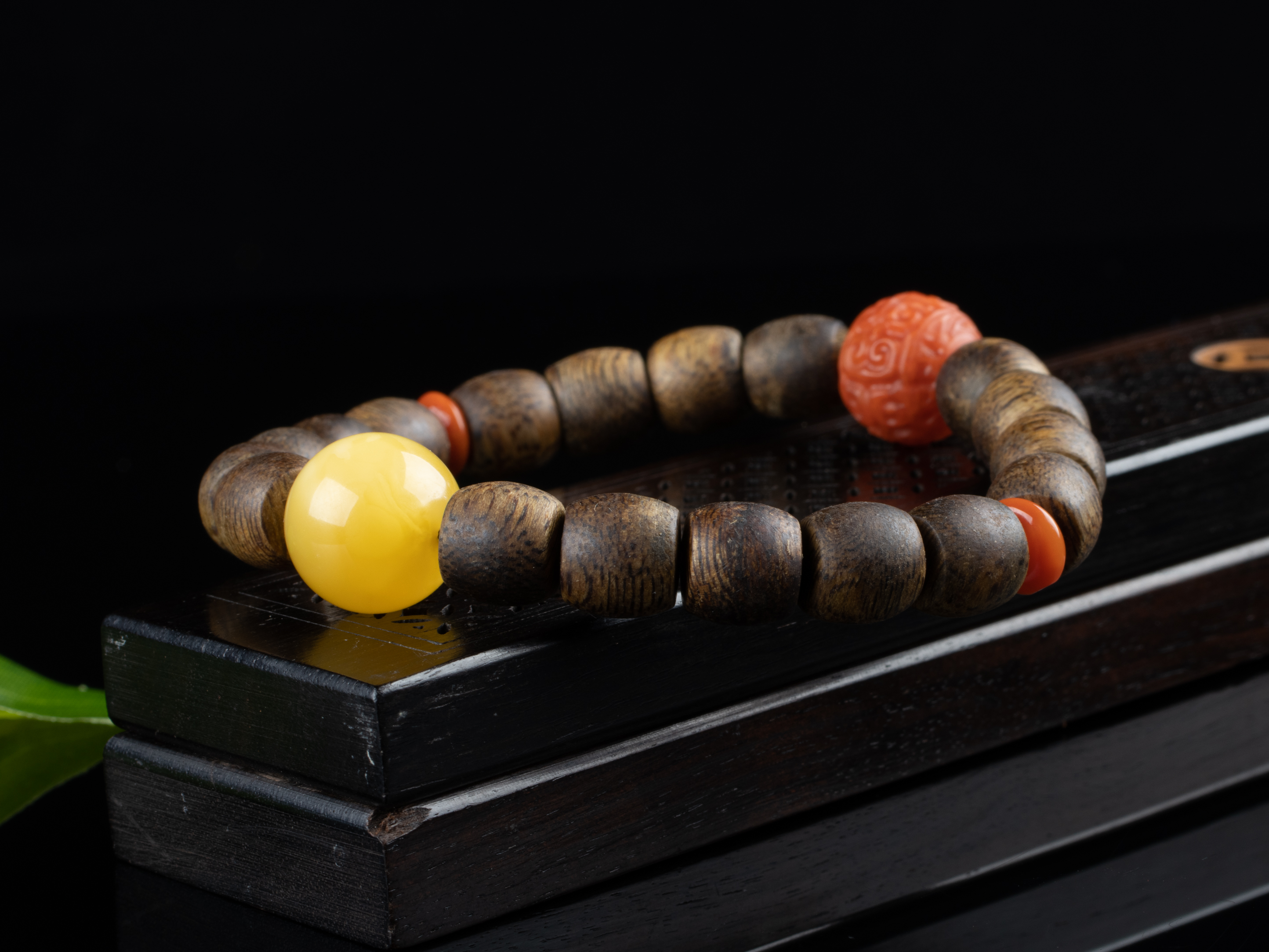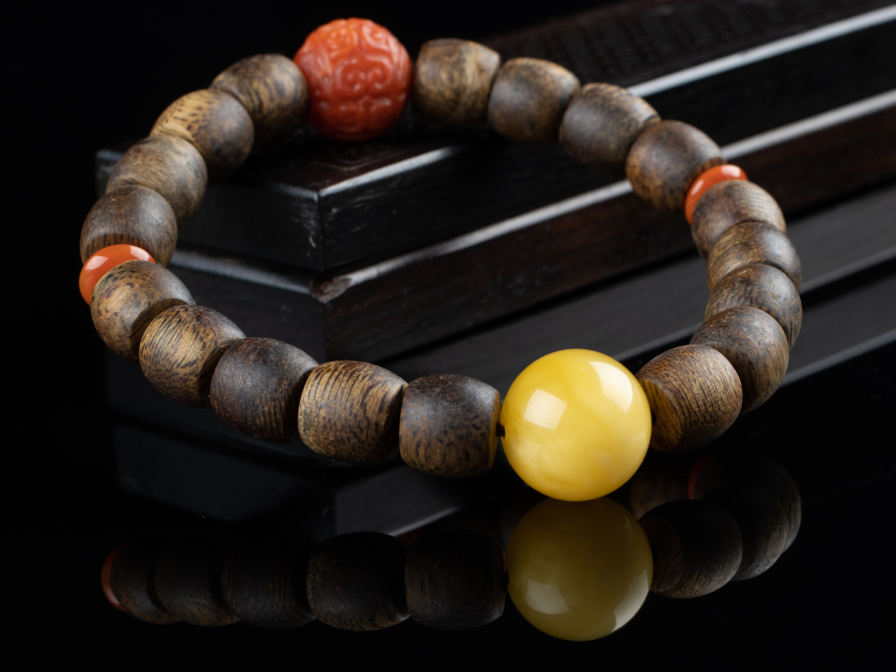 XY0129沉香老型珠蜜蜡南红回纹珠十八子手串,天然沉香老型珠,原色原味,香味自然清甜,一颗大蜜蜡,一颗大南红回纹珠,五四成九,九九十八子,九为吉数,日常佩戴,能量满满。