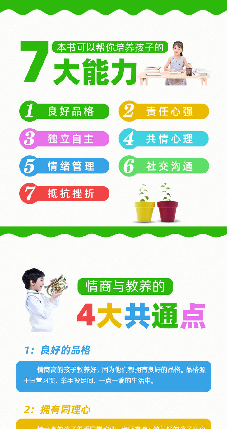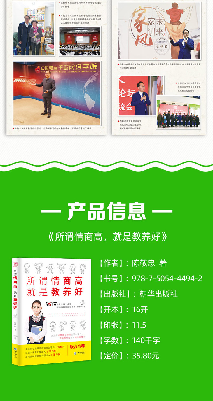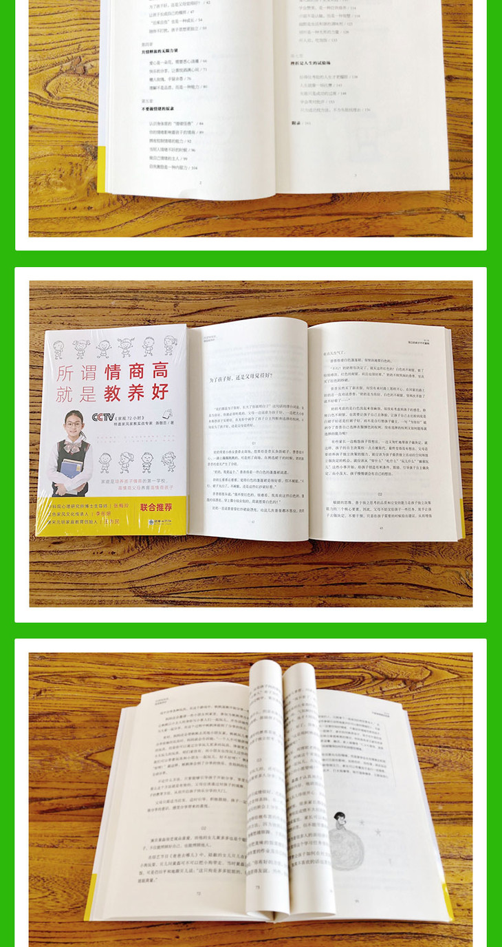 《所谓情商高,就是教养好》从品格教育、责任心、独立性、同理心、人际交往、情绪管理、挫折教育等多方面出发,总结了多个家庭的教育经验。家长只需从生活小事中稍做改变,就能实现孩子人生的大转变。书中充满了源于生活、学校的各种有趣的小故事,可以使孩子认识并管理自己的情绪,引导父母与孩子共读,也让父母在养育孩子的过程中遇见更好的自己。