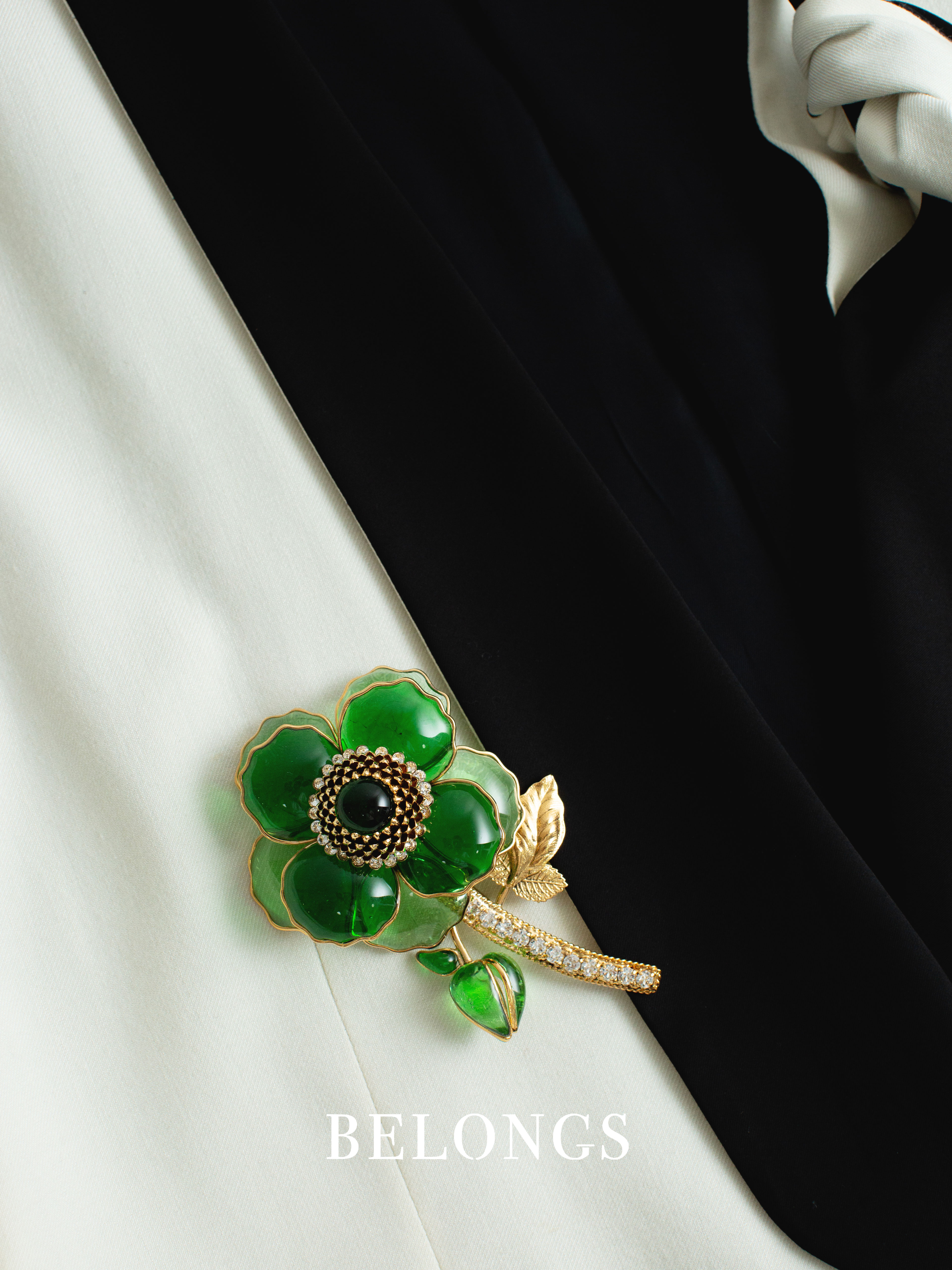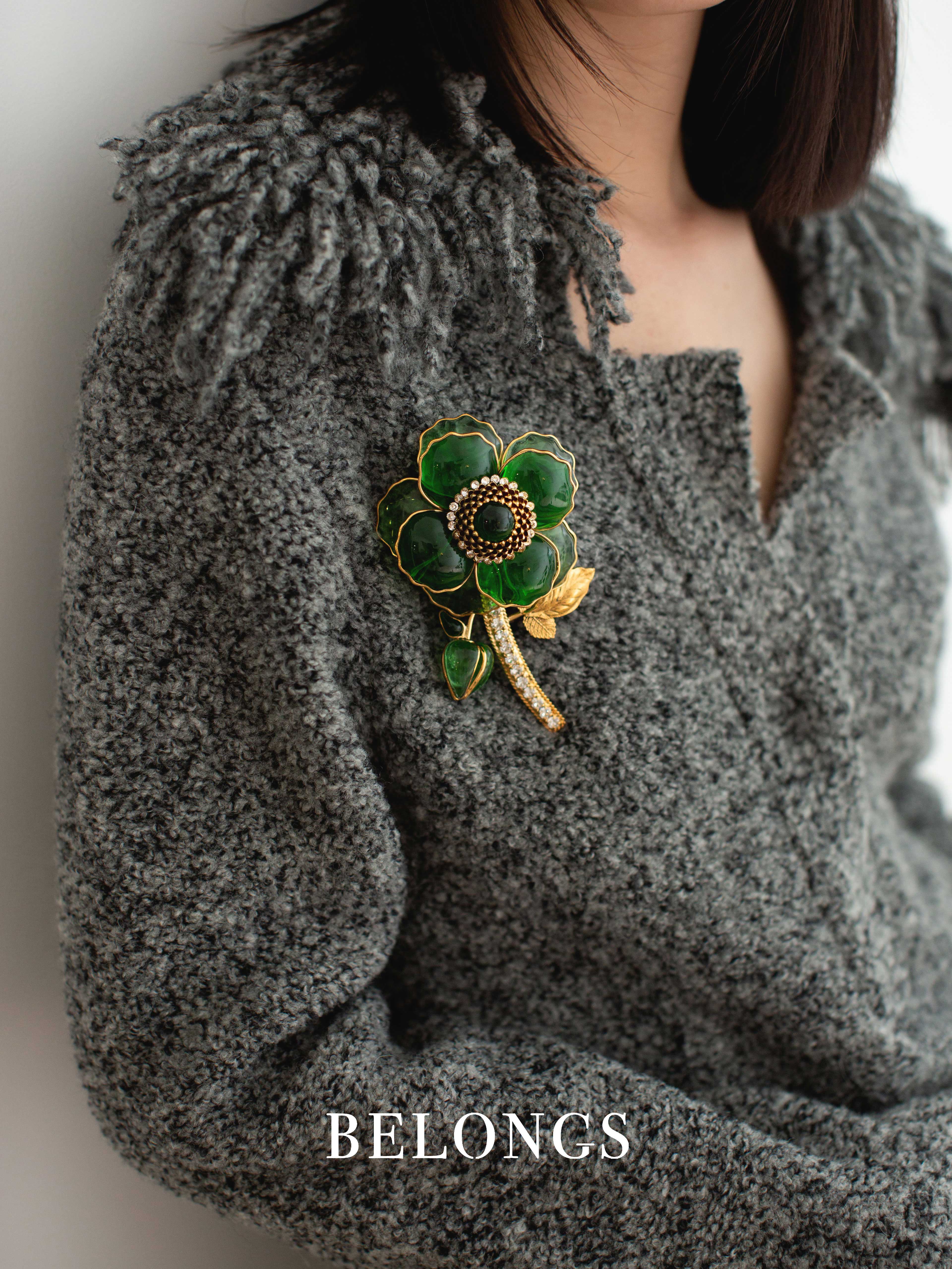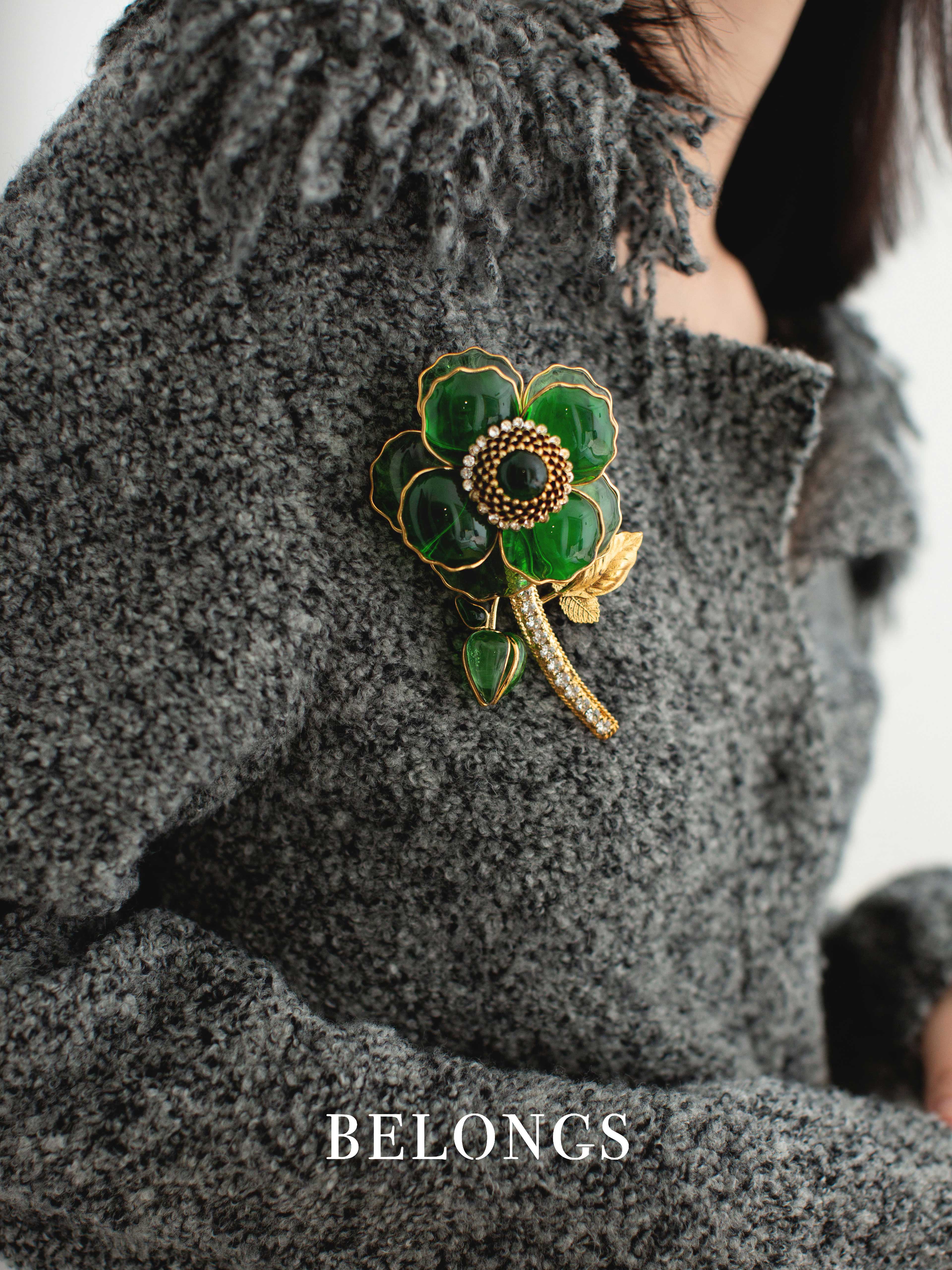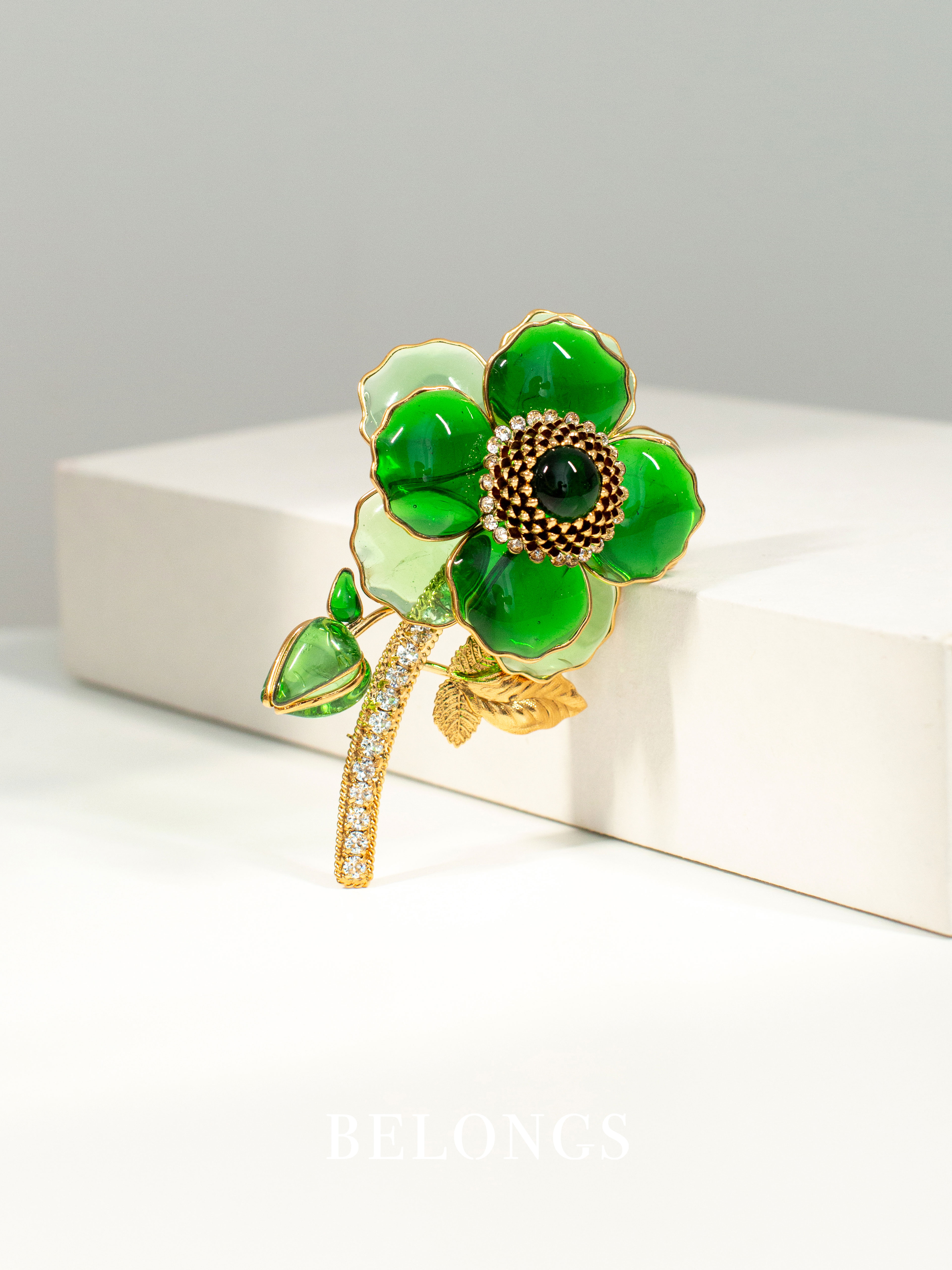 订购6个月到|Gripoix Paris-Pop Glamour Statement-绿色 花朵 琉璃 胸针[法国设计师]