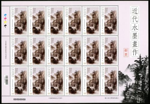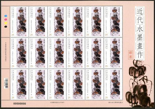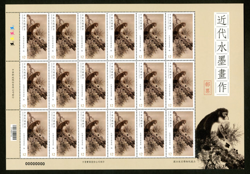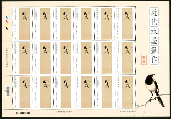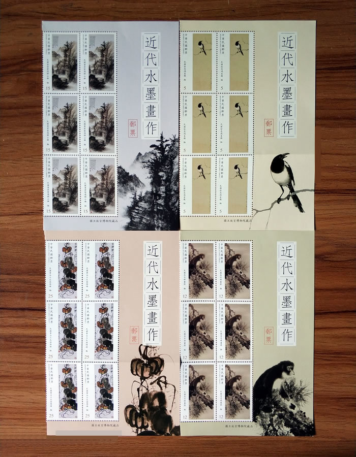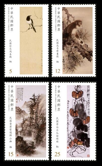 为阐扬我国近代水墨画作之美,台湾中华邮政特以国立故宫博物院典藏之四位著名画家:徐悲鸿喜鹊 轴、高奇峰画猿 轴、黄君璧境僻山幽 轴 及 齐白石瓜跌绵绵 轴等4幅画作为题材,发行邮票1套4枚,邮票面值分别为5元、12元、15元及25元。