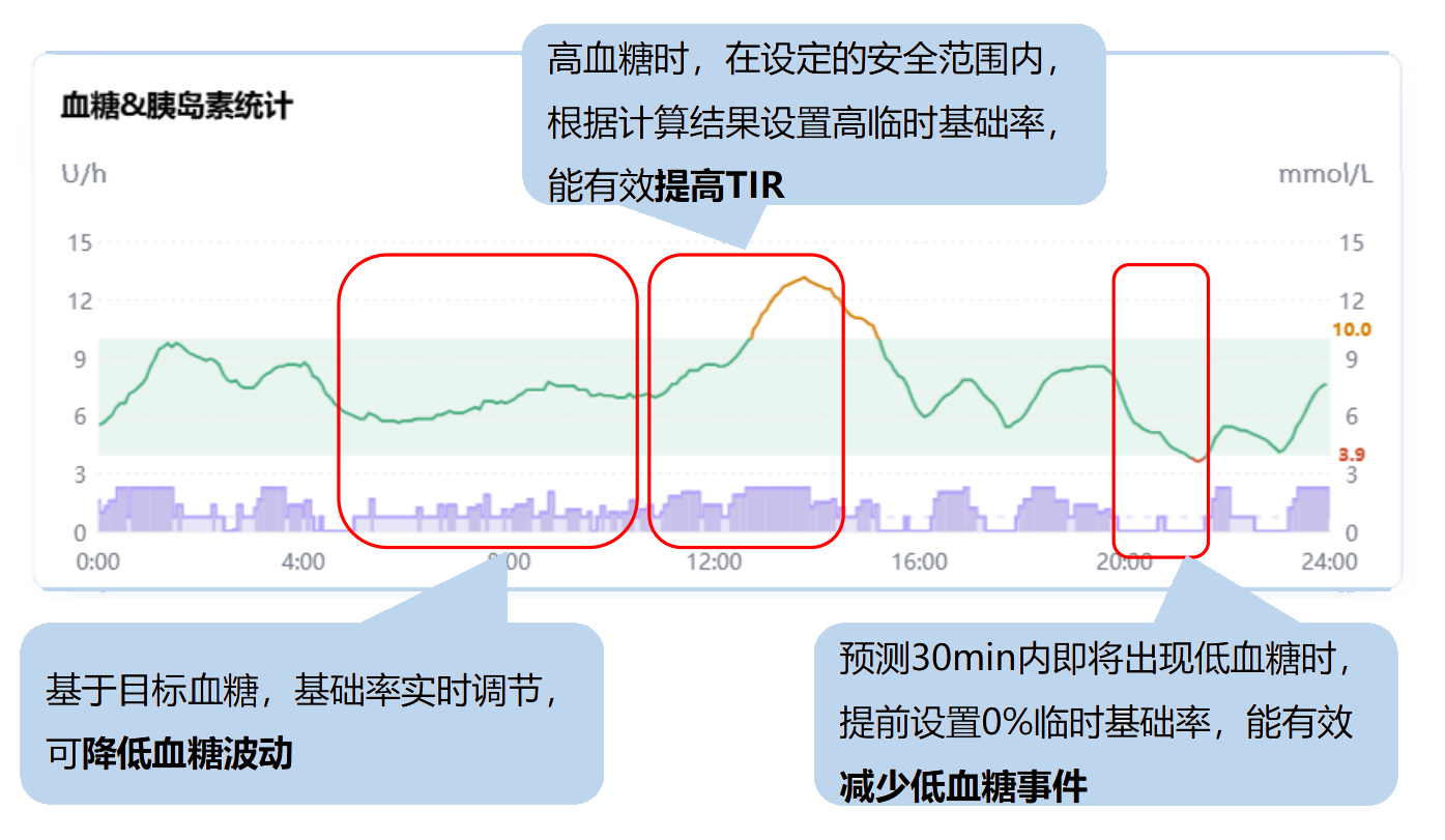 搭配动态血糖形成闭环,可基于当前血糖和血糖趋势自动分析、调整基础率。当血糖平稳时按原有基础率执行输注;当血糖有升高趋势时临时提高基础率,有效防止高血糖;当血糖有低血糖趋势时降低或暂停基础率注射,有效防止低血糖发生。提供24小时自动守护,预防夜间高低血糖,并具备安全报警,显著改善睡眠质量和安全感。