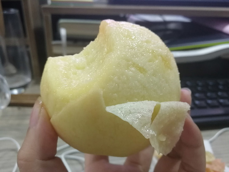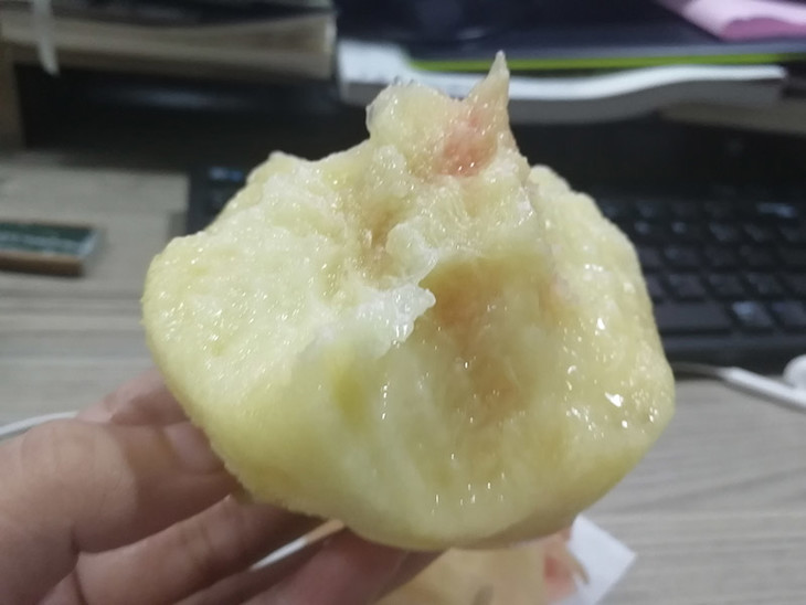 来之前,同事给了我一只试吃,我放在抽屉。每次打开抽屉,都能闻到淡淡的甜香。本来想多放放,闻闻这美好的气味,但最后还是忍不住吃了。用指甲轻轻撬开水蜜桃表皮,蜜汁几乎就冒了出来。