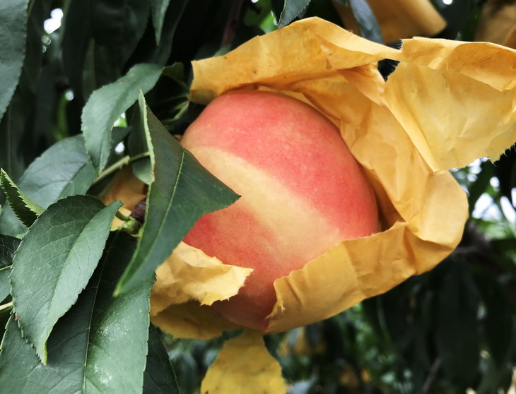 好奇地打开一只袋子,蜜桃已经成熟,带着粉嫩。充满着让人期待的甜美。