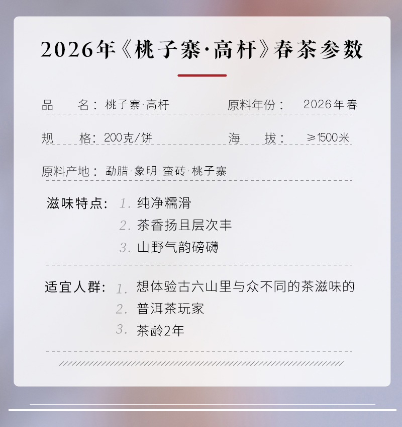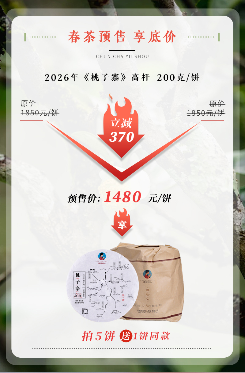 【预售8折,买5送1】2026《桃子寨高杆》古树春茶 生茶 200克/饼