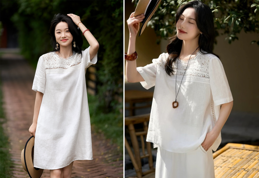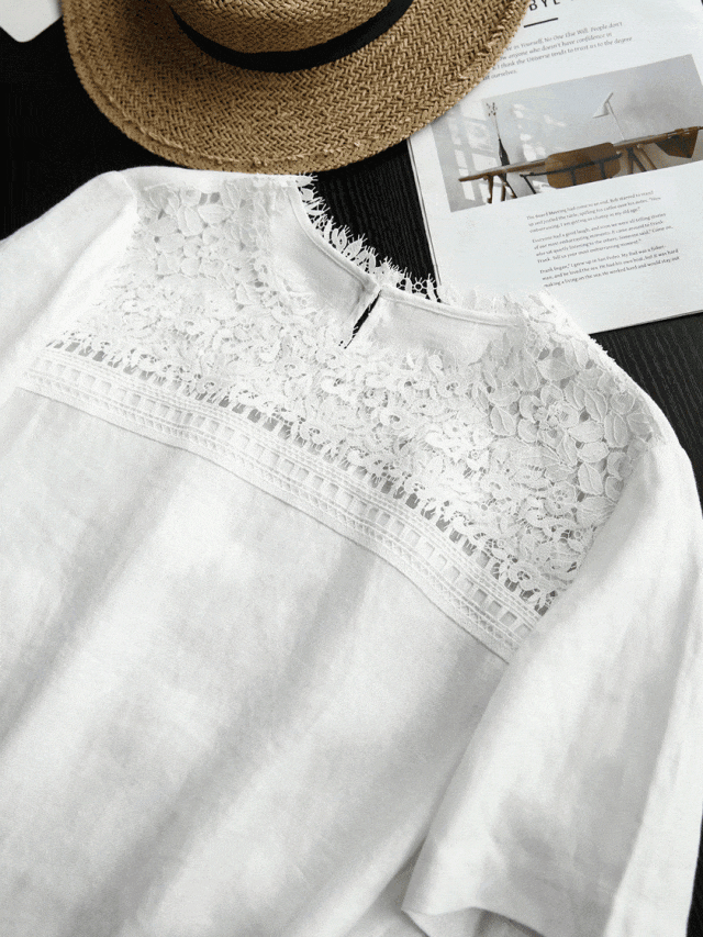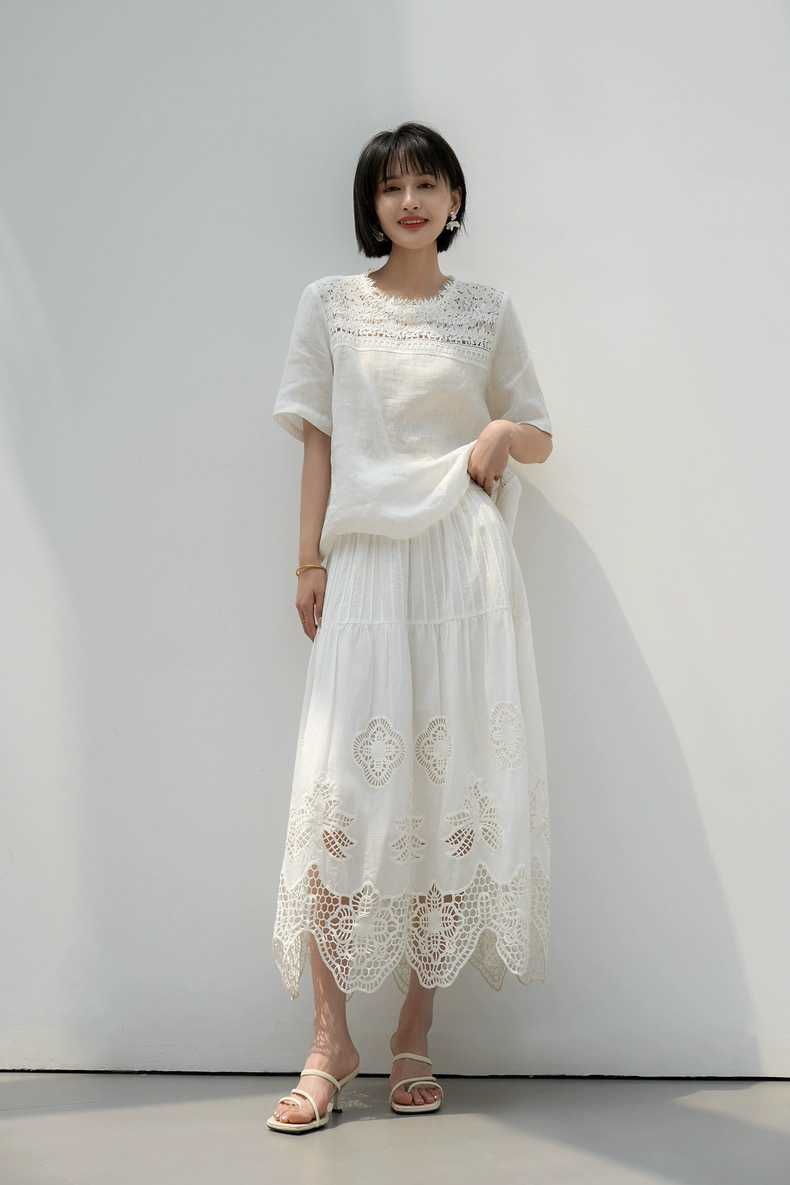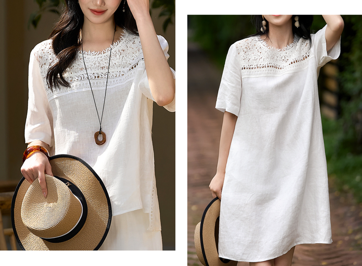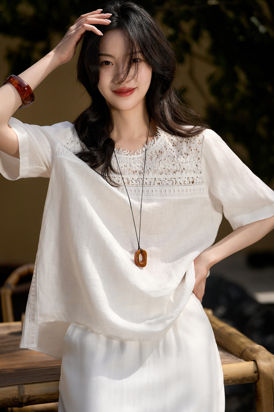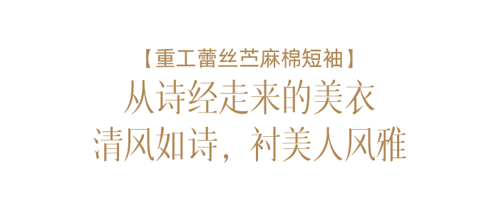 款式二:重工蕾丝苎麻棉短袖 面料:80%苎麻、20%棉 颜色:月光白 尺码:M、L、XL |