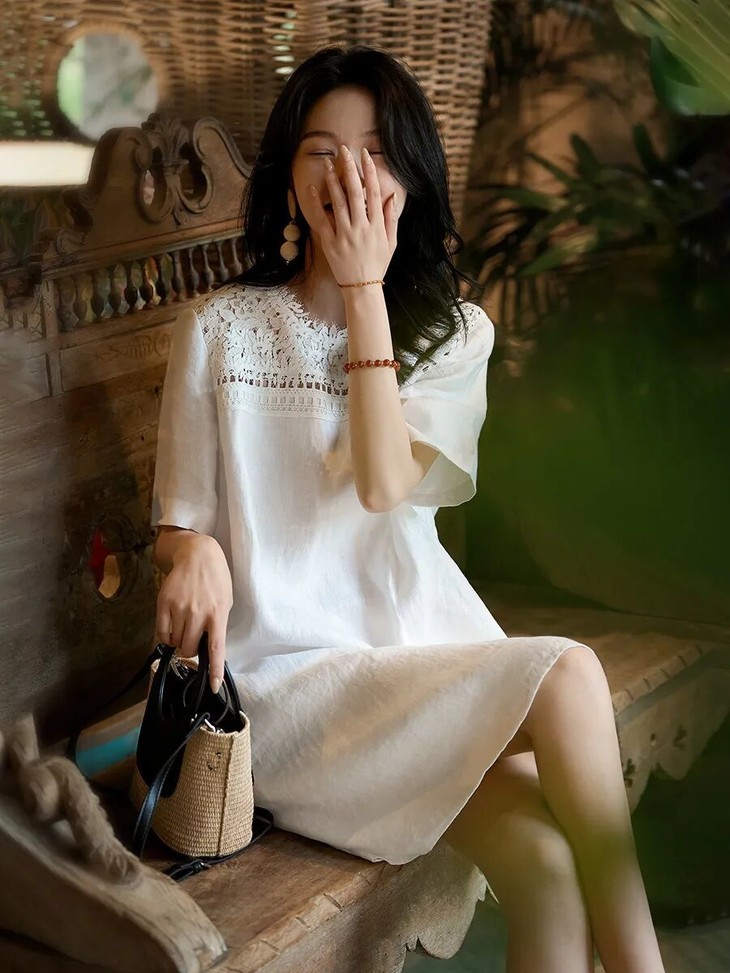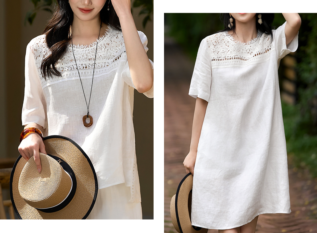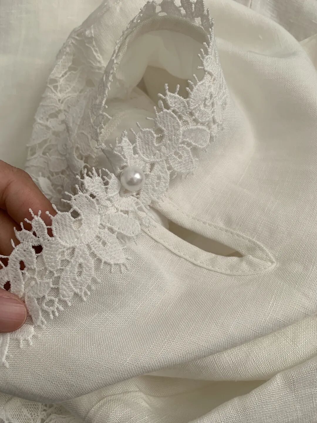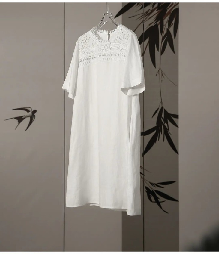 品牌:梅茵凯琳Meline Kaylin 品名:「一生浮梦」亚麻天丝系列 款式一:重工蕾丝亚麻天丝连衣裙 面料:70%亚麻、1.2%桑蚕丝、28.8%莱赛尔天丝 颜色:月光白 尺码:M、L、XL