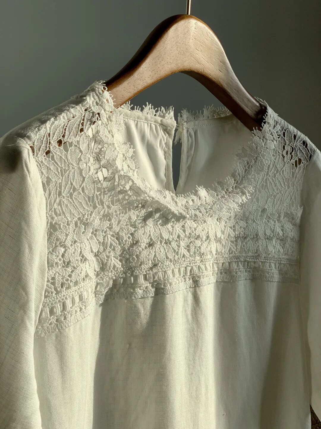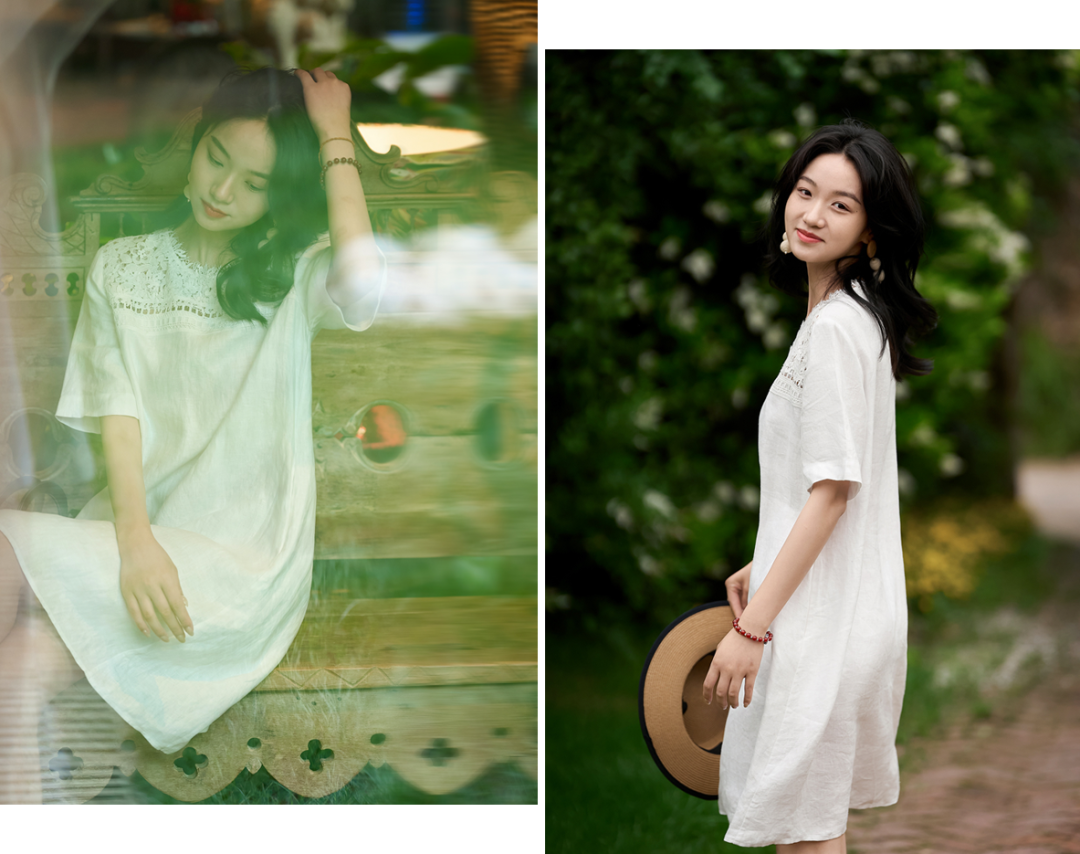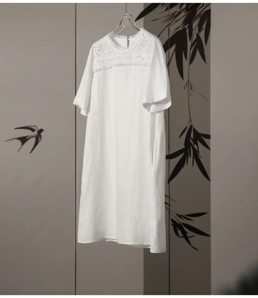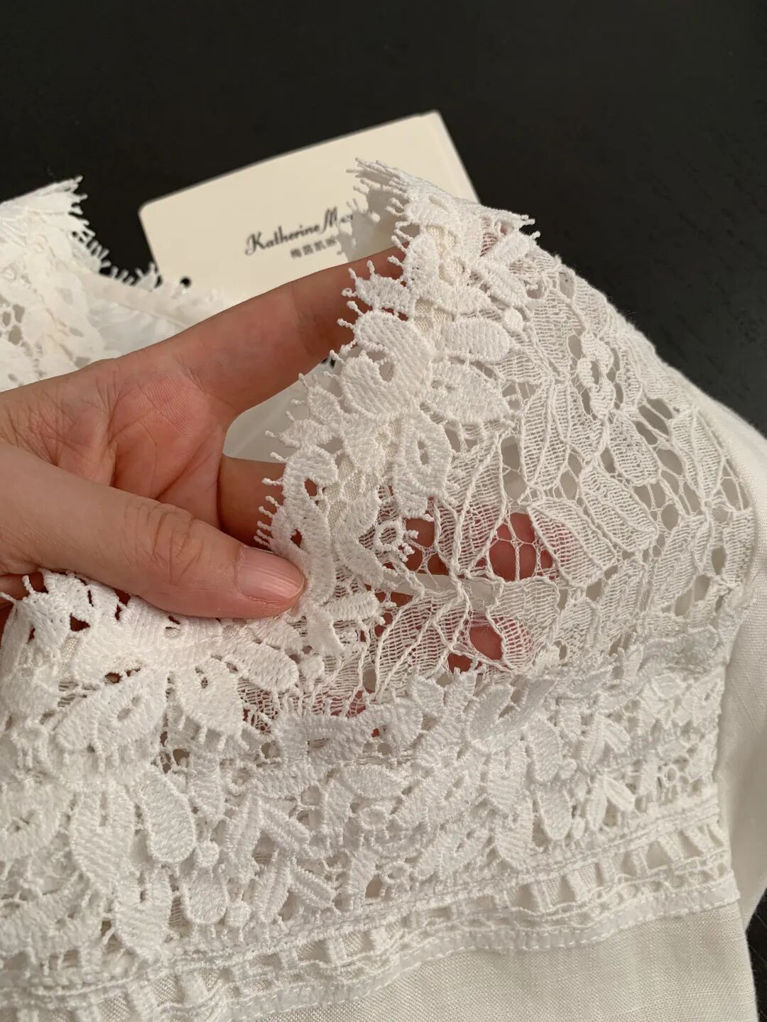 品牌:梅茵凯琳Meline Kaylin 品名:「一生浮梦」亚麻天丝系列 款式一:重工蕾丝亚麻天丝连衣裙 面料:70%亚麻、1.2%桑蚕丝、28.8%莱赛尔天丝 颜色:月光白 尺码:M、L、XL