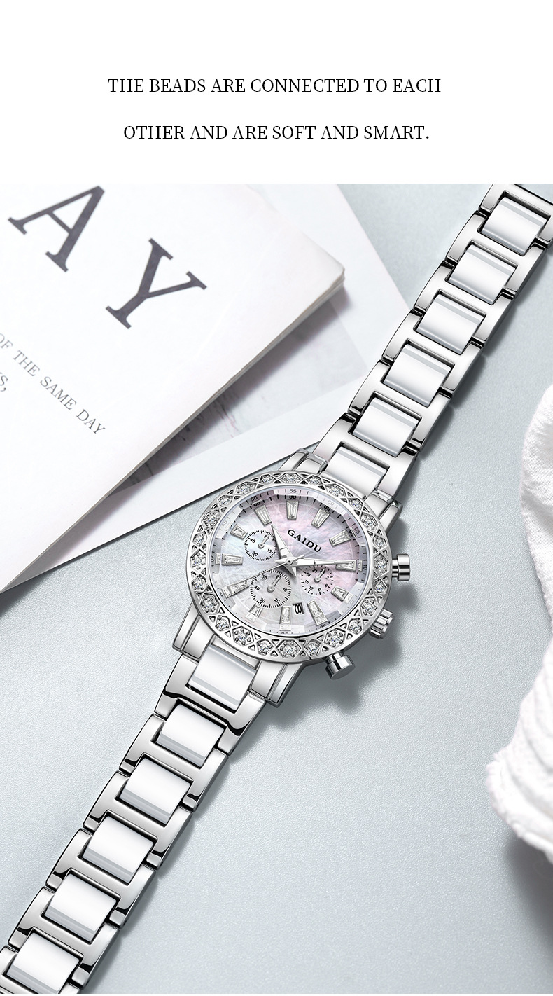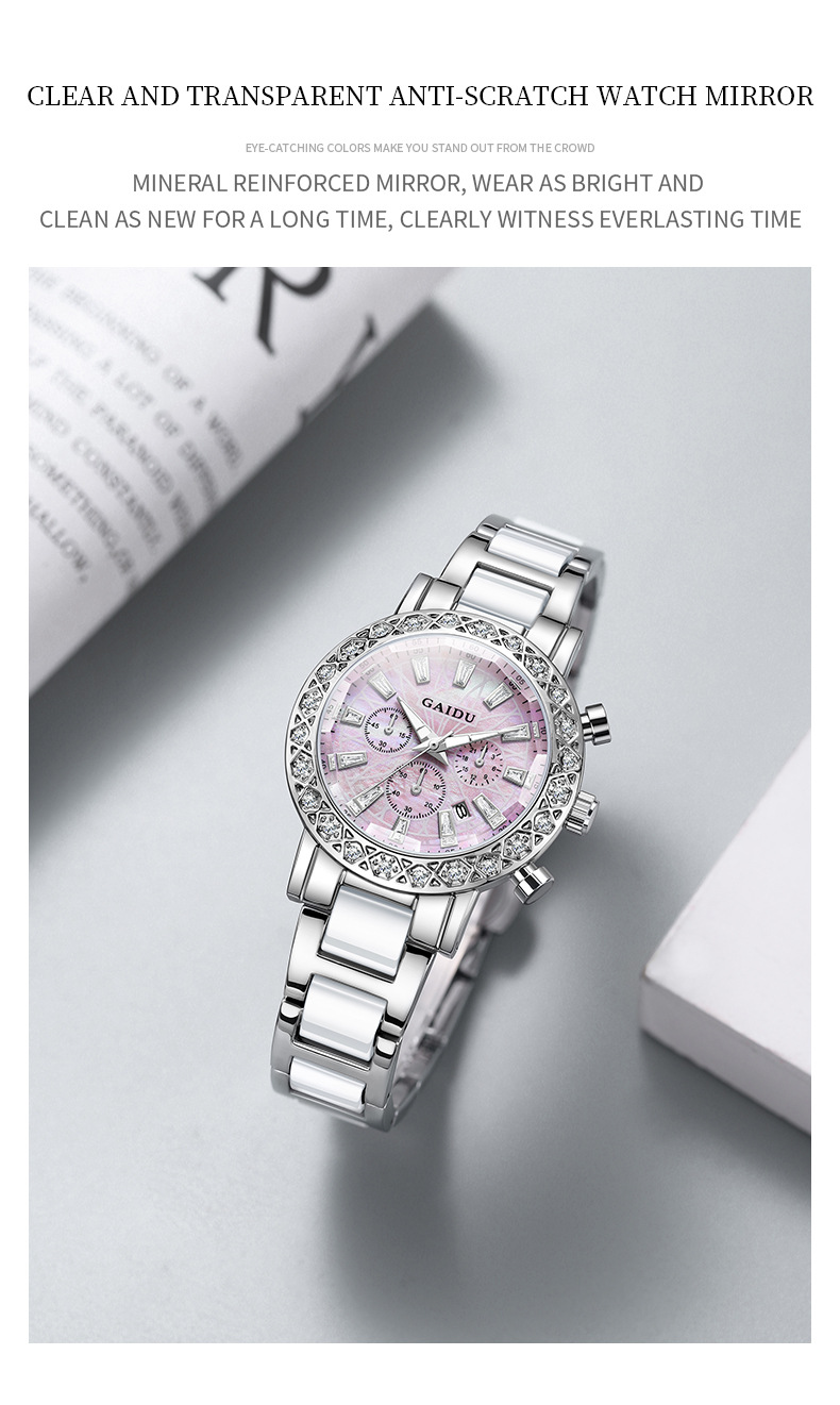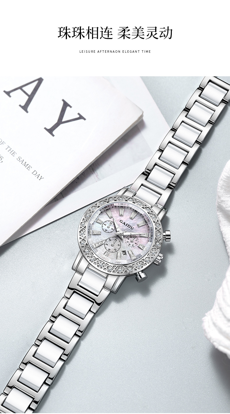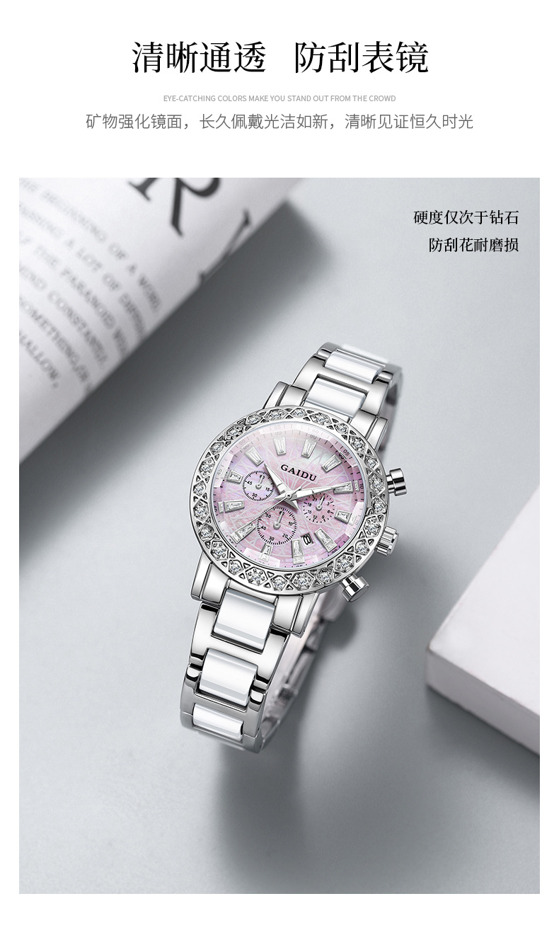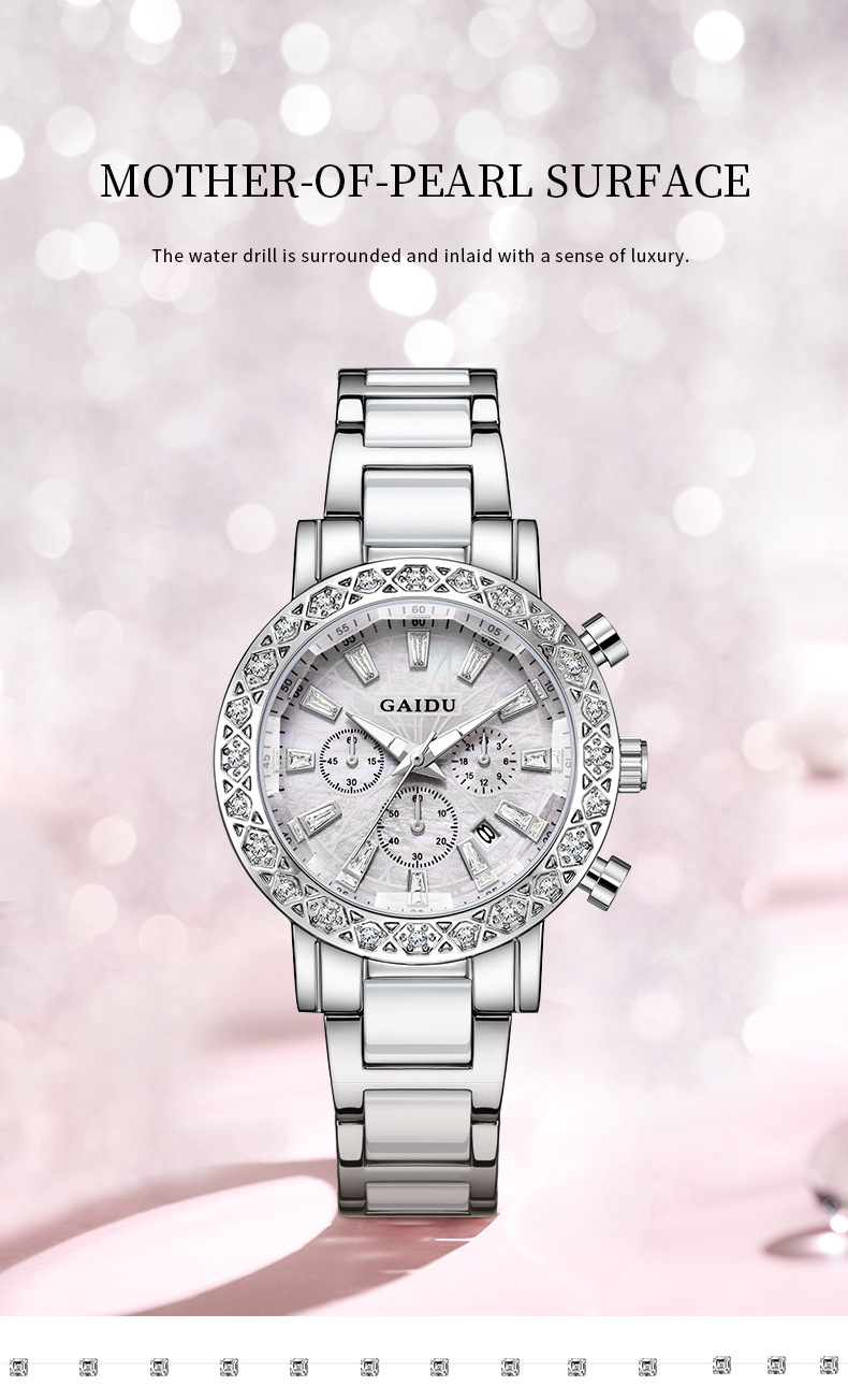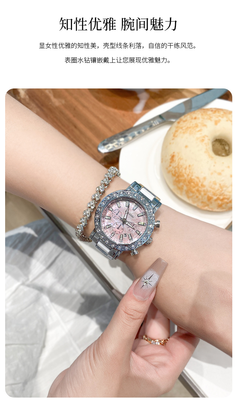 【知性优雅❗️夜光贝母石英女表】水钻环绕镶嵌,自带轻奢感,清晰通透防刮表镜,巧妙点缀日常穿搭,爆款时尚表圆形镶钻日历陶瓷腕表情人节礼物QQ