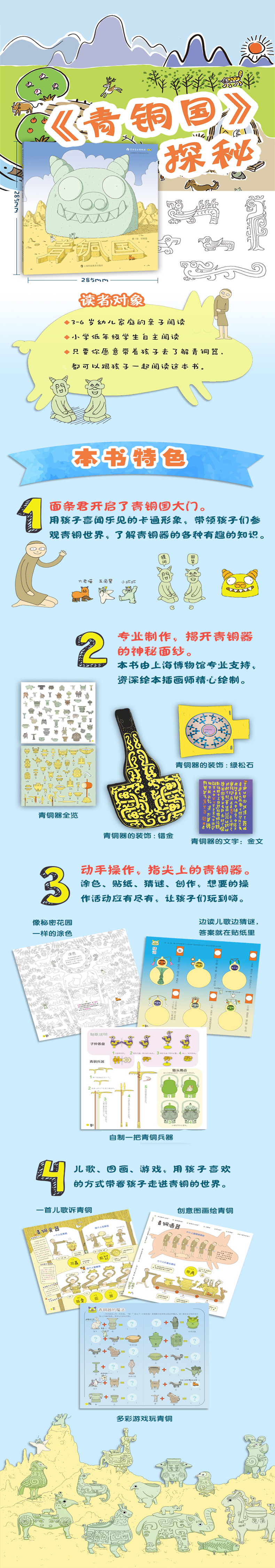 本书是根据上海博物馆最重要的馆藏青铜馆的藏品内容,为幼儿园至小学低年级儿童量身定制的亲子知识读本和文物游戏书。书中既有文化、历史拓展知识,又有贴纸、拼图等各类游戏,帮助家长和孩子深入了解博物馆的珍贵文物。