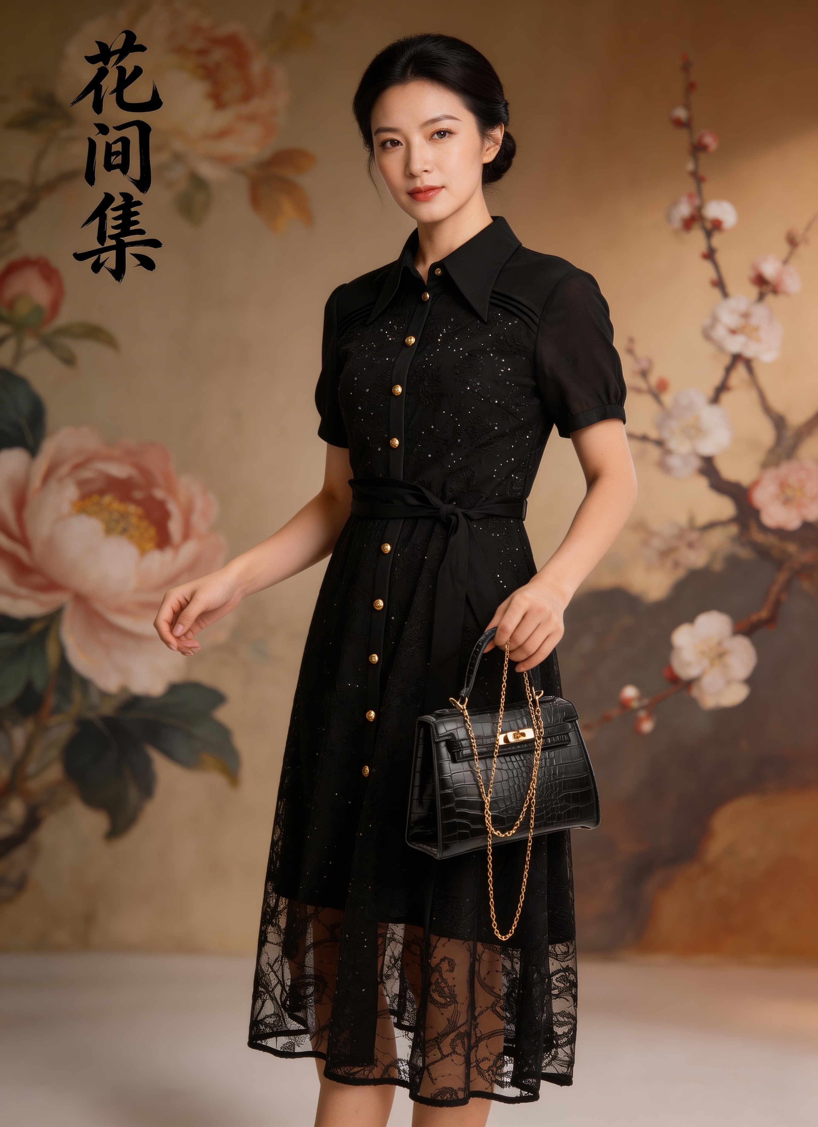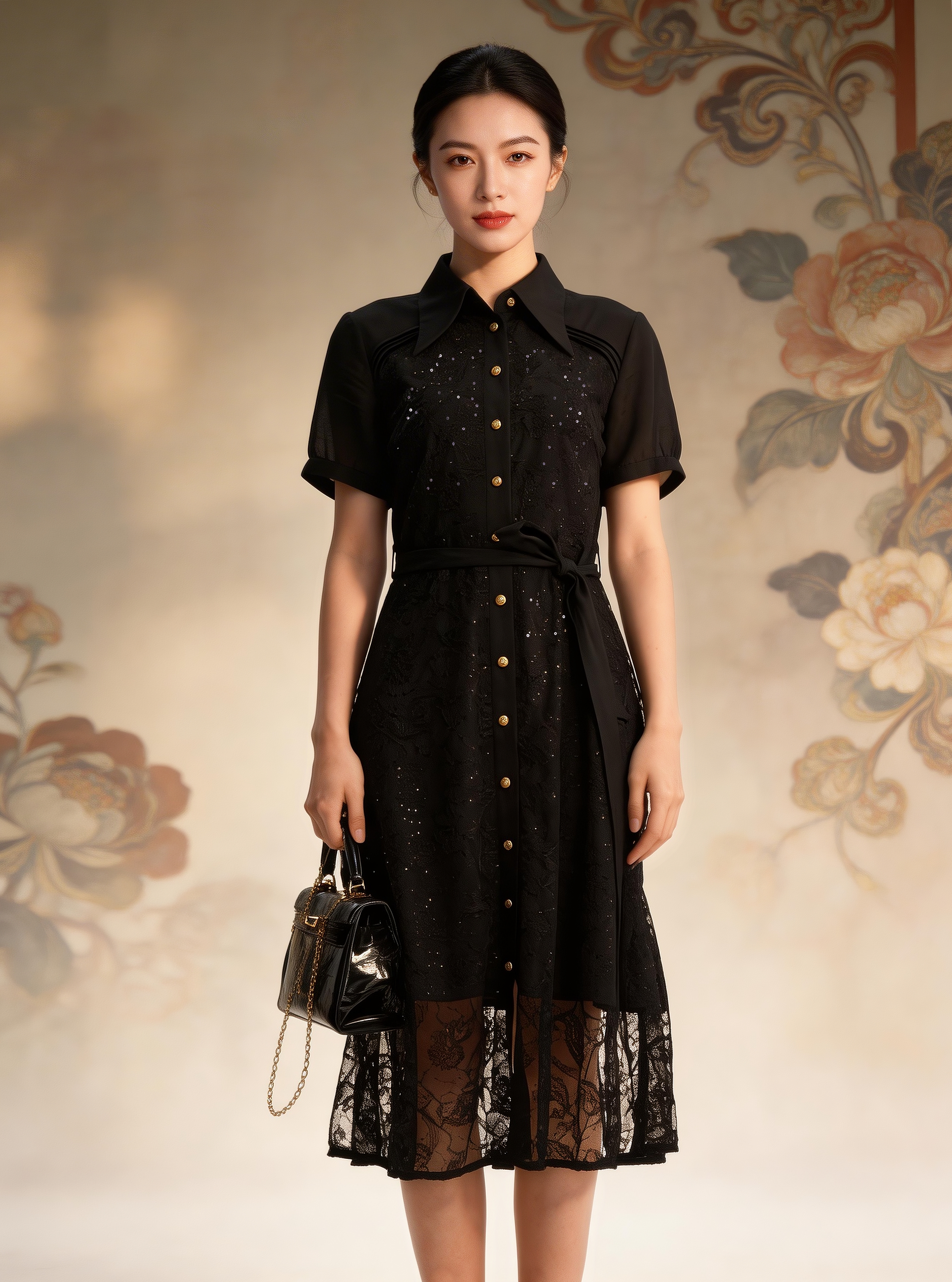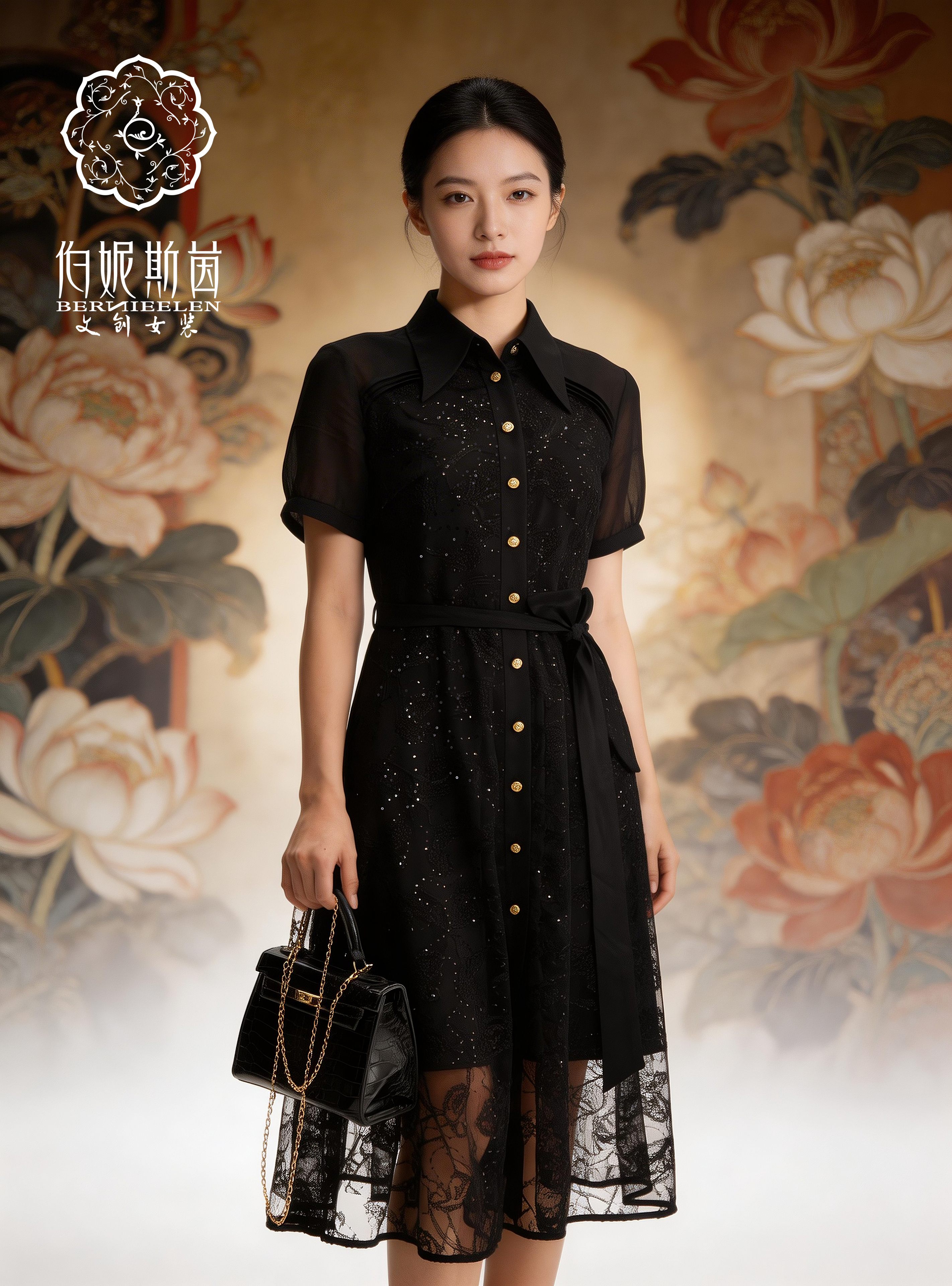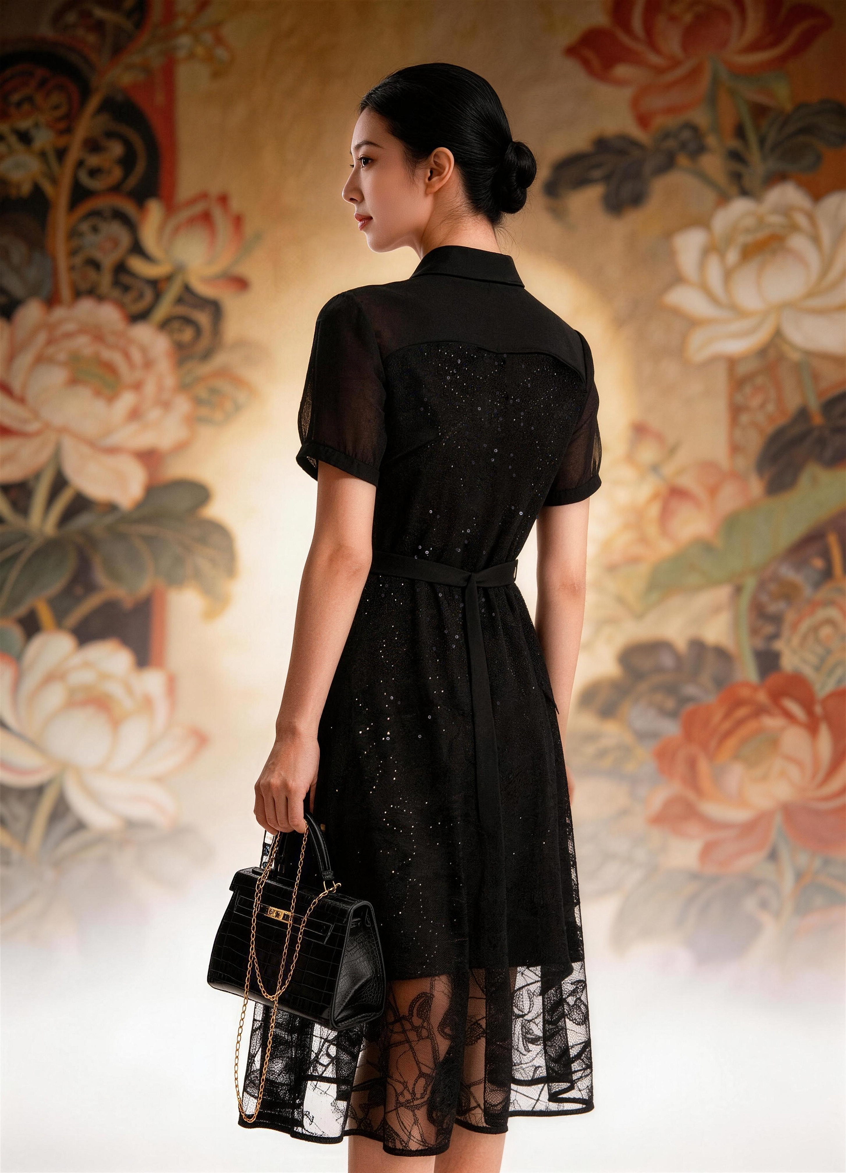HJ2S41_黑色_连衣裙_四季_优雅复古金扣蕾丝网纱衬衫领收腰系带 A 字中裙_高级女装_BERNIEELEN 伯妮斯茵