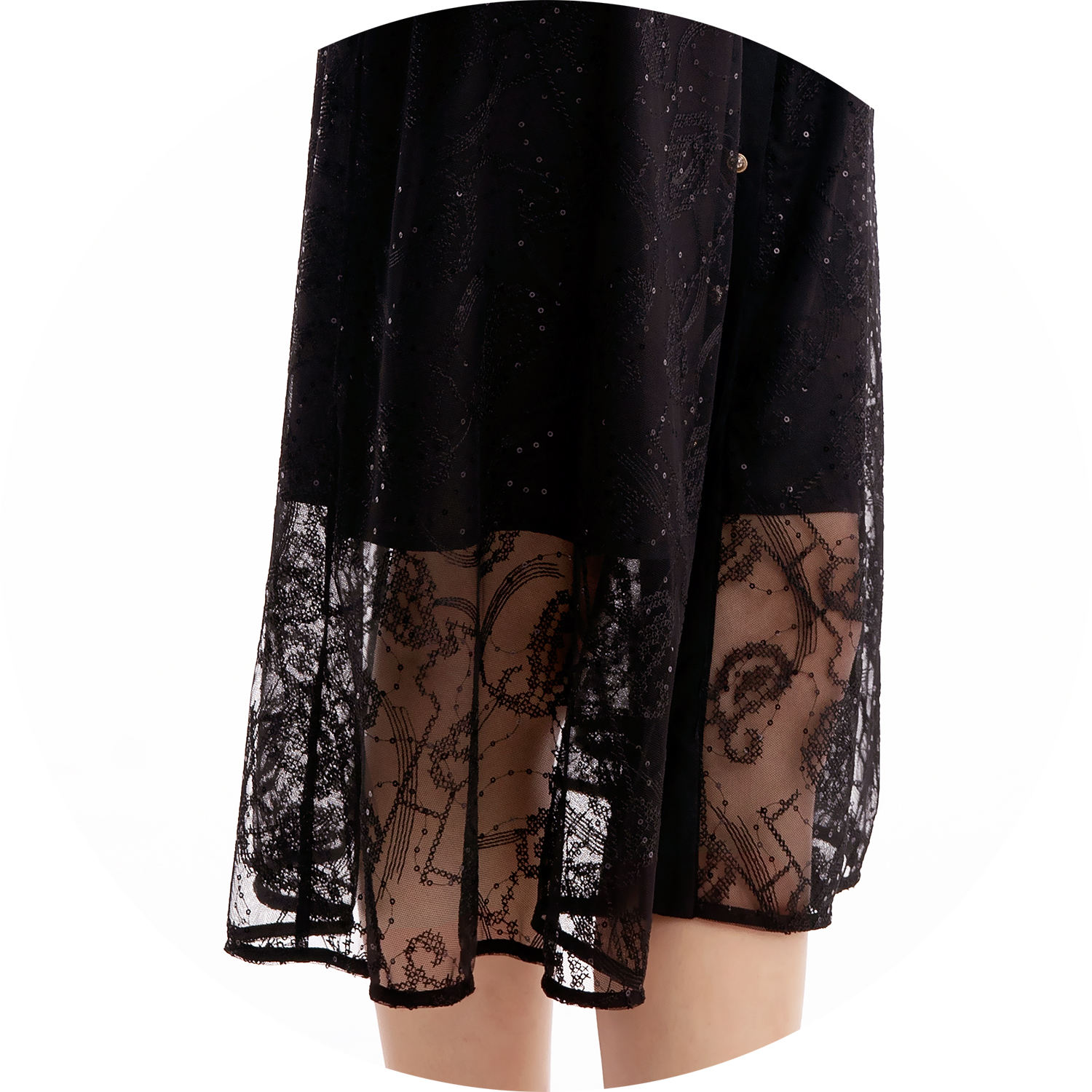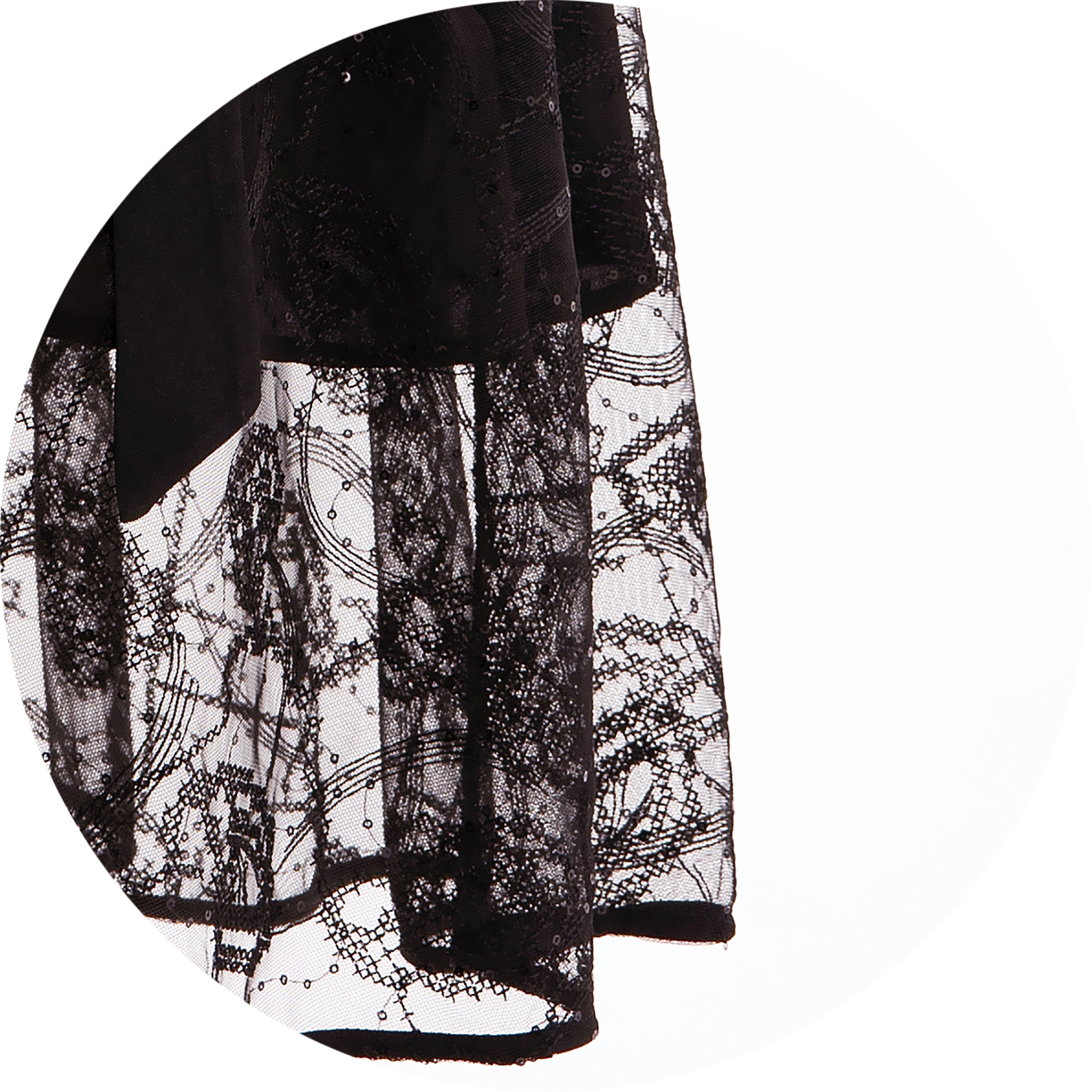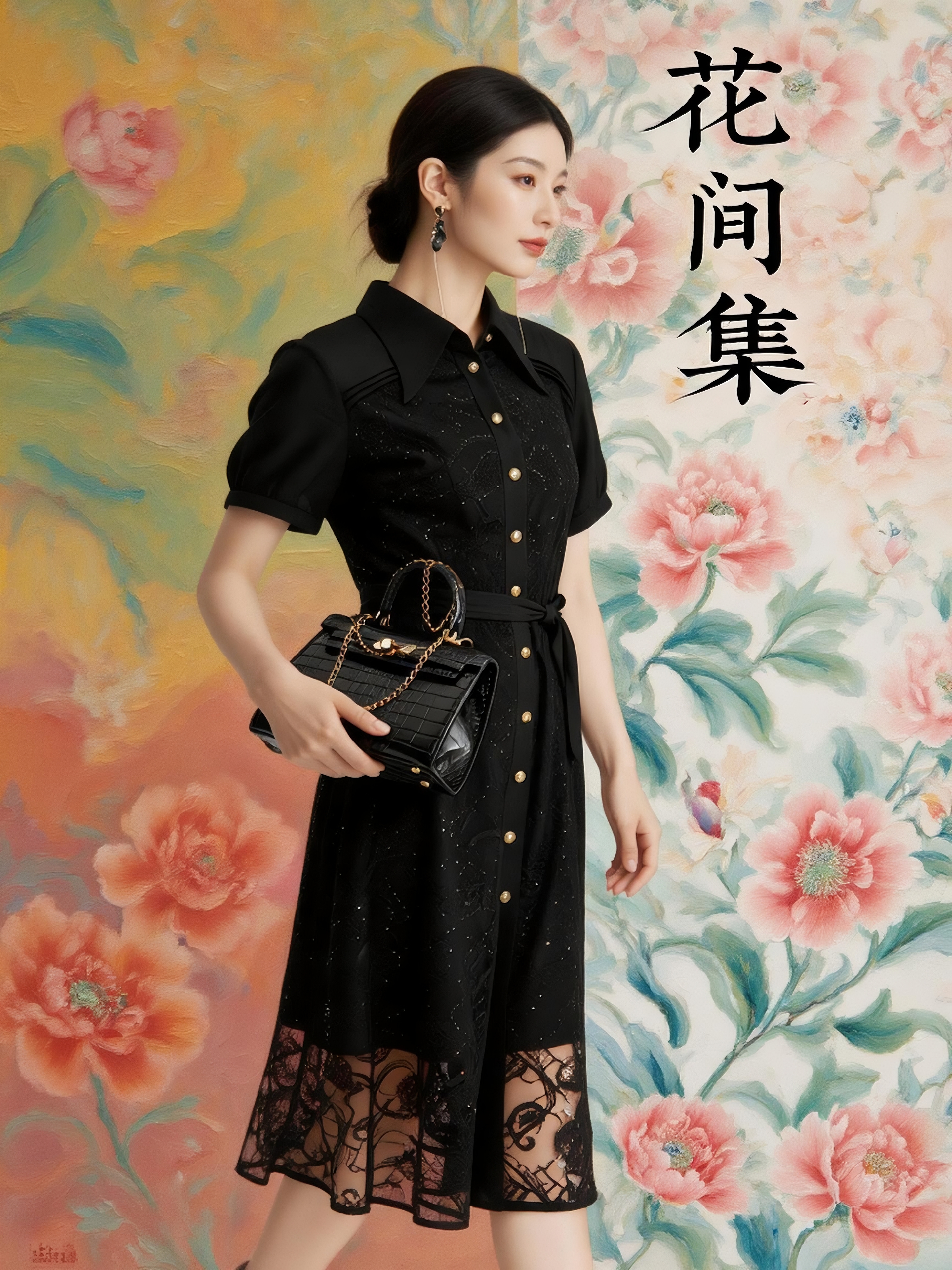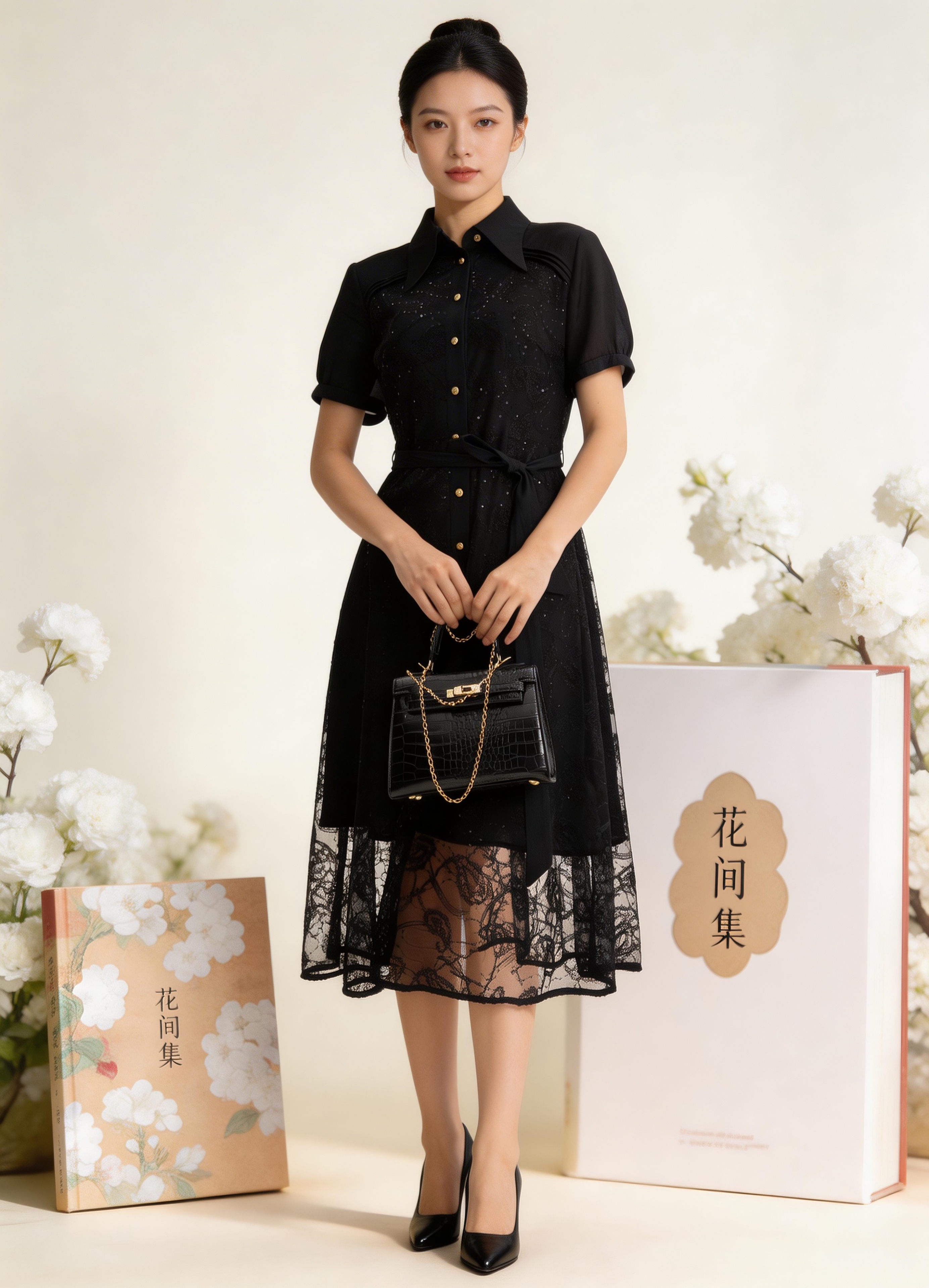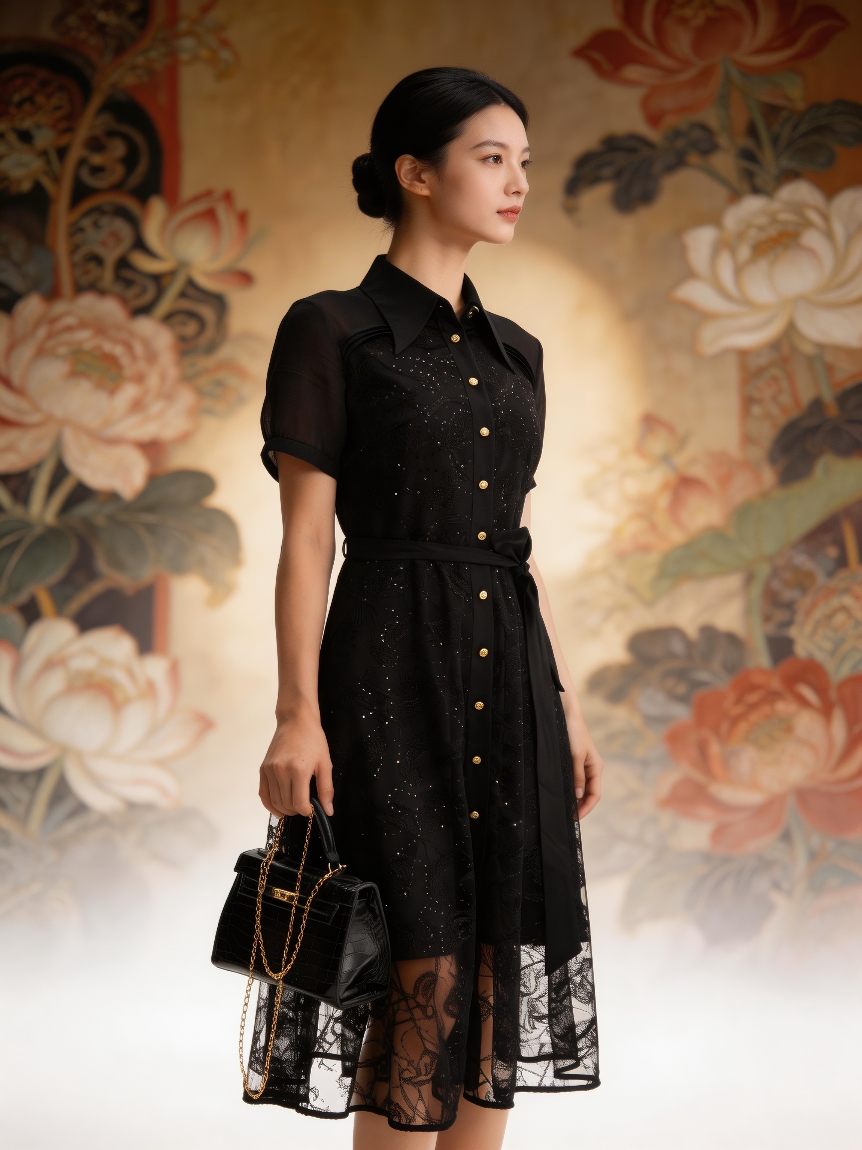 HJ2S41_黑色_连衣裙_四季_优雅复古金扣蕾丝网纱衬衫领收腰系带 A 字中裙_高级女装_BERNIEELEN 伯妮斯茵