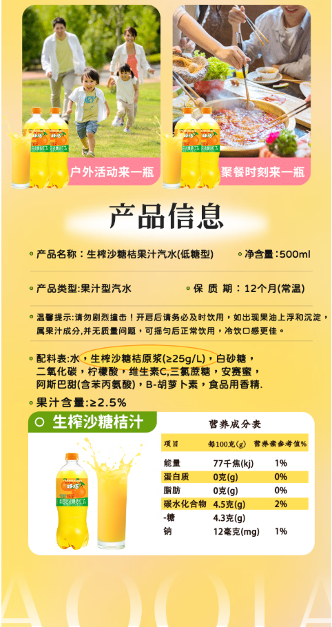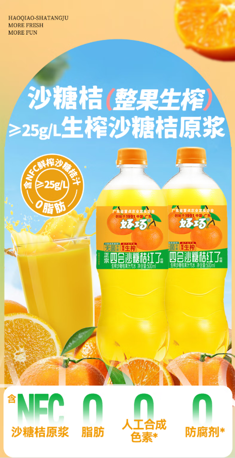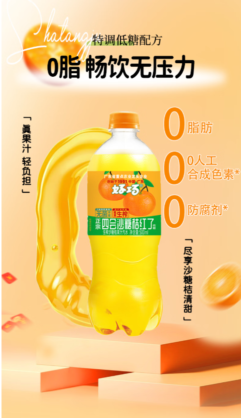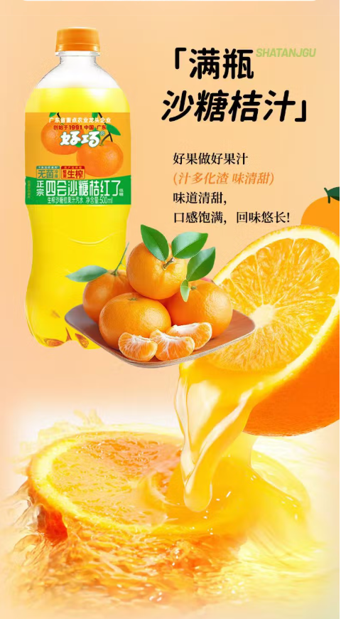 好巧四会沙糖桔红了沙糖桔汁汽水低糖型500ml*15瓶