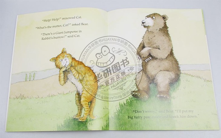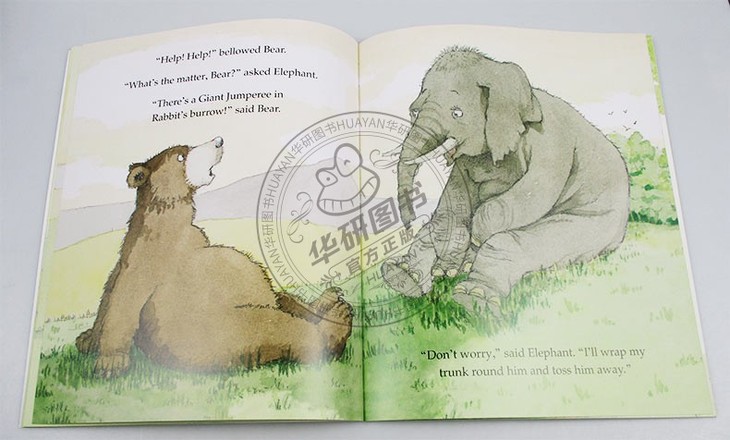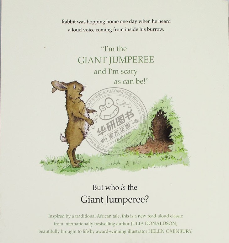 Rabbit arrives home one day to hear a strange voice coming from inside his burrow. “I’m the GIANT JUMPEREE and I’m scary as can be!” shouts the stranger. Alarmed, Rabbit runs off to find his neighbor Cat to get rid of the unwelcome guest. But when Cat approaches the burrow, the Jumperee scares her off too. Soon, the whole neighborhood has tried to help, but Rabbit, Cat, Bear, and Elephant are no match for the Giant Jumperee. When Mama Frog arrives, though, she knows just what to do—and the animals are in for a big surprise .....